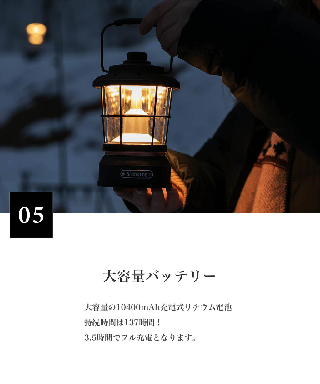 本產品是一款仿照燈油燈設計的復古經典風格LED燈籠。使用旋轉開關可切換兩種顏色的燈光,並可調節亮度。色溫範圍為2000-2700K。
