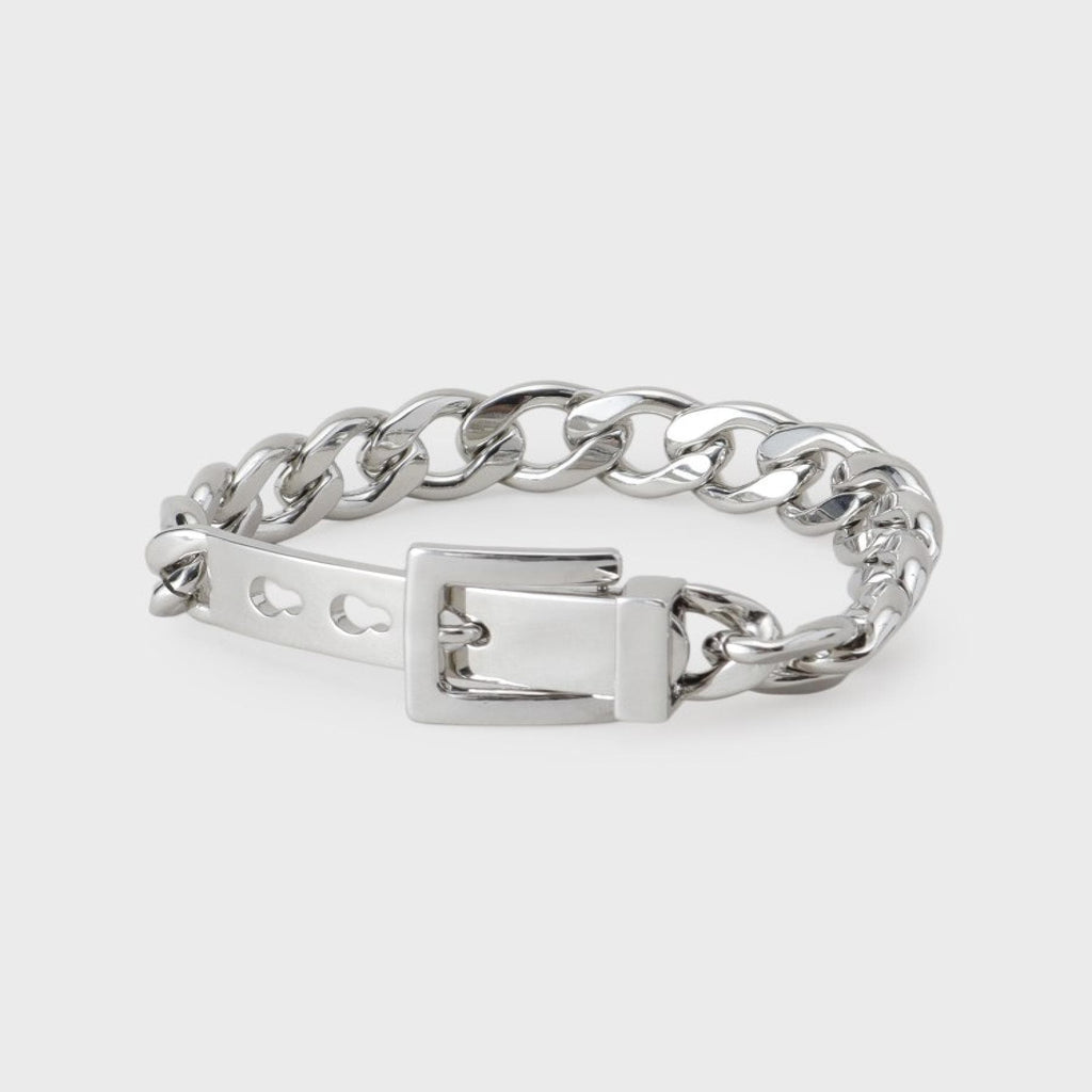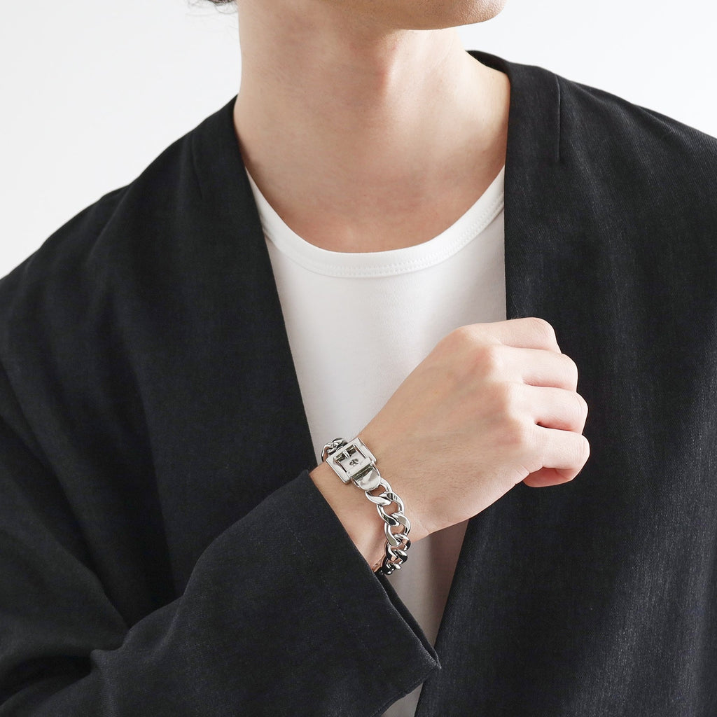 金屬手鐲的同時,具有「扣環」和「皮帶孔零件」的精巧設計是亮點。