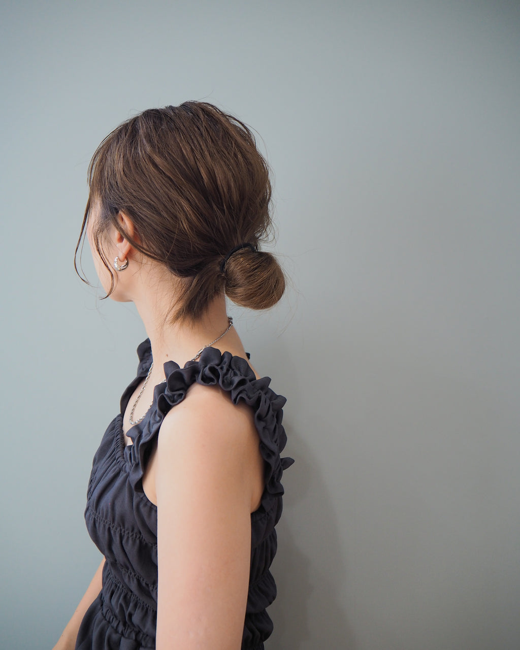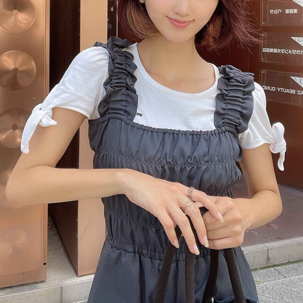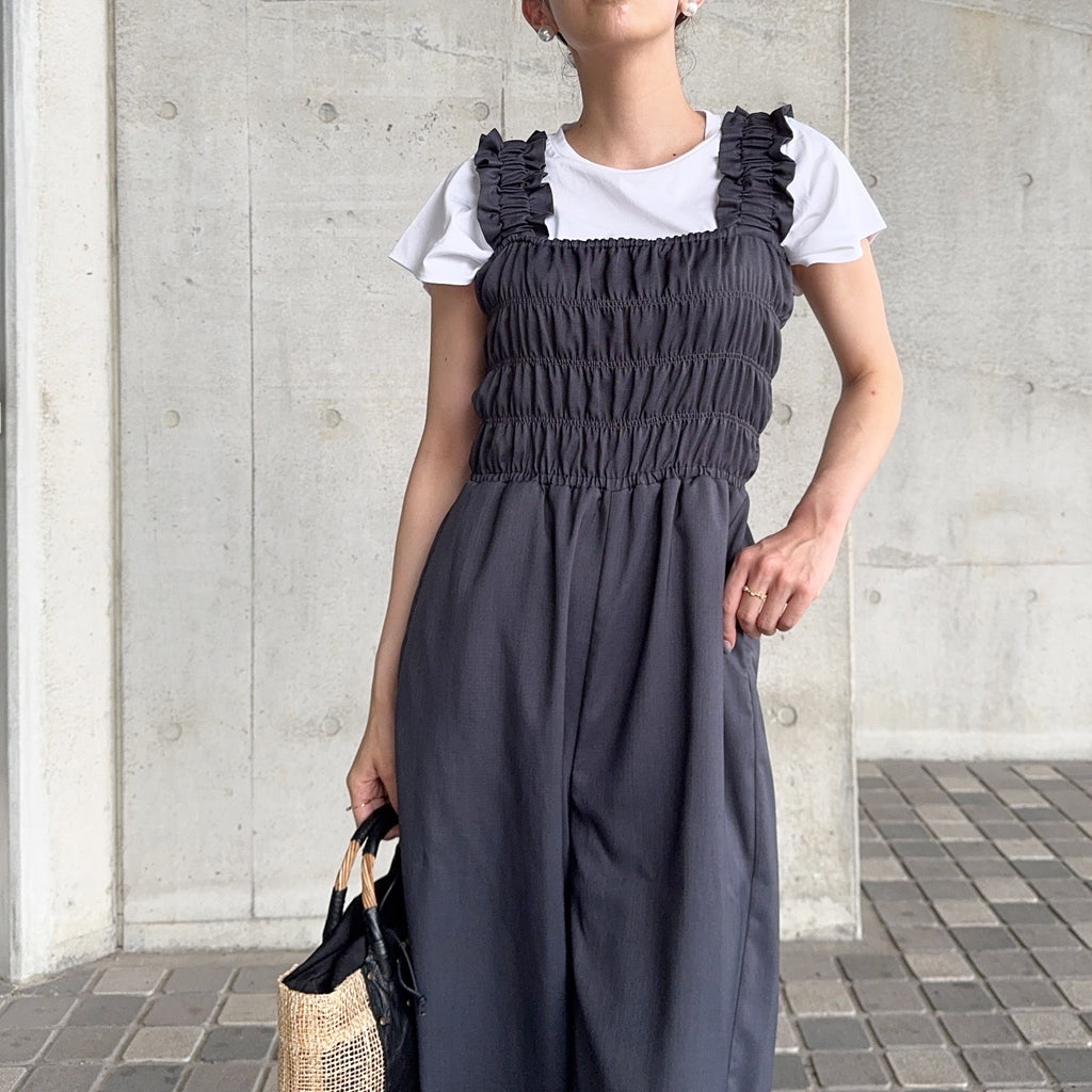 肩帶和身體部分採用豐富的シャーリング設計,是成熟女性款式的吊帶褲的亮點。