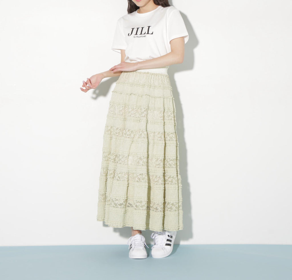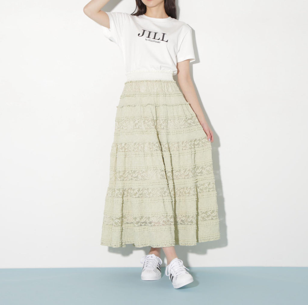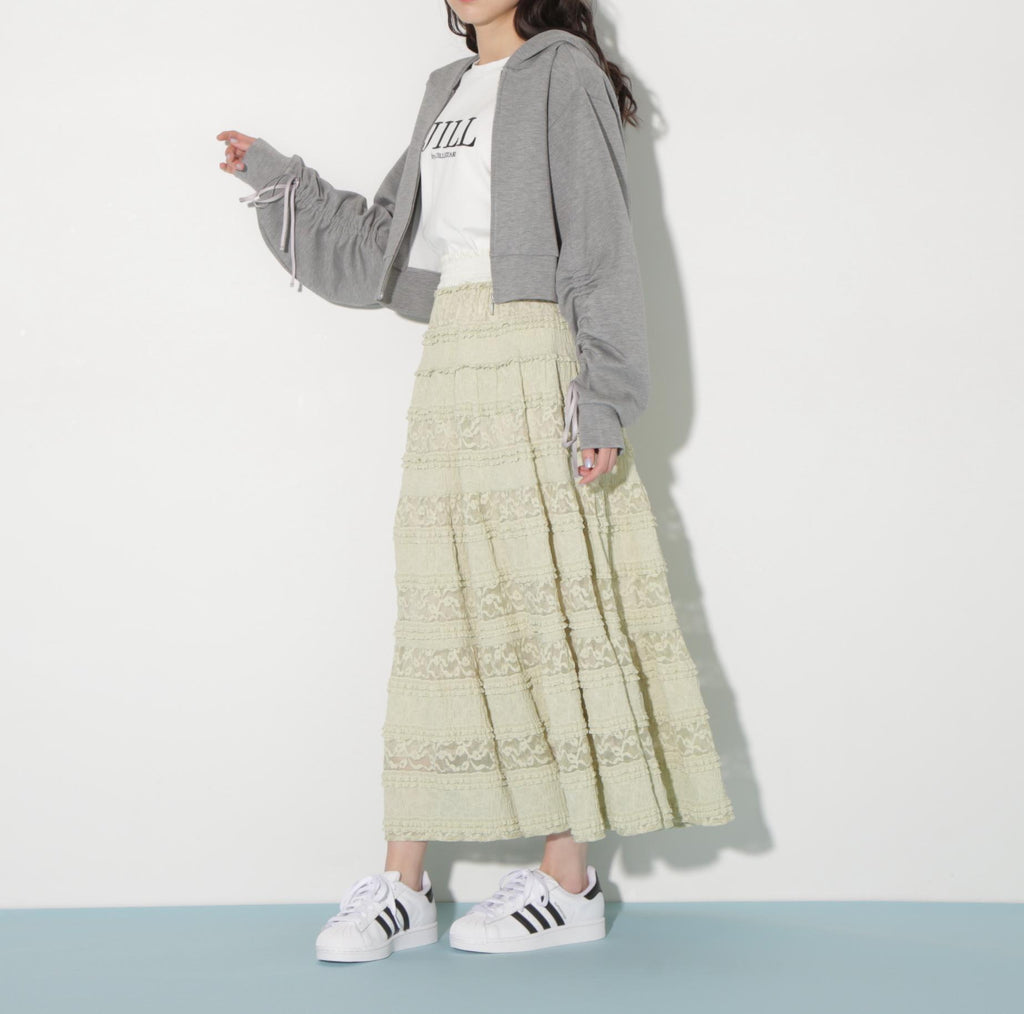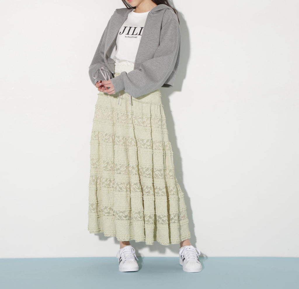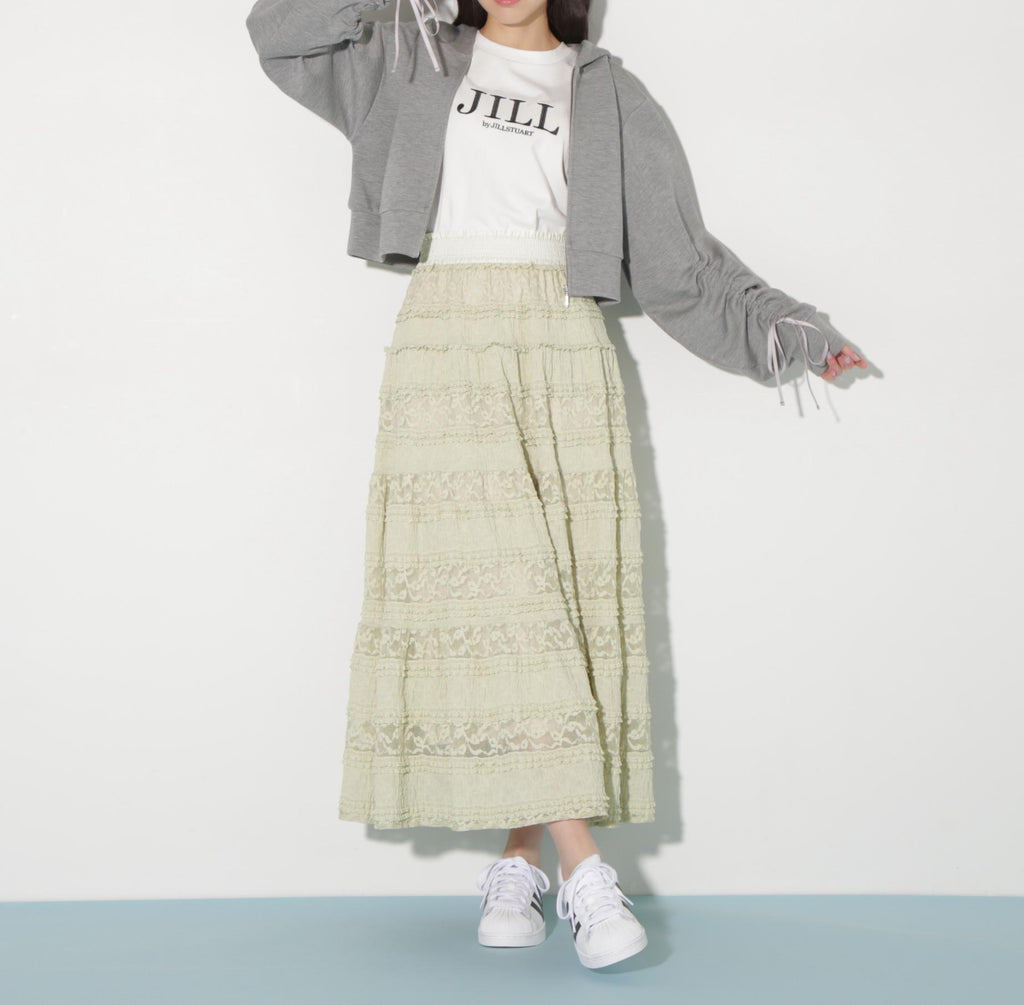 使用具有彈性的蕾絲材質製成的層疊裙。今年的潮流是使用階梯式荷葉邊的布料。蕾絲與荷葉邊的組合營造出層疊輪廓。腰圍採用不同材質的緞面鬆緊帶,兼具穿著舒適與高端感的設計。建議搭配T恤、連帽衫或簡約針織衫。※由於拍攝時的照明原因,顏色可能會有所不同。