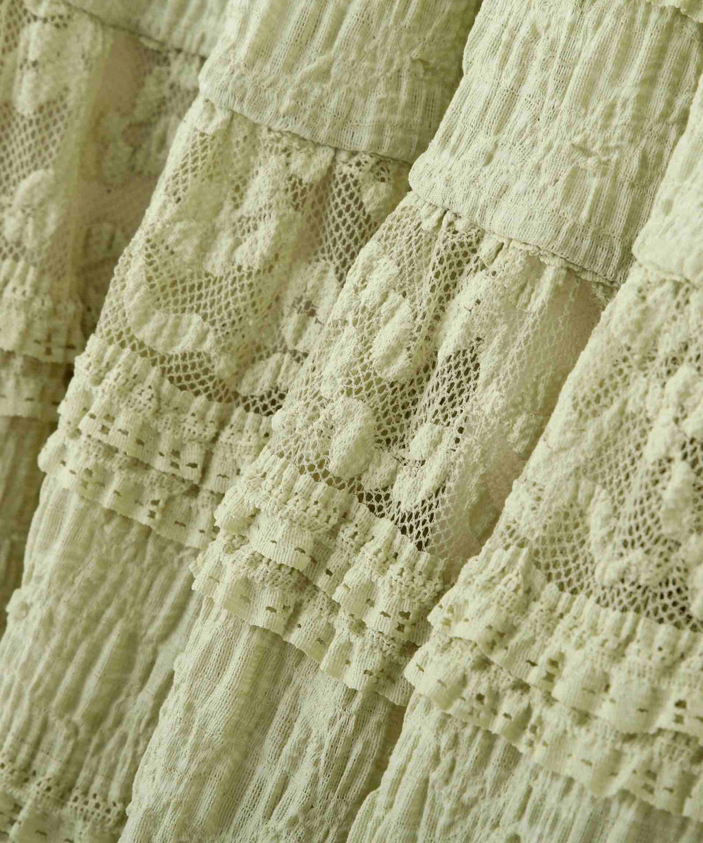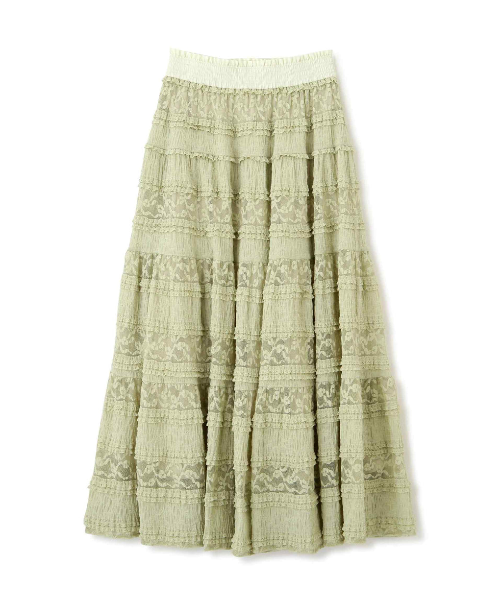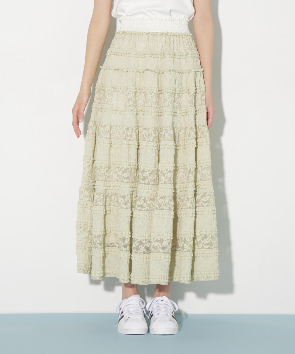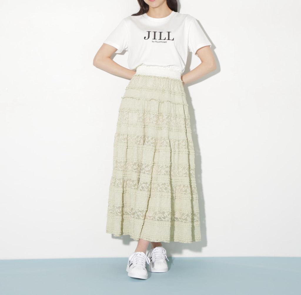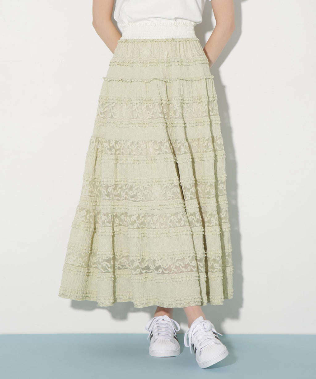 使用具有彈性的蕾絲材質製成的層疊裙。今年的潮流是使用階梯式荷葉邊的布料。蕾絲與荷葉邊的組合營造出層疊輪廓。腰圍採用不同材質的緞面鬆緊帶,兼具穿著舒適與高端感的設計。建議搭配T恤、連帽衫或簡約針織衫。※由於拍攝時的照明原因,顏色可能會有所不同。