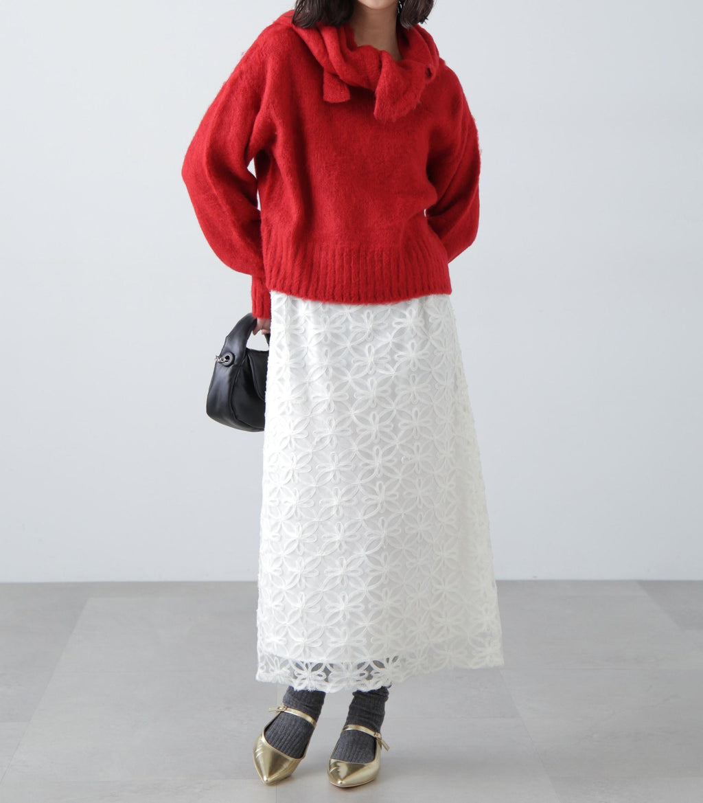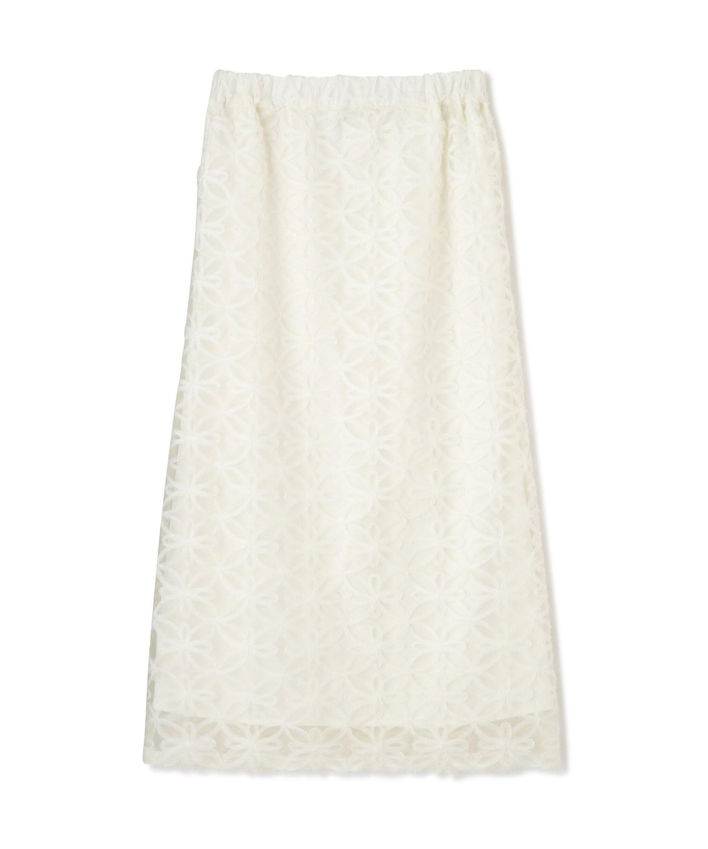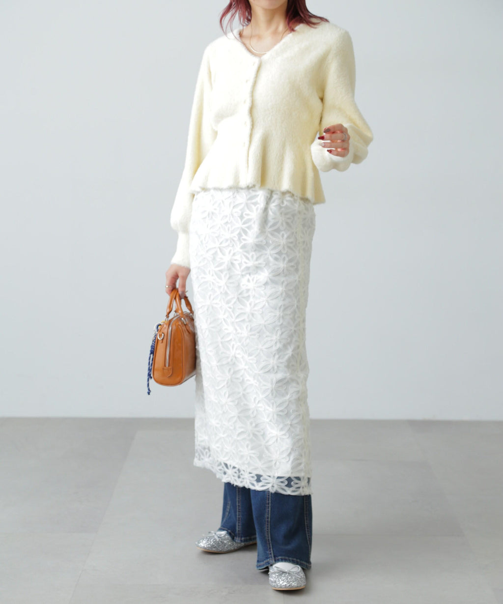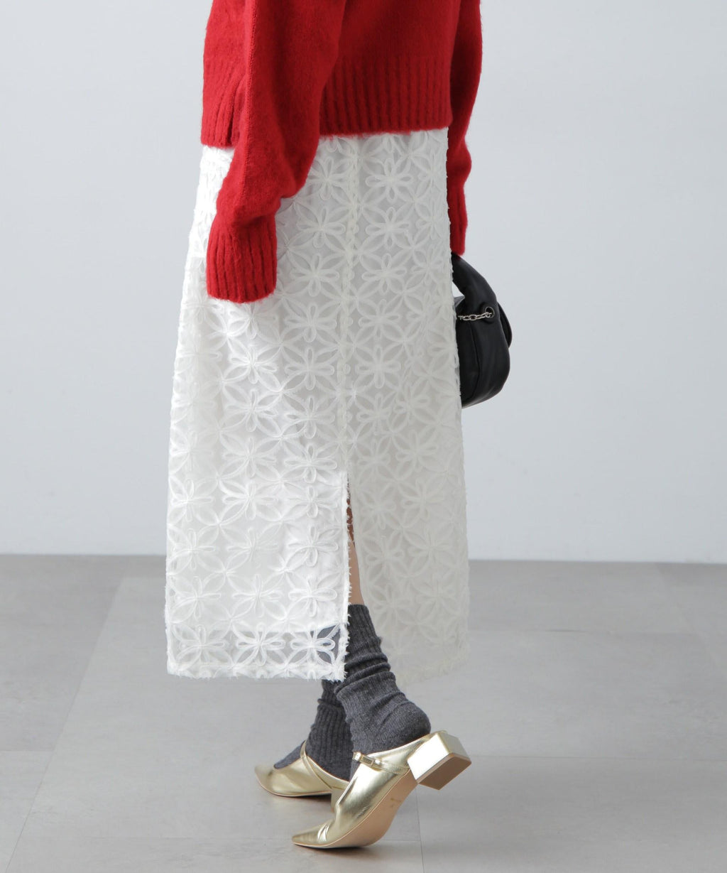 蕾絲上點綴立體花朵造型的窄裙,花朵採用幾何圖案風格,不會過於甜美,亦能融入休閒搭配。前腰圍採用內裡設計,線條簡潔。後方設有中心開衩,方便行走◎。由於採用透氣的薄紗材質,內裡為緞面布料,不易透光,讓人安心。細身的窄裙剪裁,建議搭配寬鬆的運動衫或毛衣!只需搭配簡單的上衣,也能展現華麗的造型。
