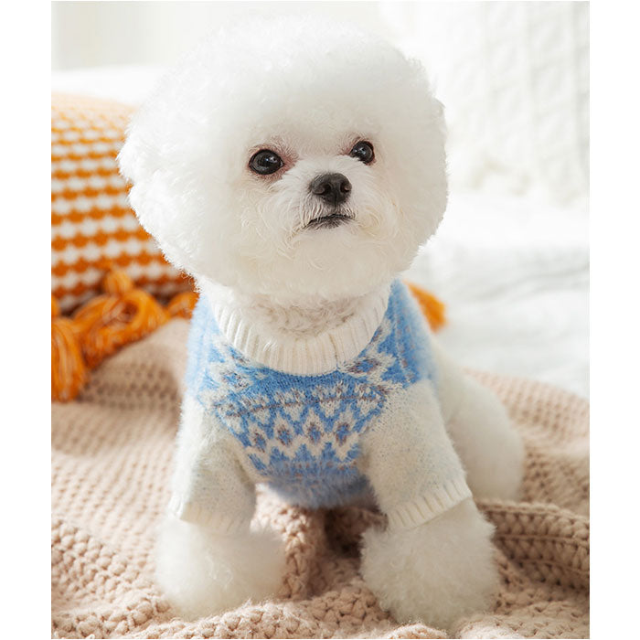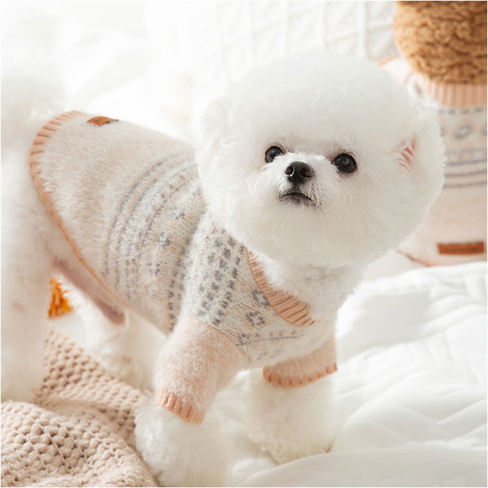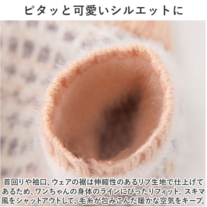 羽毛のような優しい肌触りで、温もりあふれる秋冬コーデを実現!真冬のお散歩もぽかぽか快適「ノルディック柄 ペット用ニットセーター」が新登場。【ふんわり着せて、優しく防寒】細めの毛糸をギュッと目を詰めて丁寧に編みこんで仕上げた、ワンちゃん・ネコちゃんも着用できるふんわりニットセーター。ぽかぽかの着心地で、しんしんと冷える寒い日や雪の降る日だって安心。【お散歩前に楽ちんお着替え】首回りやお腹周りのリブをぐーんと伸ばしたら、ペットの頭にすっぽりと被せて、両前足を優しく袖に通してあげるだけで着せ替えが簡単!お散歩前の準備がとってもスムーズ。【ピタッと可愛いシルエットに】首回りや袖口、ウェアの裾は伸縮性のあるリブ生地で仕上げてあるため、ワンちゃんの身体のラインにぴったりフィット。スキマ風をシャットアウトして、毛糸が包みこんだ暖かな空気をキープ。【おトイレ楽ちん・ゆったり設計】ワンちゃんがおトイレする時にもたつかない♪お腹周りやお尻が大きく開いたゆったりデザイン。【ピッタリサイズをチョイス!】XSサイズからXLサイズまでの5つのサイズから、ぴったりサイズがチョイス可能!超小型犬から、胴回り44cm程度までの小型~中型のワンちゃんに最適なサイズ感。小さなサイズはネコちゃんにもオススメ。【飼い主さんとリンクコーデ】長めの毛羽でシャギー感をだしたオフホワイトの編地に、ノルディック柄を優しく編み込んだオシャレなカラーバリエーション。飼い主さんのニットやセーターに合わせてコーディネートしても楽しい♪【ルームウェアにも◎】肌寒さが気になる季節のお散歩用ウェアとしてはもちろん、ルームウェアやパジャマとして、朝晩の冷え込み対策にもオススメ。