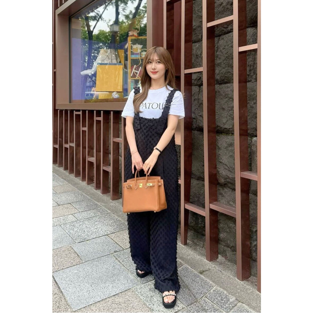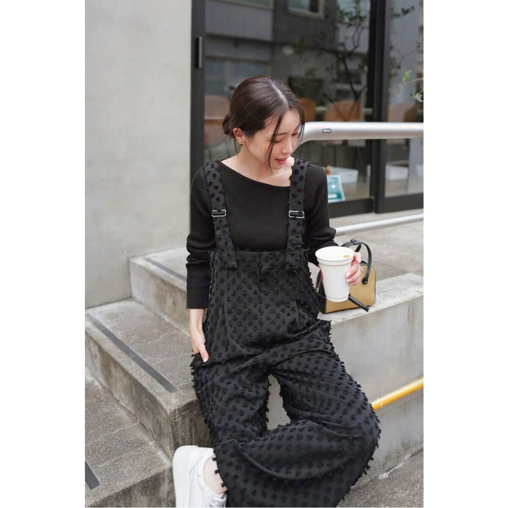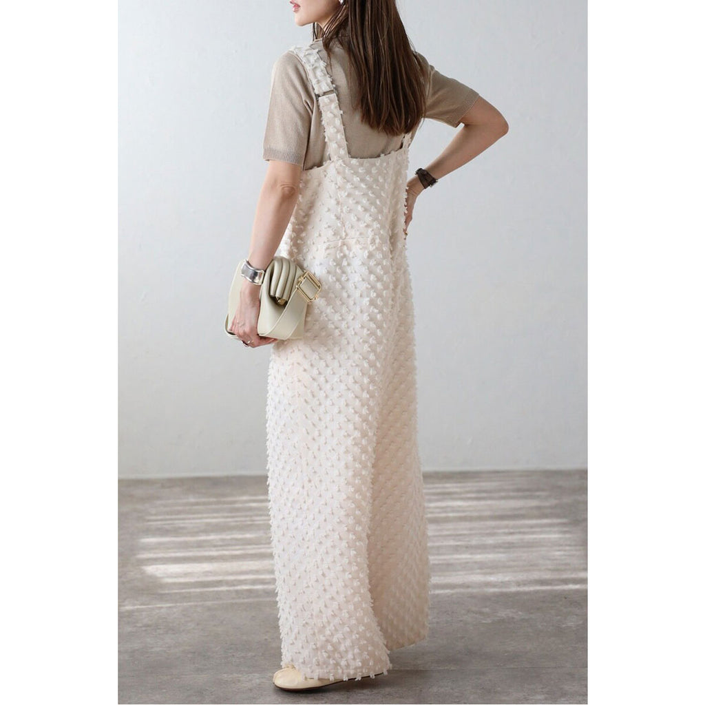 點點狀的提花織物以豐富的表情浮現,是一款具有出眾存在感的吊帶褲。
