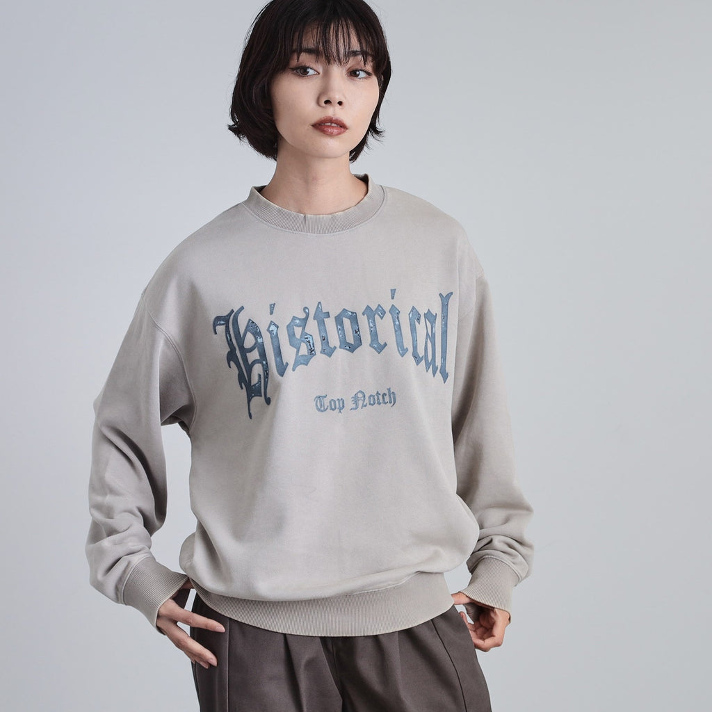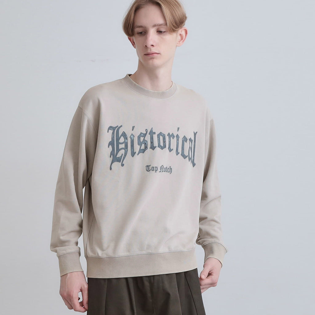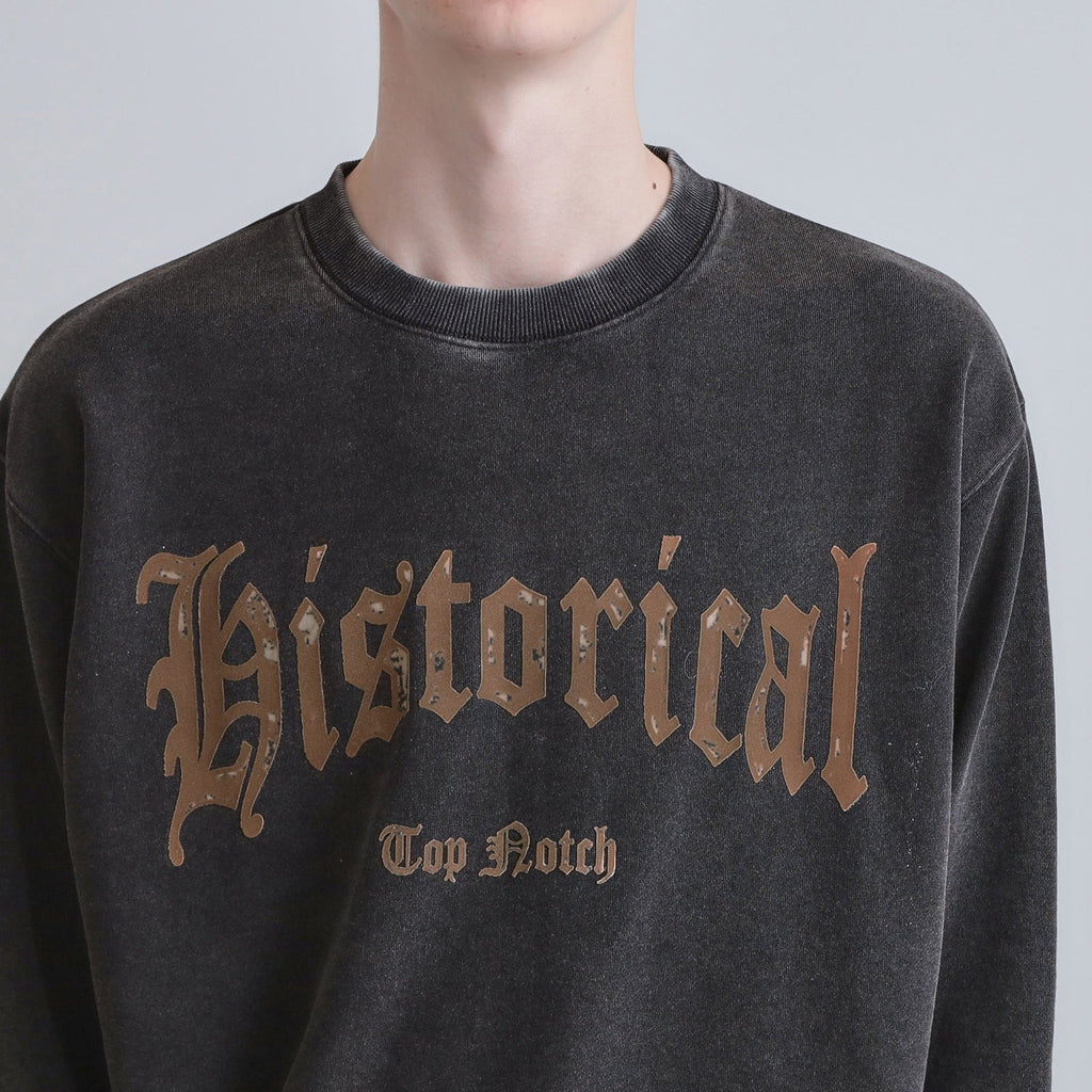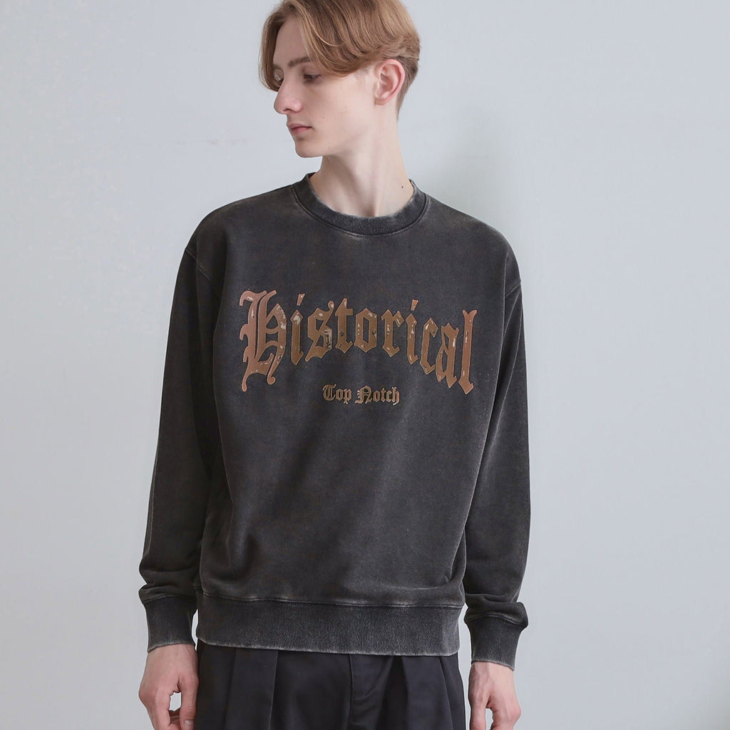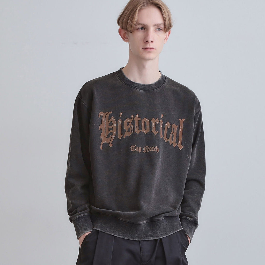 使用中等重量的裏毛布料,採用復古加工印花運動衫。