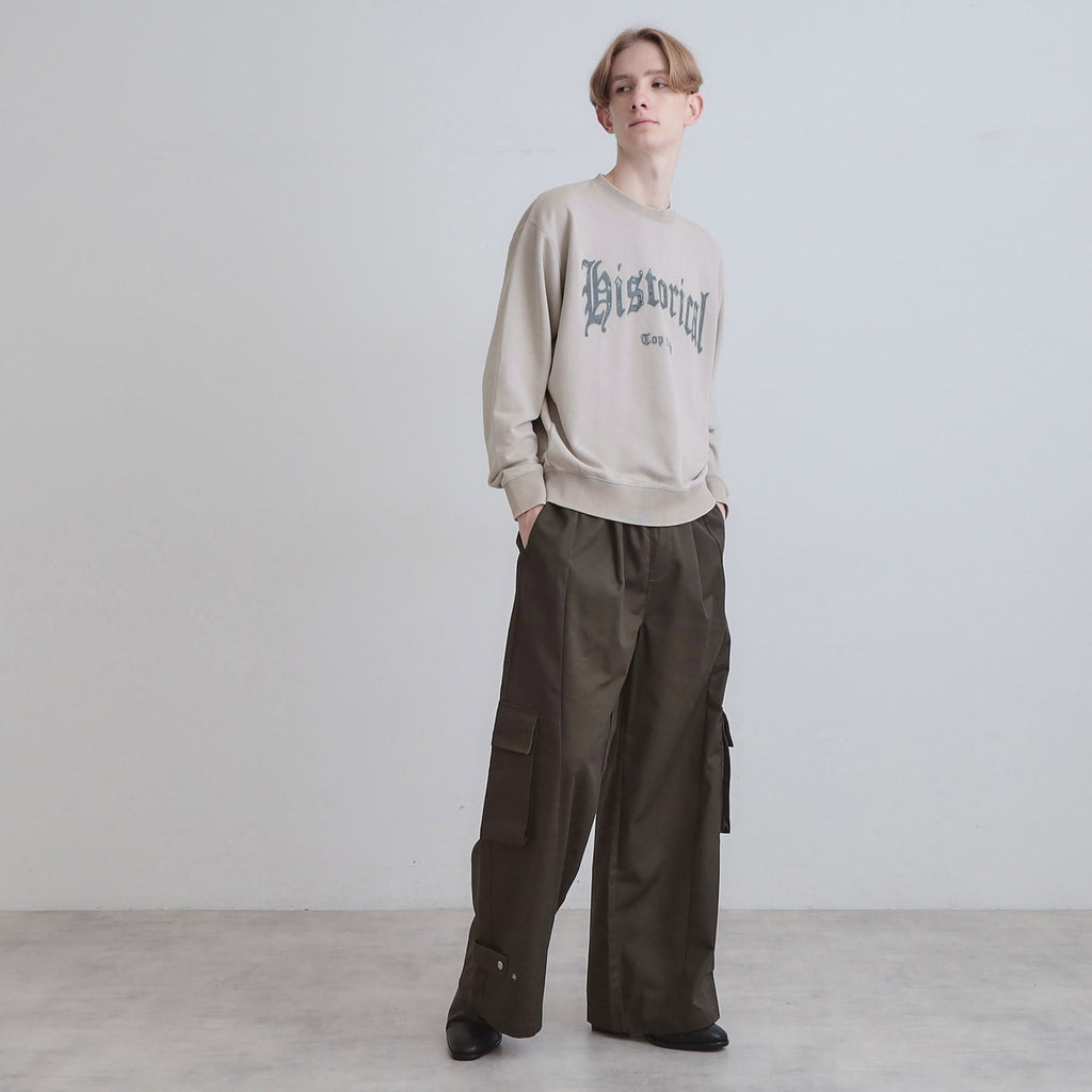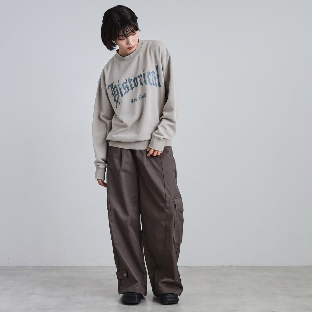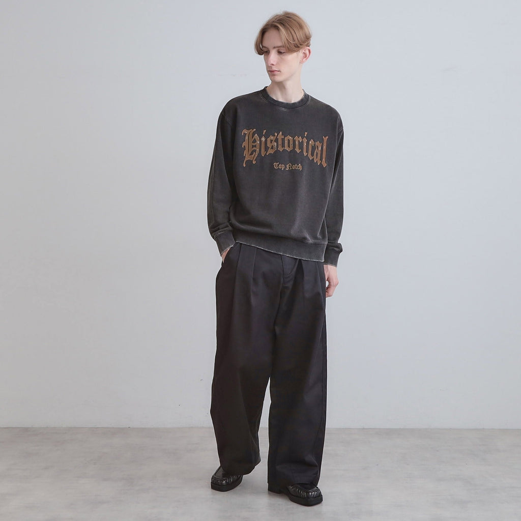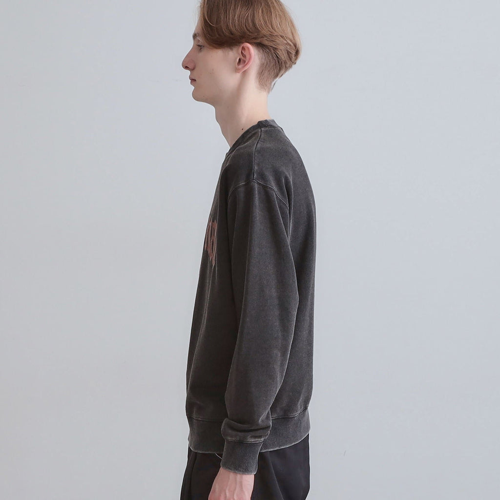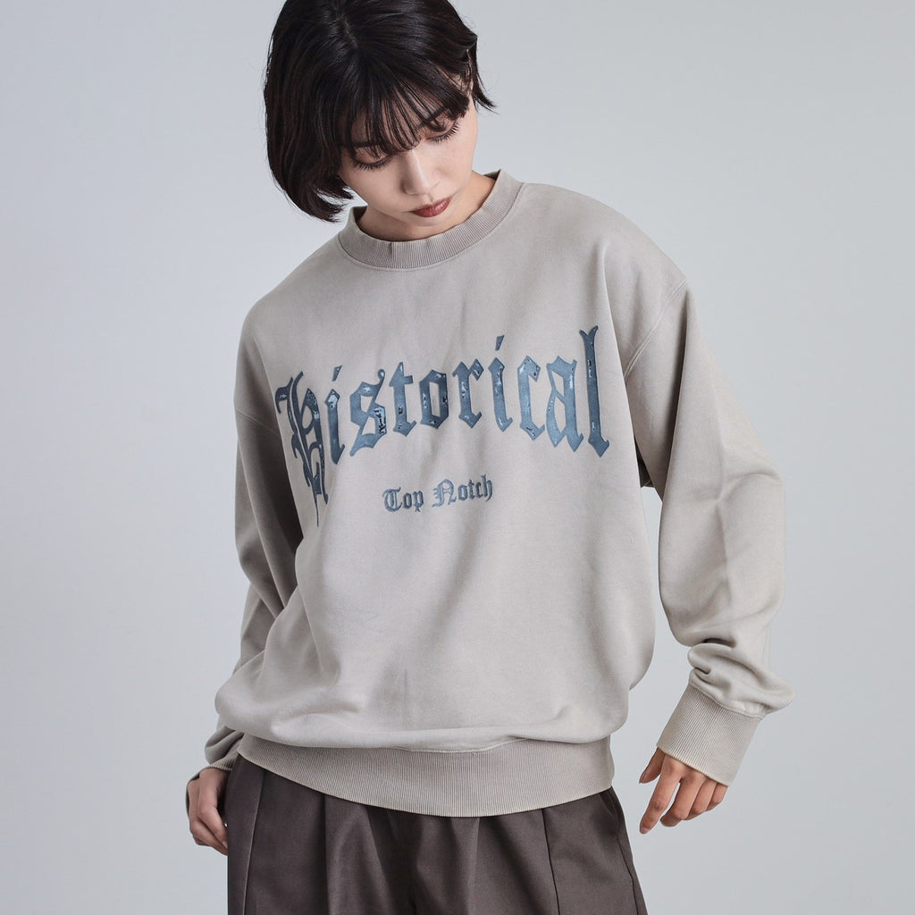 使用中等重量的裏毛布料,採用復古加工印花運動衫。