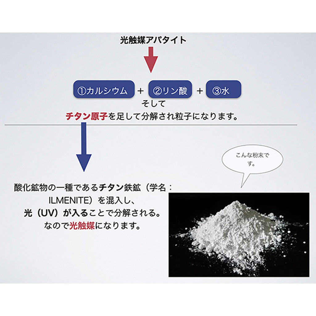 ・採用聚碳酸酯材料並加工光觸媒磷灰石,具有抗菌、除臭、抗病毒的效果,適用於冰箱用隔板・光觸媒是含有鈦的特殊化合物・1、抗菌・抗病毒・2、抗過敏原・3、除臭、消臭・4、漂白・5、對樹脂具有高抑制劣化的效果。・對細菌吸附並使其失活,塗布具有革命性的化學粉末。