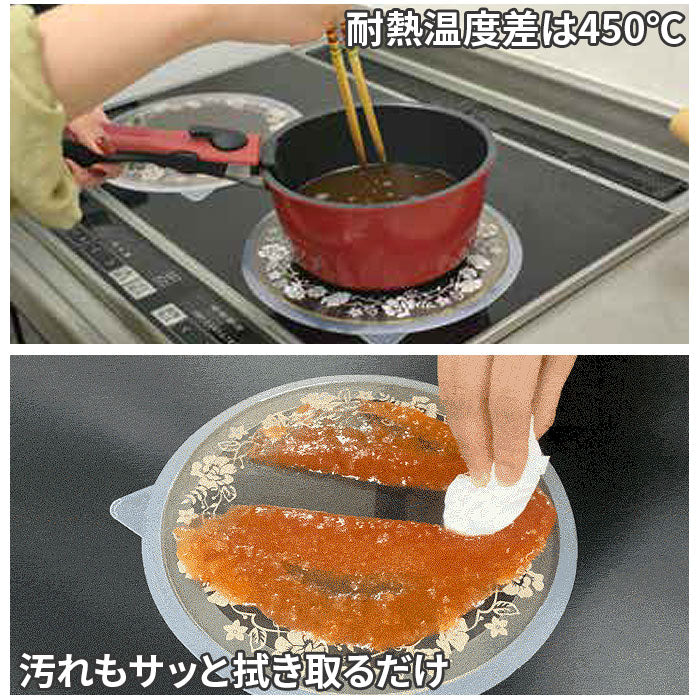 保護您珍貴的 IH 爐灶免遭燃燒和刮擦!推出易於清潔的 IH 玻璃墊。 【採用耐熱玻璃的安全設計】耐熱溫差450度!帶有時尚花朵圖案的透明型,將為您的廚房增光添彩♪ 【易於使用】只需將其放在爐子上即可輕鬆使用◎它的最大優點是可以順利地穿脫。直徑約22厘米,完全覆蓋加熱器部分。 [減少維護工作] 玻璃墊可以輕鬆擦拭,以去除油濺和煮沸溢出物等污漬。解決棘手的維護問題。 【還可以檢查電源燈】由於一目了然,即使在上面放上墊子,也可以一目了然地檢查爐子的狀態。 [可用洗碗機清洗] 它也可用洗碗機清洗,因此您可以將其與其他餐具一起清洗!有助於節省家務時間,是您忙碌日子中的盟友☆ [包括可靠的防滑] 配有矽膠防滑墊,可將墊子固定到位。因為它緊密貼合,所以可以防止打滑並且安全。