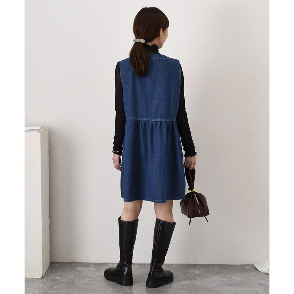 前扣V領無袖牛仔荷葉邊迷你洋裝 女款 寬鬆 薄布料 牛仔洋裝 A字裙 蓬鬆 時尚 膝丈 膝上 層次搭配 前開扣 可愛 春夏秋冬 四季皆宜
