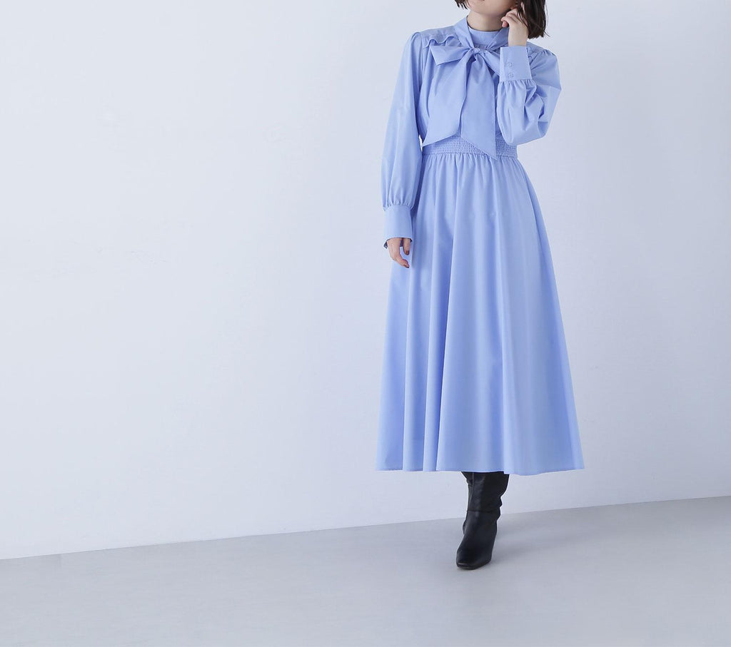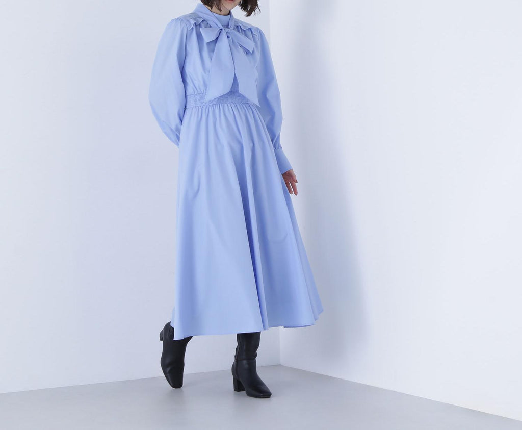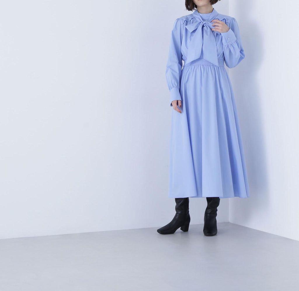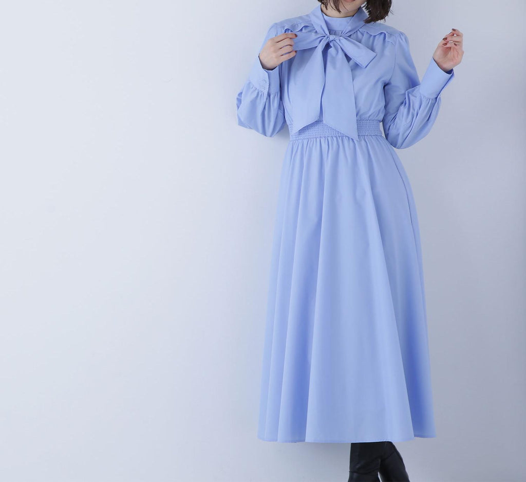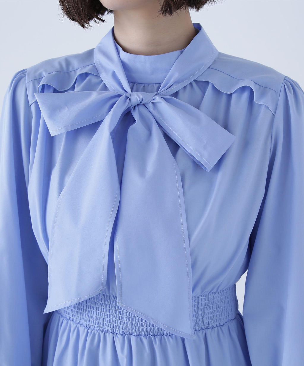 可拆卸的蝴蝶結帶的兩用連衣裙。將同材質的帶子穿過後頸的環扣,可以變成蝴蝶結帶,也可以不系帶子,穿成簡潔的立領款式。褶邊細節的荷葉邊也是亮點。腰圍採用鬆緊橡膠設計,穿著舒適無壓力。