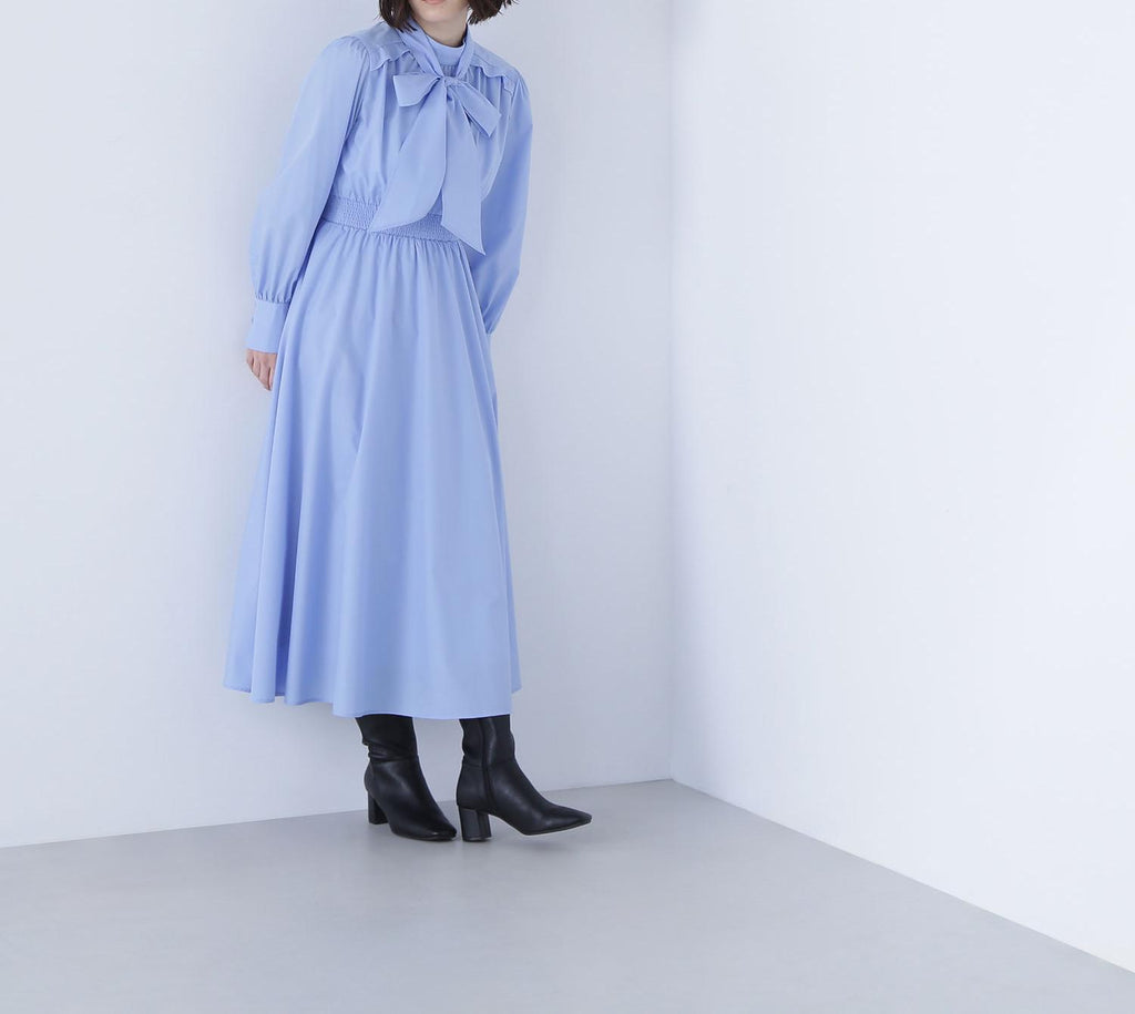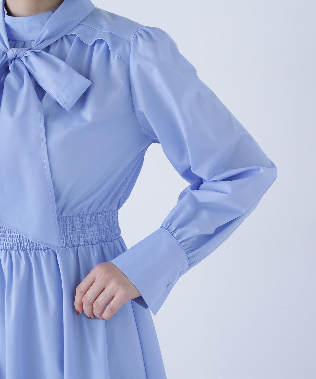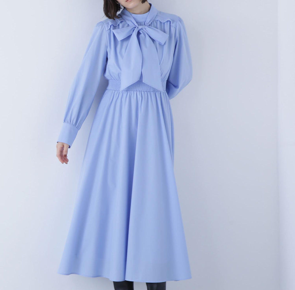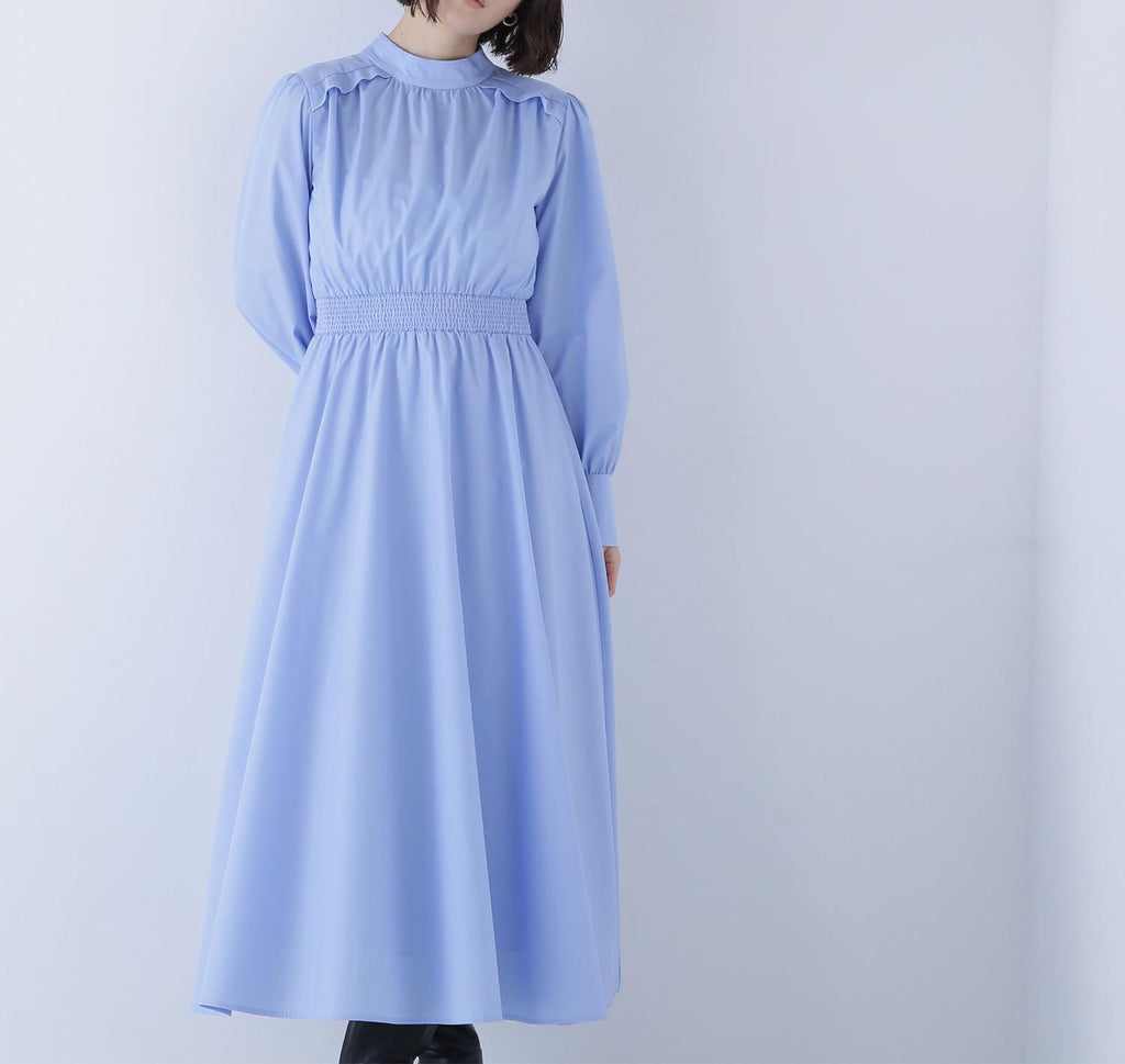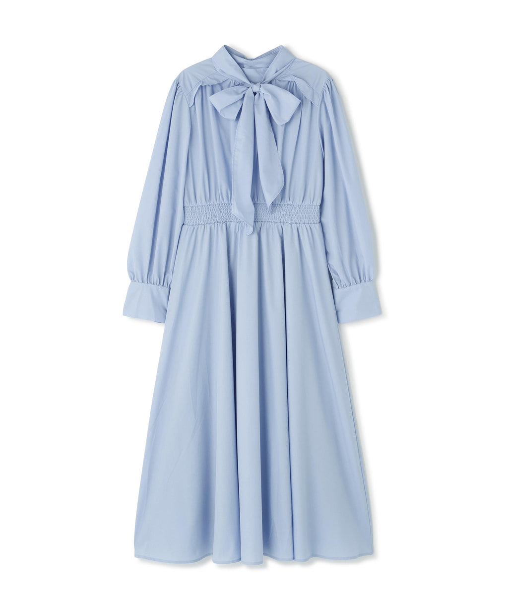可拆卸的蝴蝶結帶的兩用連衣裙。將同材質的帶子穿過後頸的環扣,可以變成蝴蝶結帶,也可以不系帶子,穿成簡潔的立領款式。褶邊細節的荷葉邊也是亮點。腰圍採用鬆緊橡膠設計,穿著舒適無壓力。