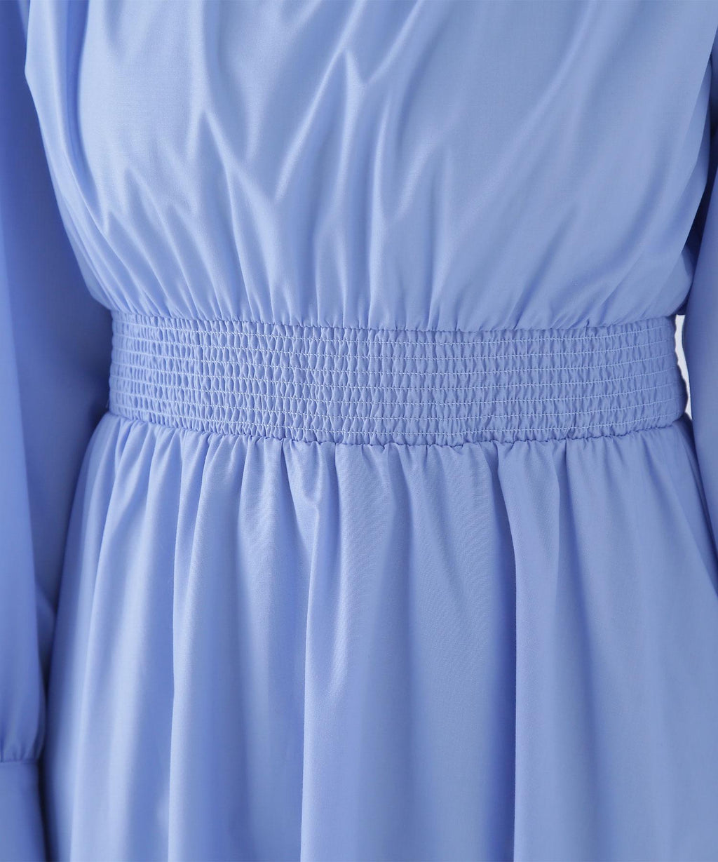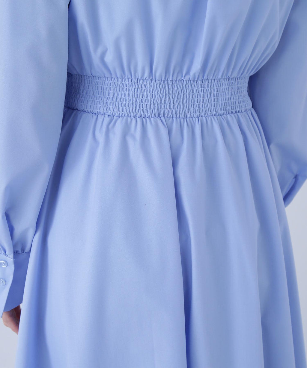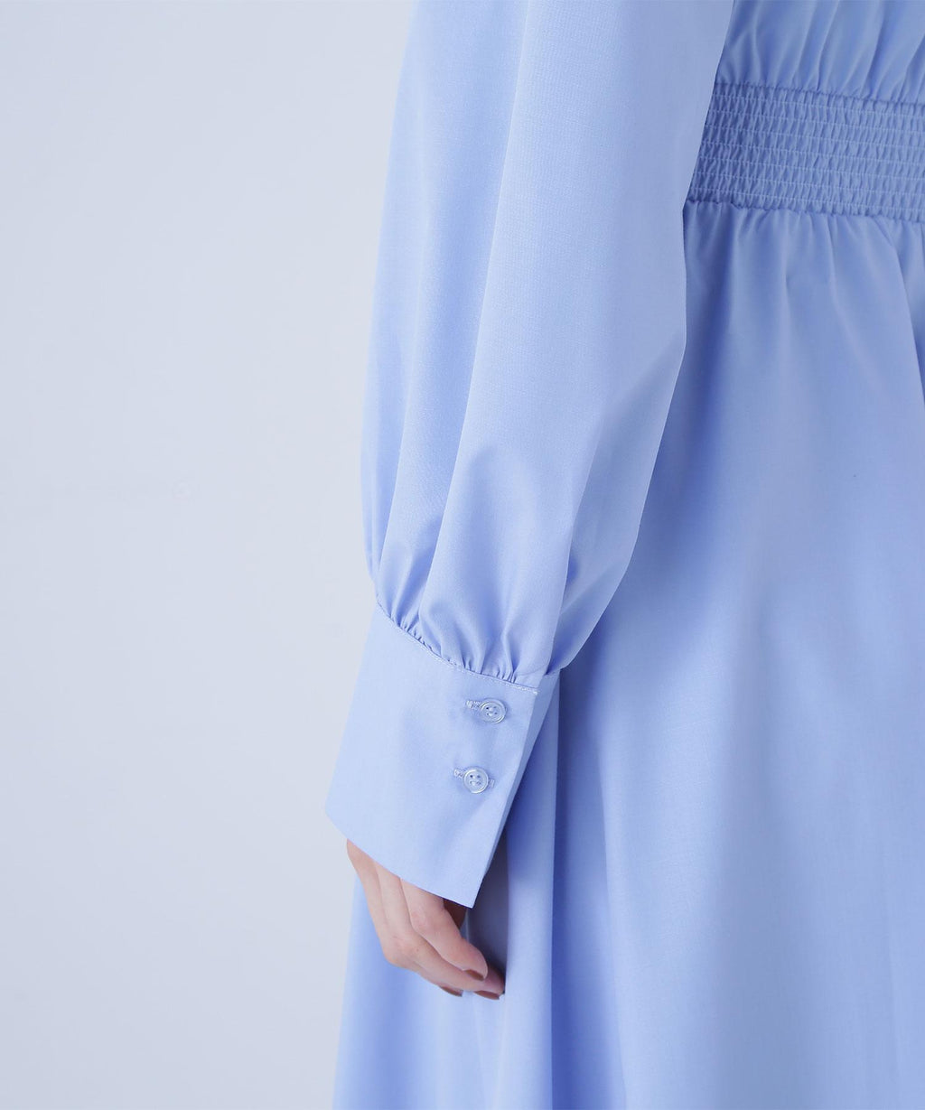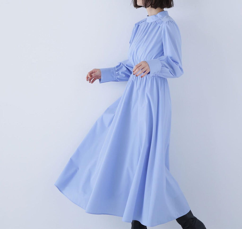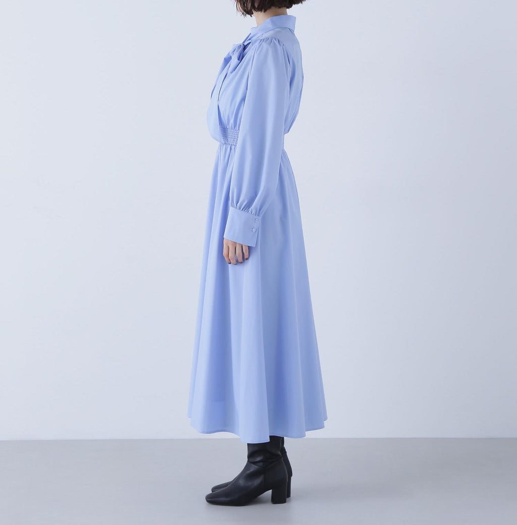 可拆卸的蝴蝶結帶的兩用連衣裙。將同材質的帶子穿過後頸的環扣,可以變成蝴蝶結帶,也可以不系帶子,穿成簡潔的立領款式。褶邊細節的荷葉邊也是亮點。腰圍採用鬆緊橡膠設計,穿著舒適無壓力。