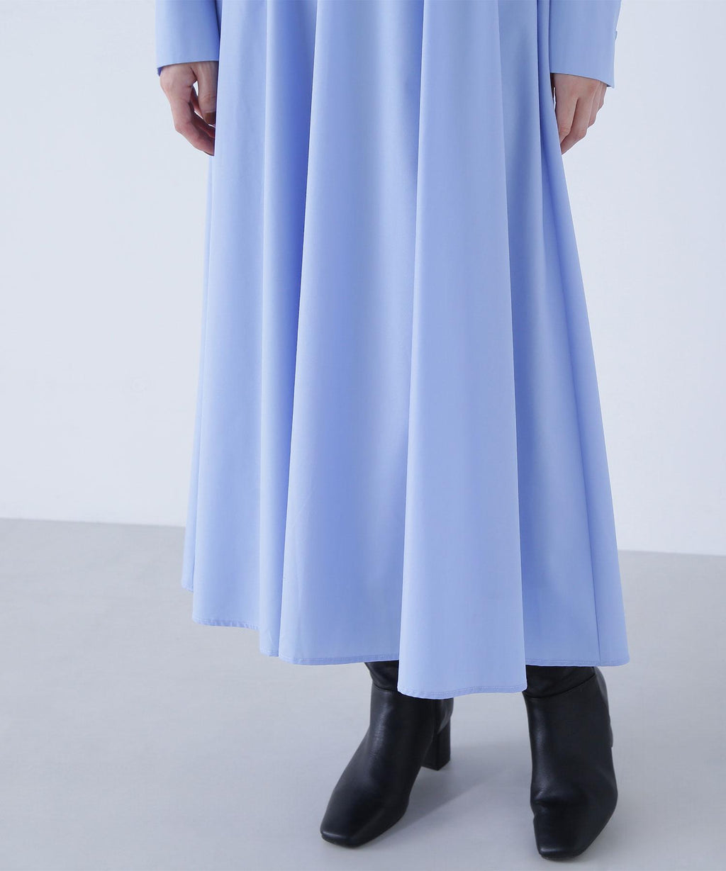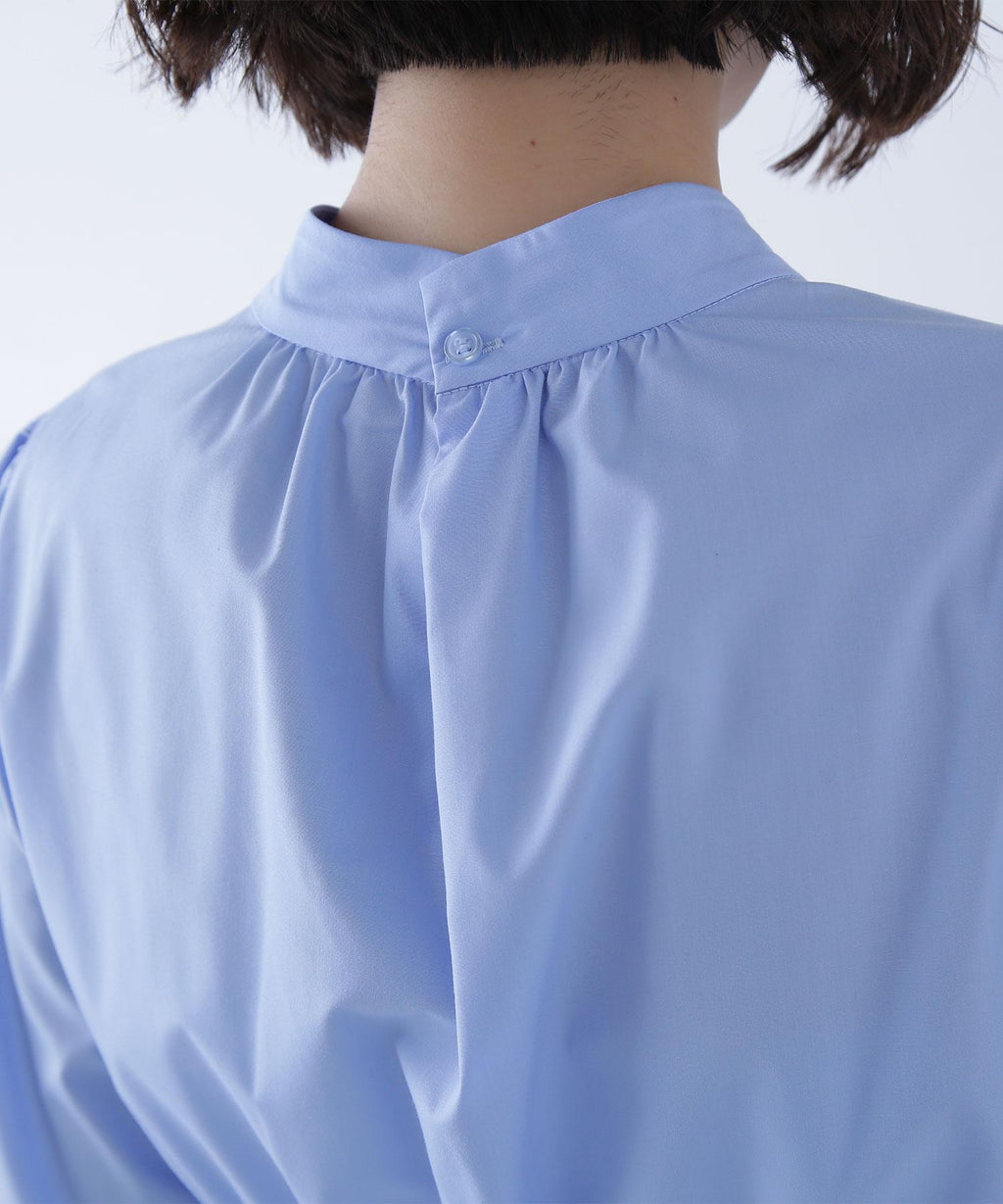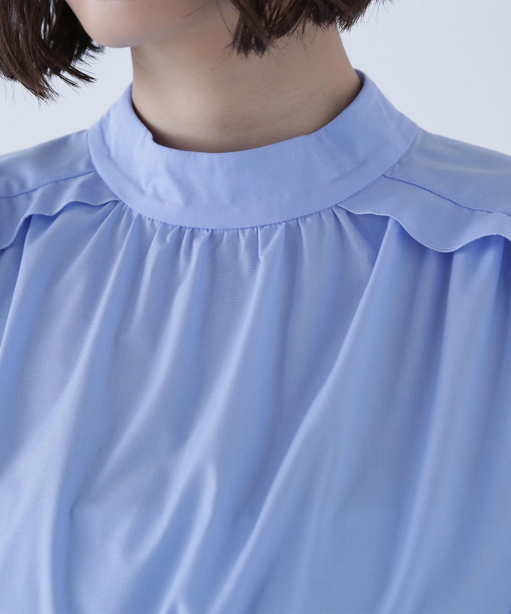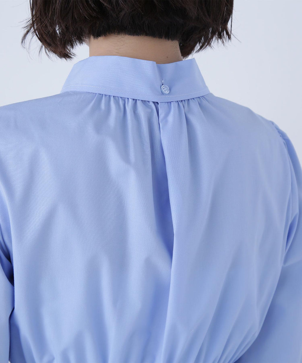 可拆卸的蝴蝶結帶的兩用連衣裙。將同材質的帶子穿過後頸的環扣,可以變成蝴蝶結帶,也可以不系帶子,穿成簡潔的立領款式。褶邊細節的荷葉邊也是亮點。腰圍採用鬆緊橡膠設計,穿著舒適無壓力。