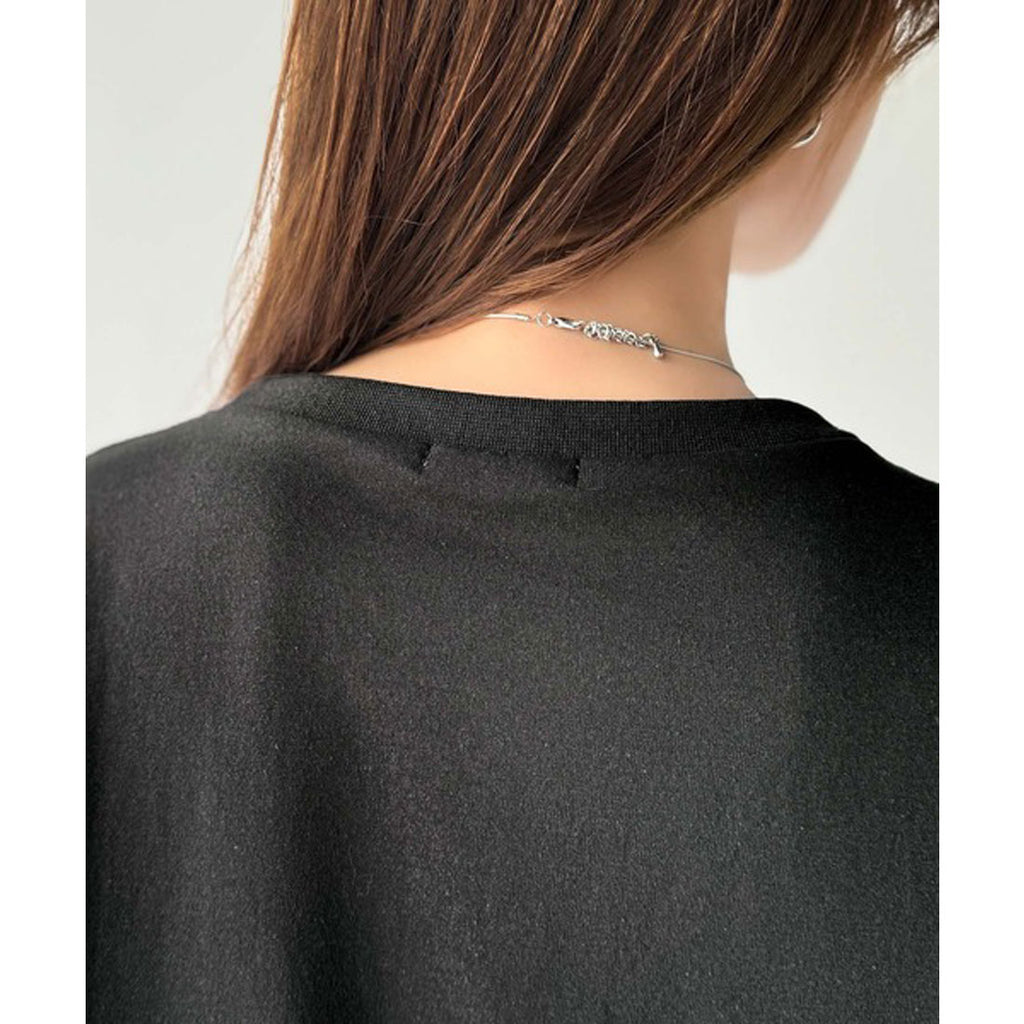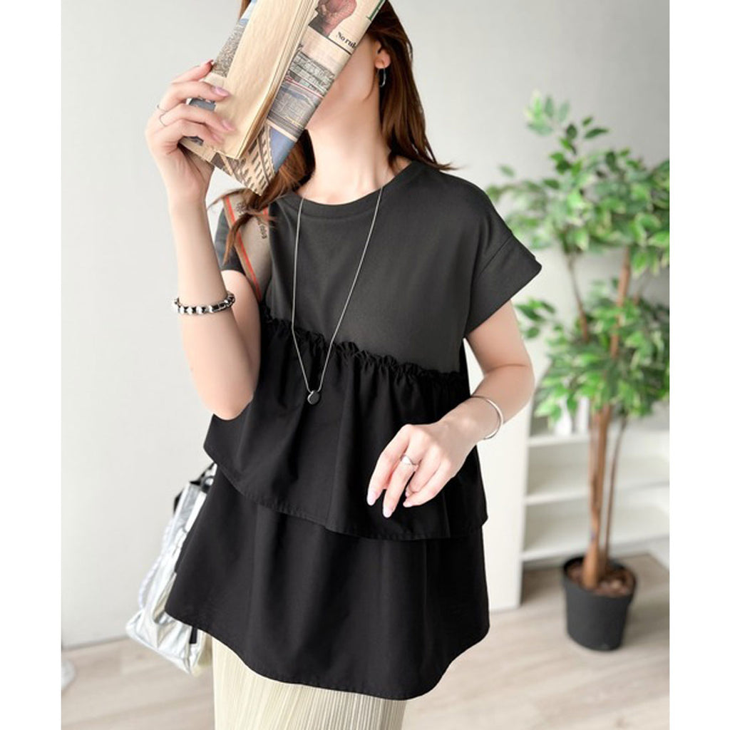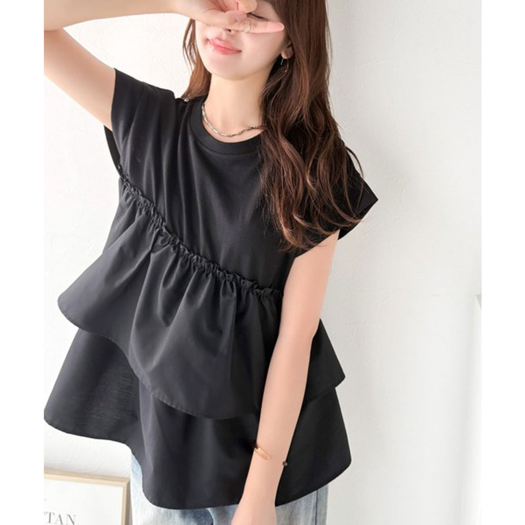 輕盈的天竺T恤材質與荷葉邊部分的挺括布料異素材混合