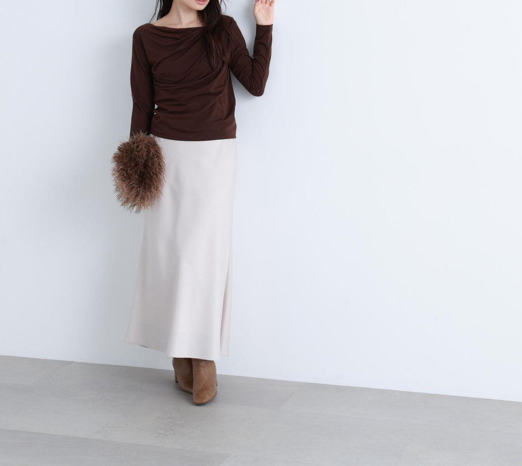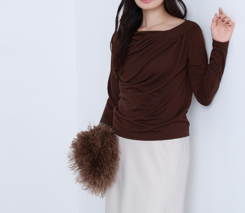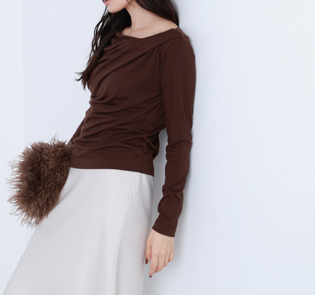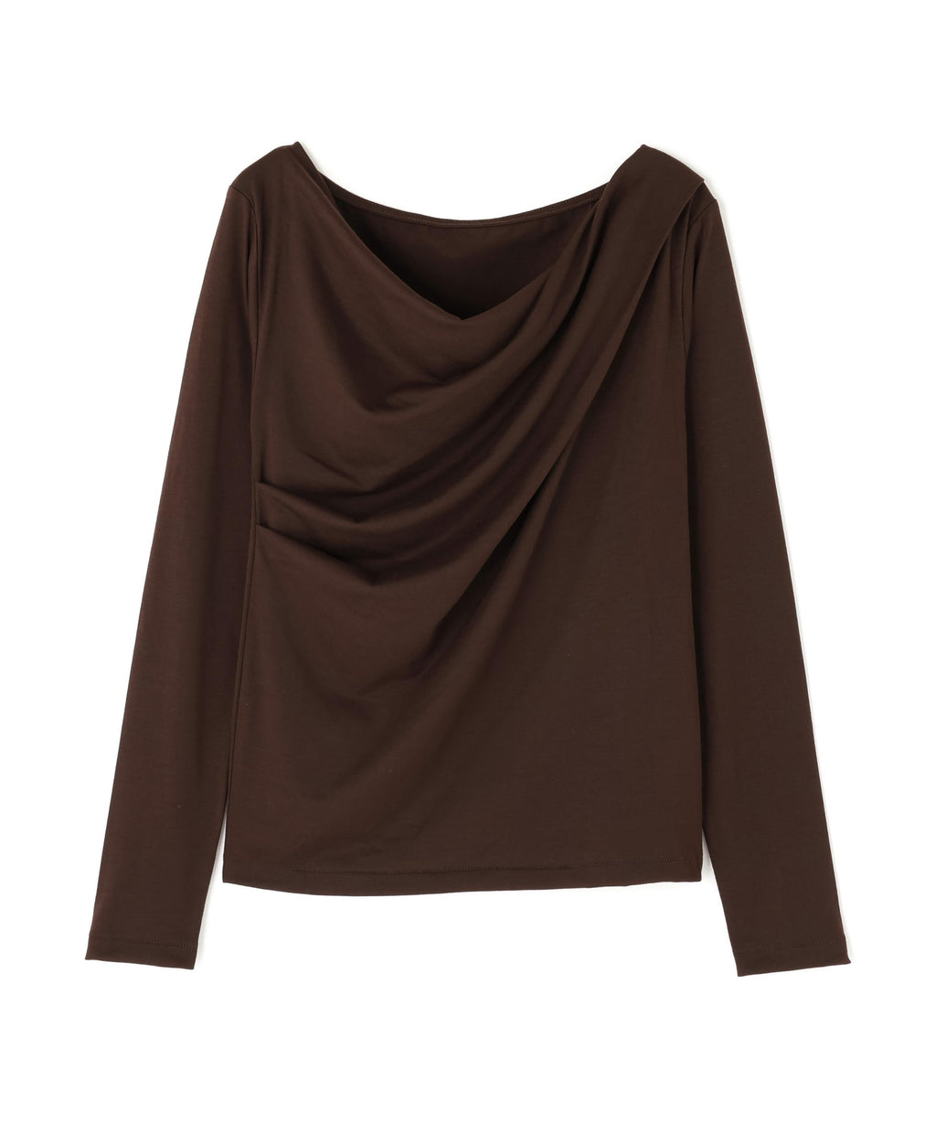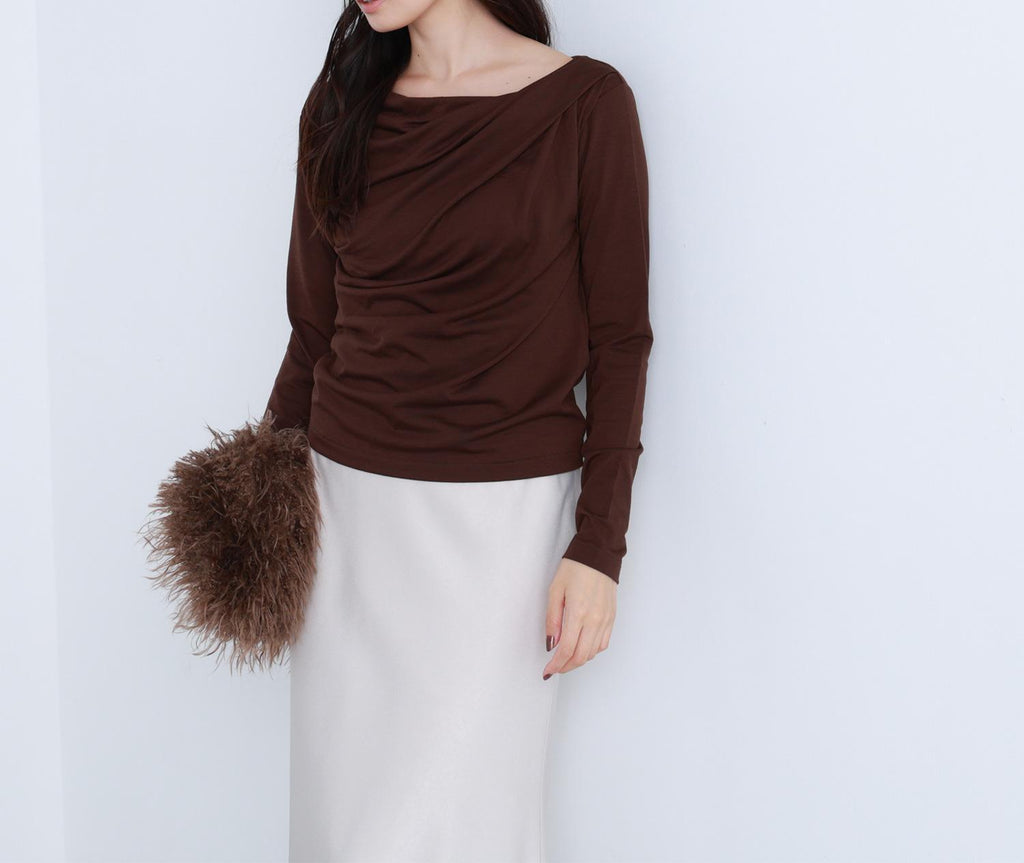 褶皺線條美麗的剪裁T恤。適度的厚度材質,非常適合炎熱的秋天。具有休閒與正式下著都容易搭配的細節魅力。由於是開領設計,帶有一點空氣感,能展現女性魅力的穿著感。