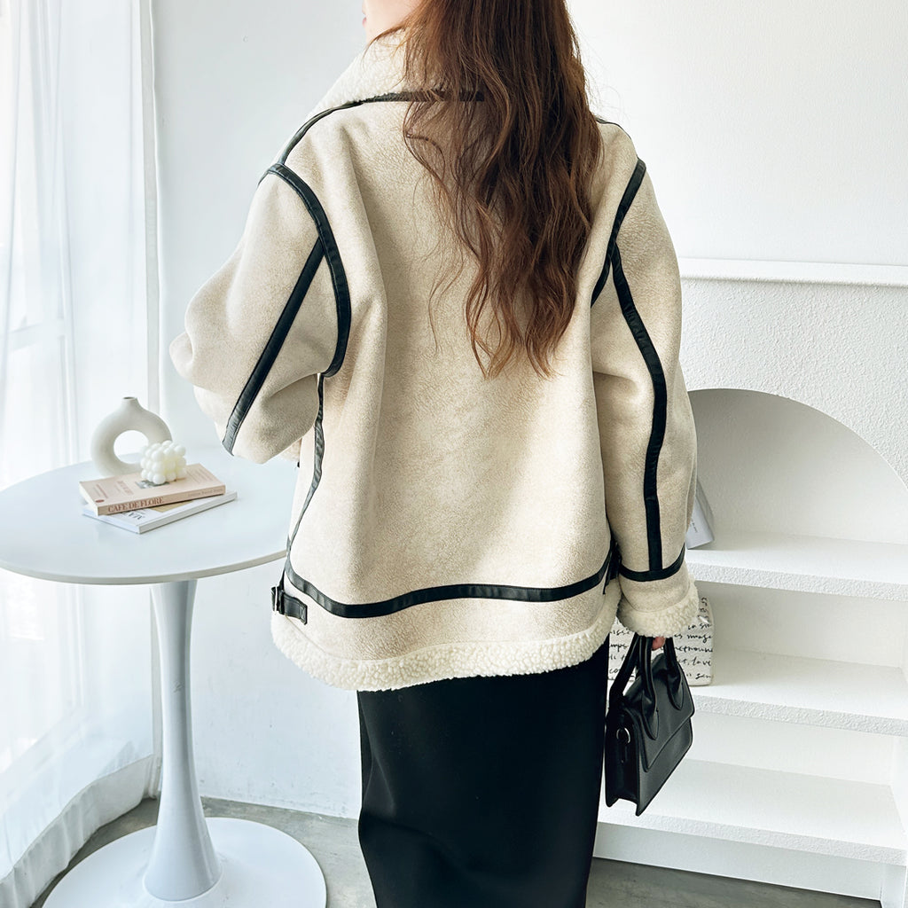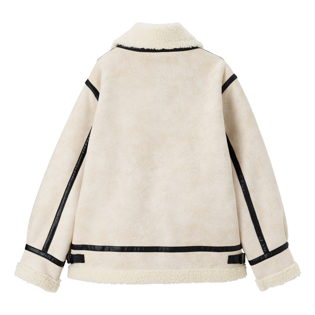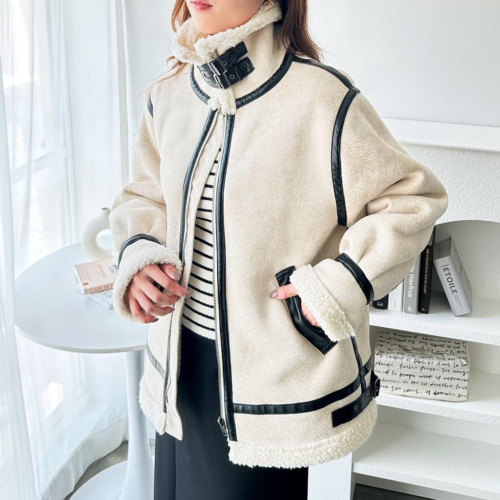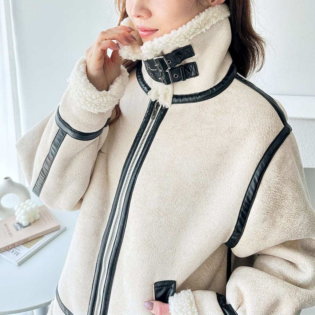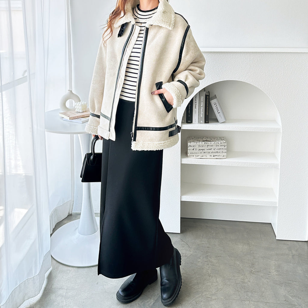 人造皮革的包邊和下擺的皮帶等細節也很用心,是穿搭亮點!