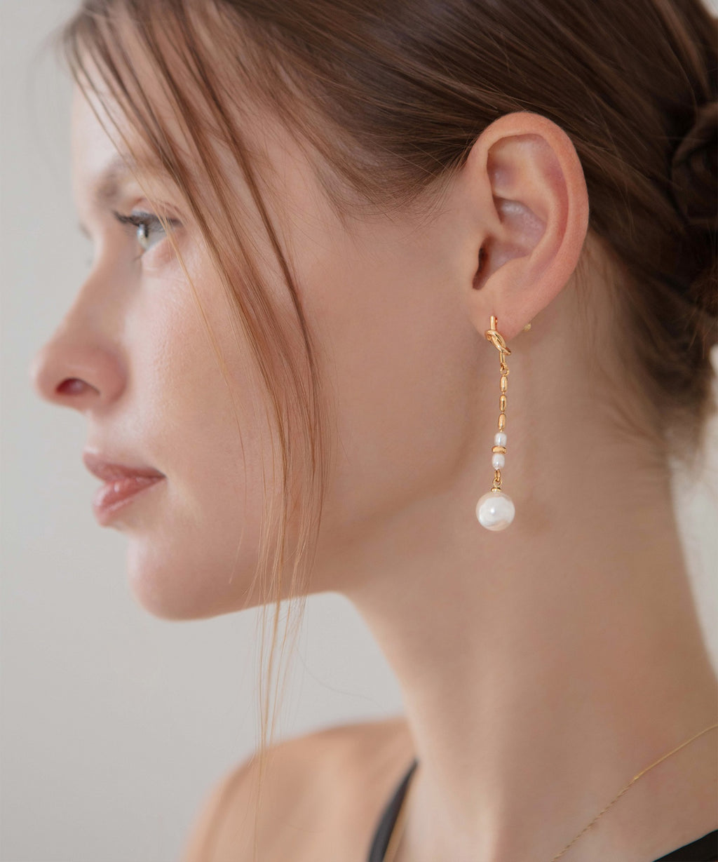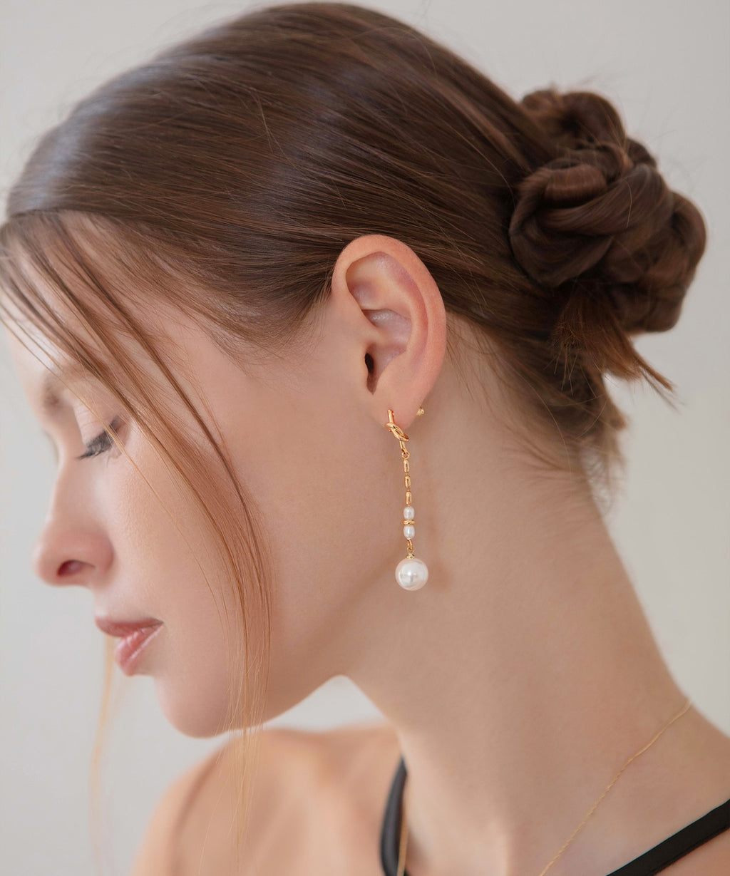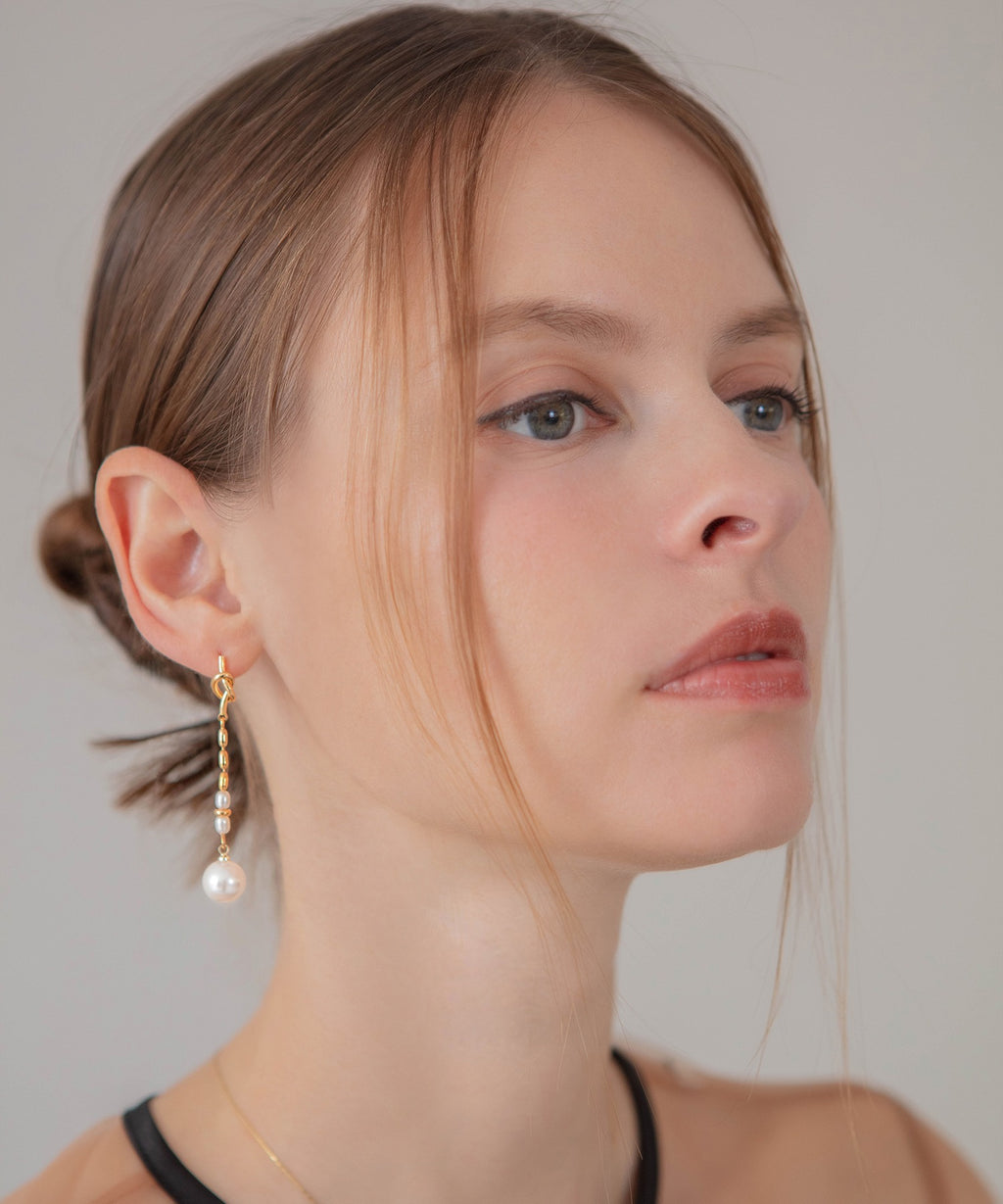 細緻的鏈條與高雅的珍珠搖曳,展現優雅的長款耳環