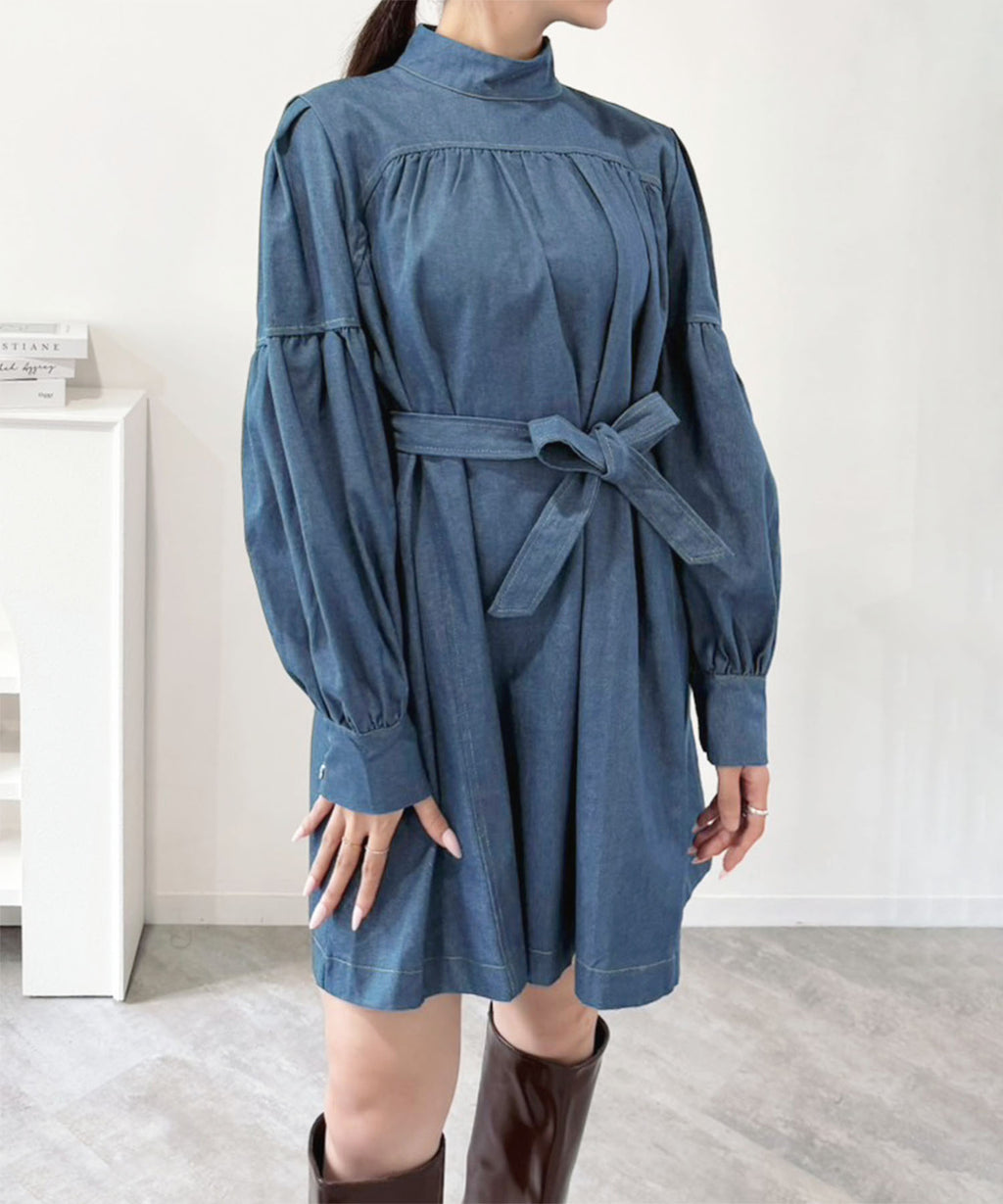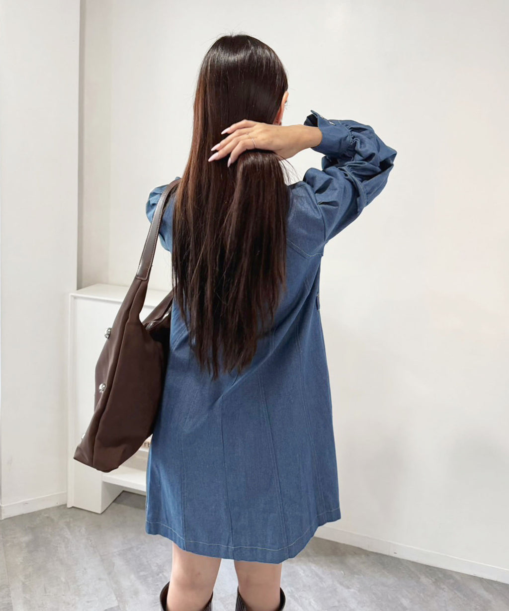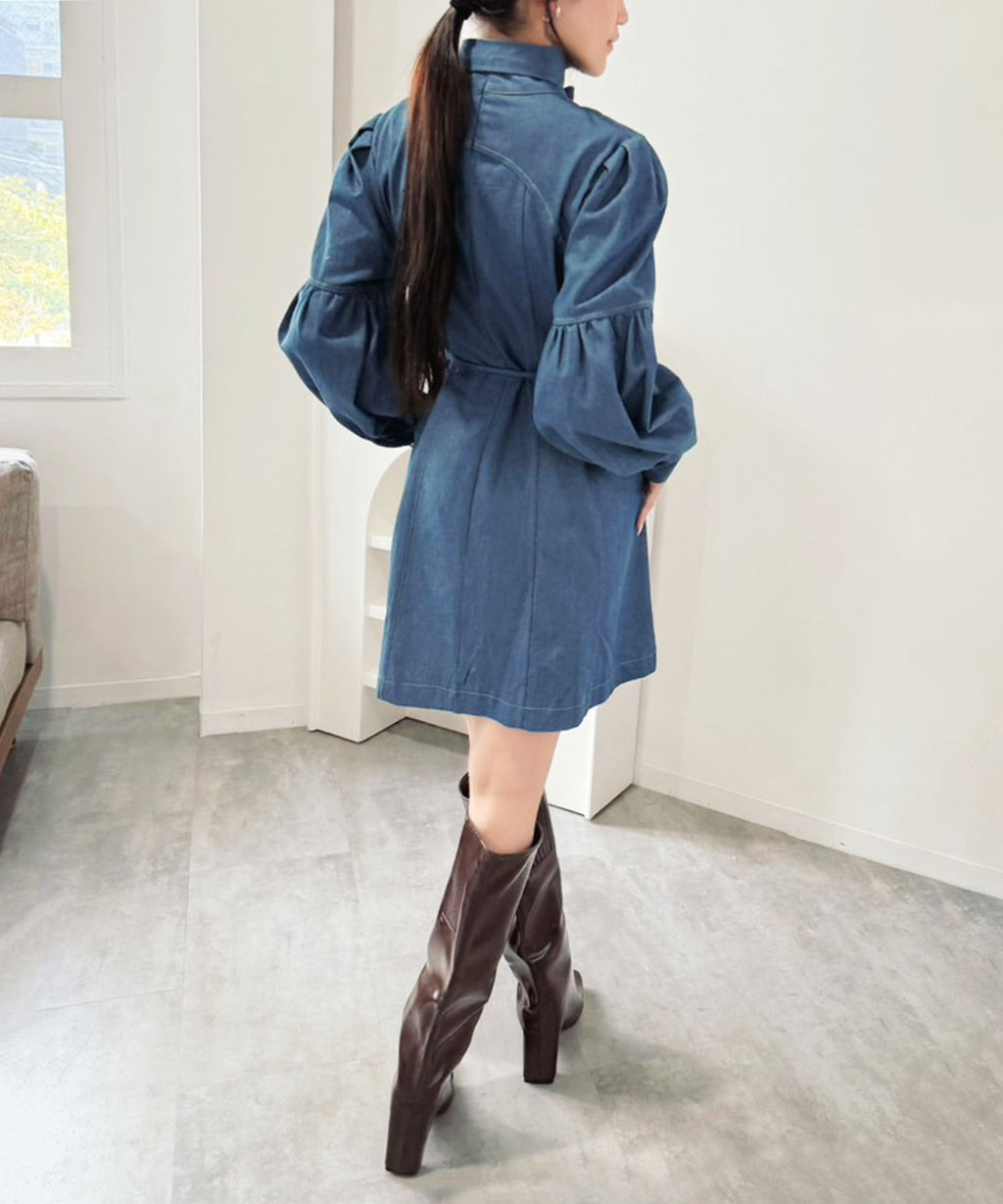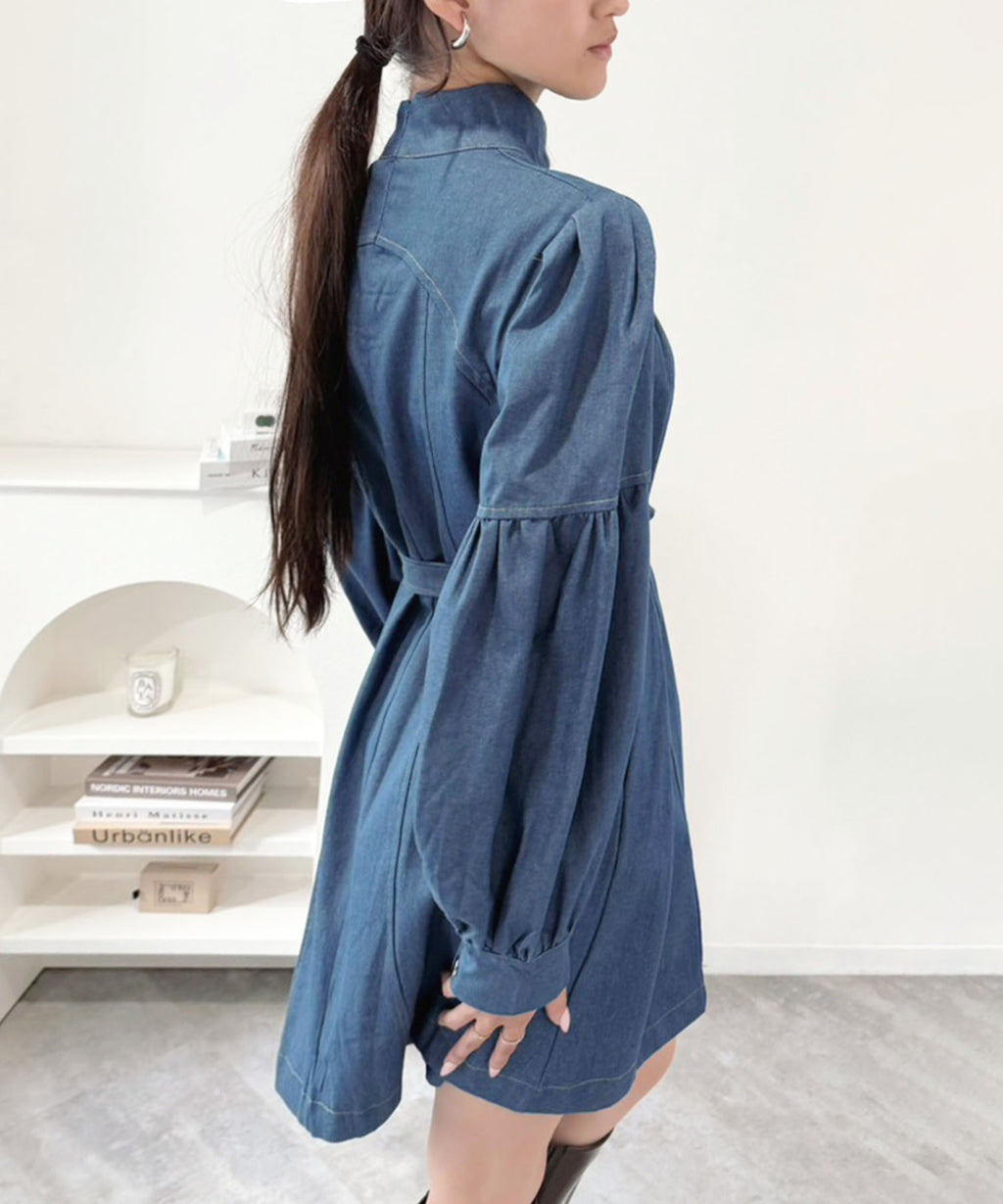 身形和袖子輪廓都很有魅力的牛仔迷你連衣裙。