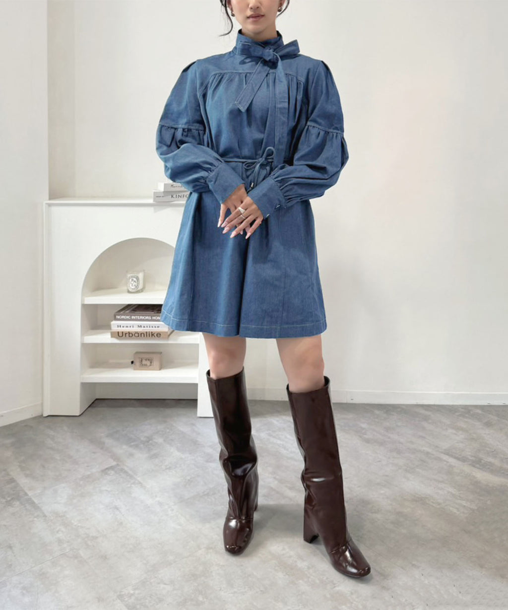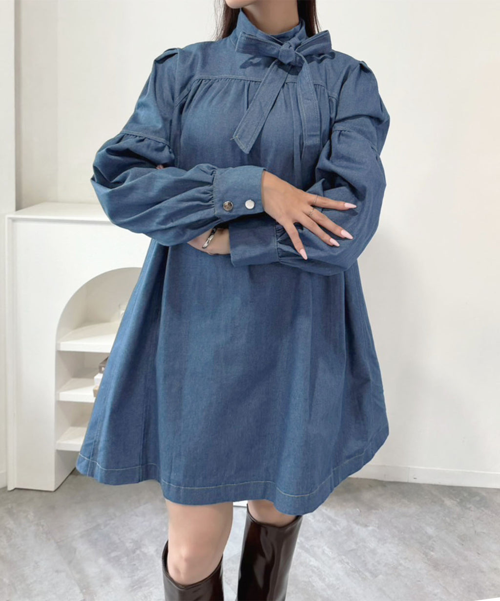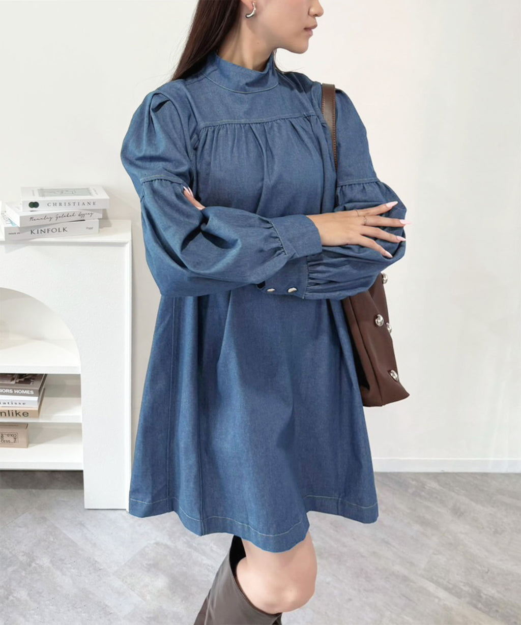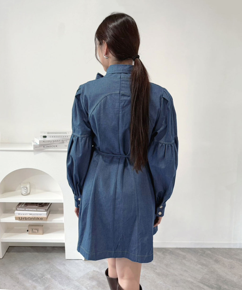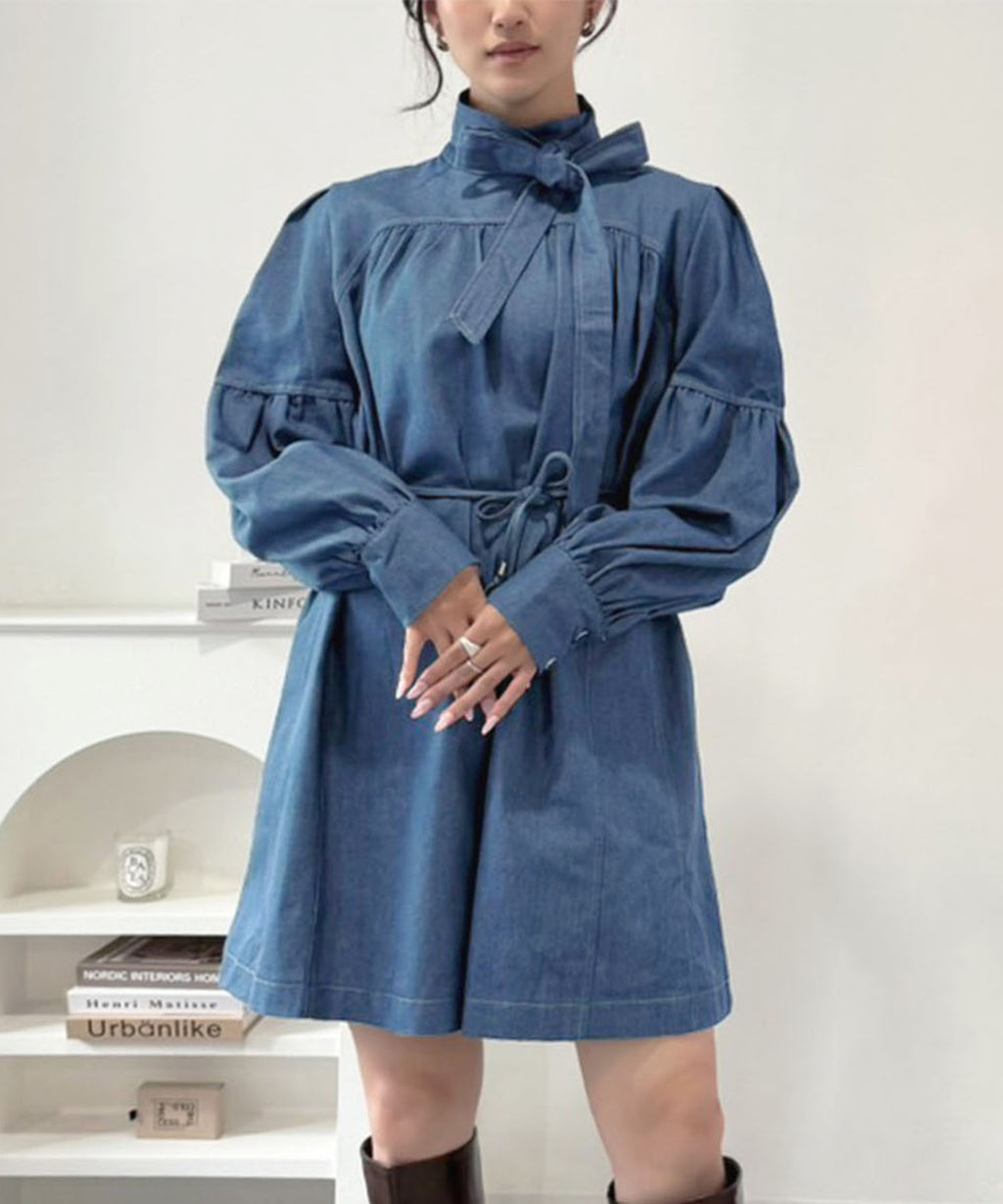 身形和袖子輪廓都很有魅力的牛仔迷你連衣裙。