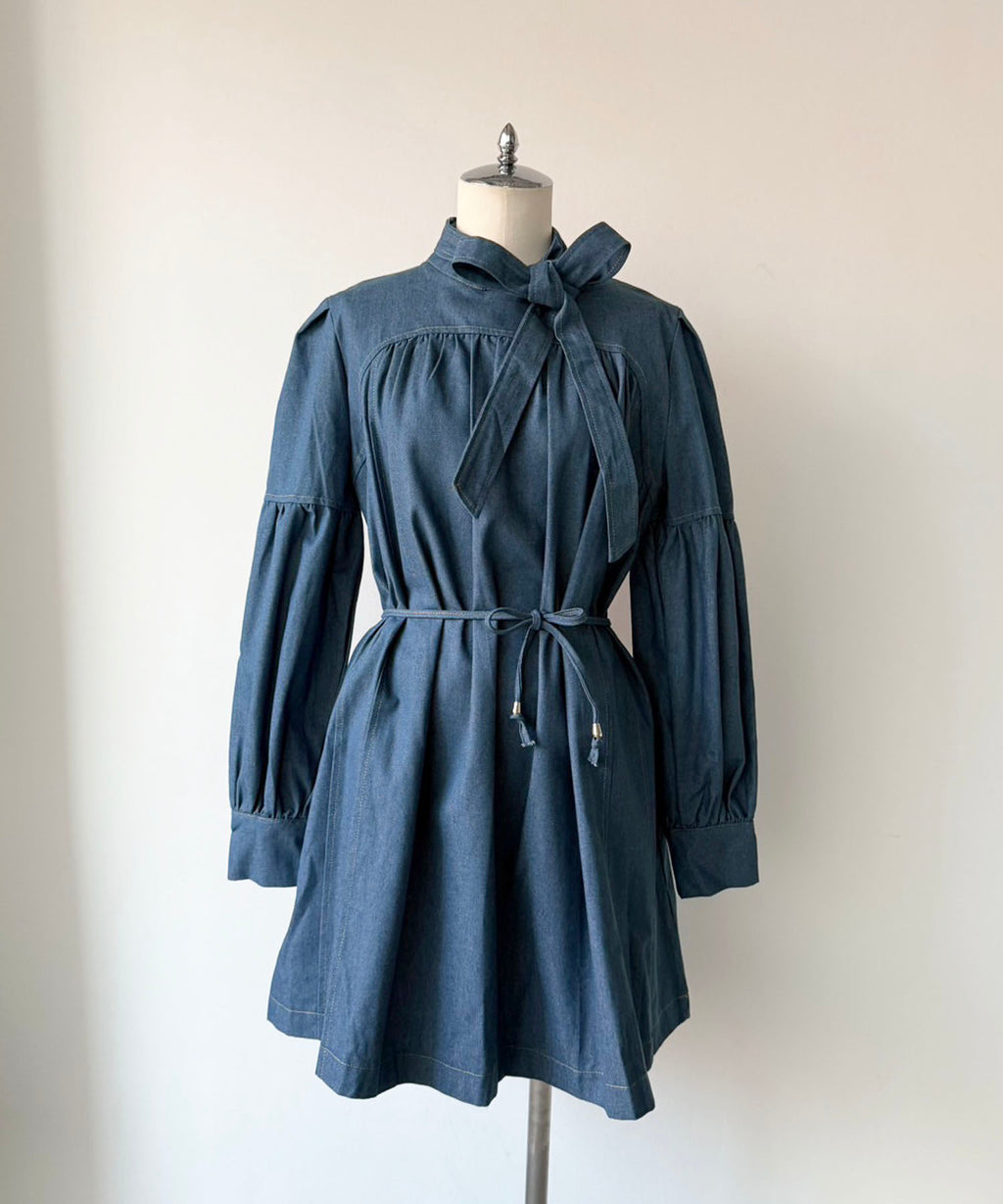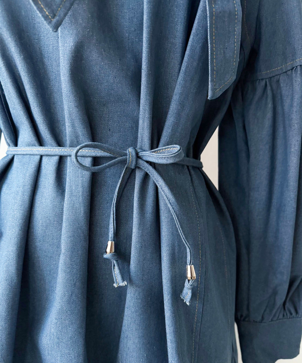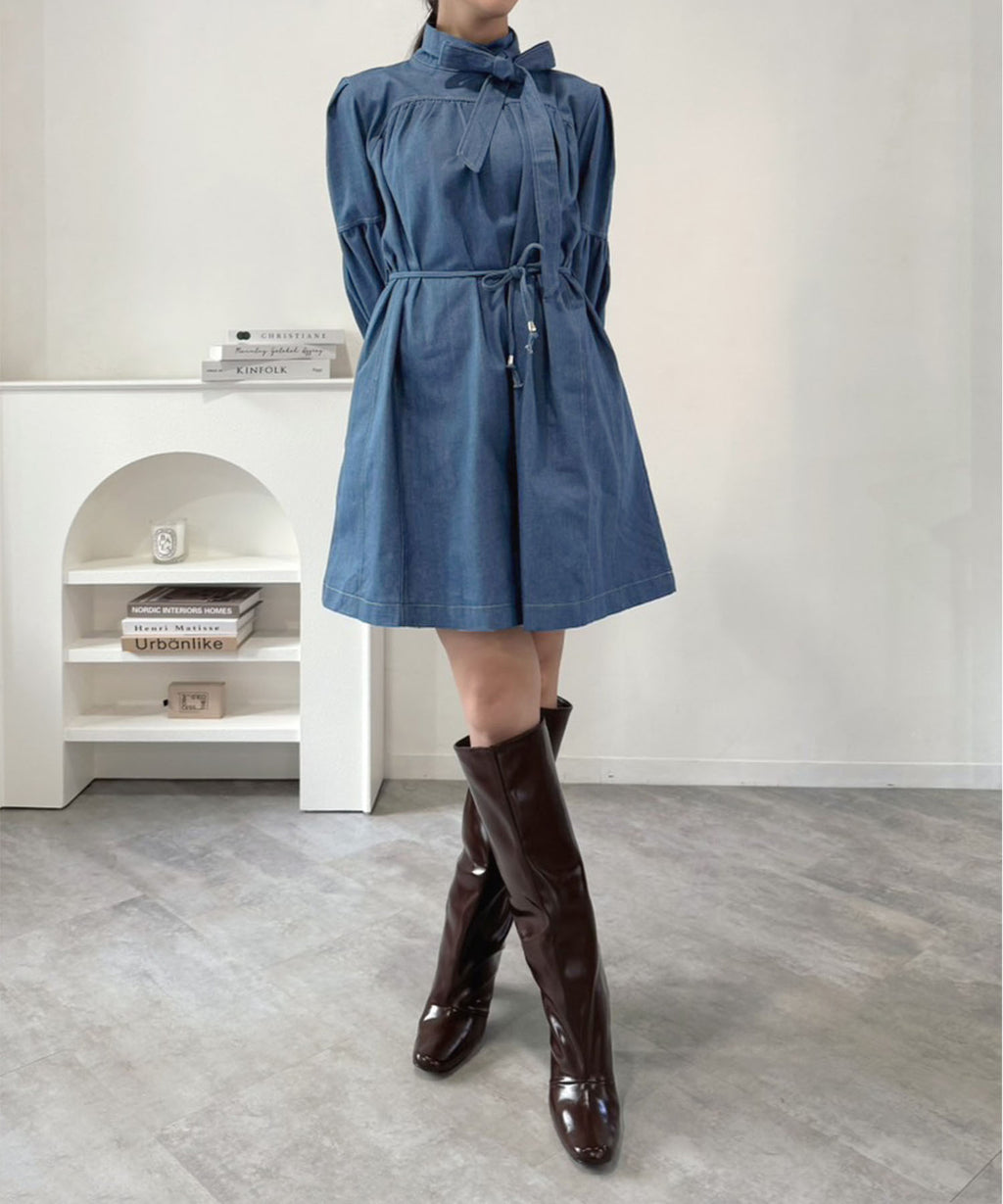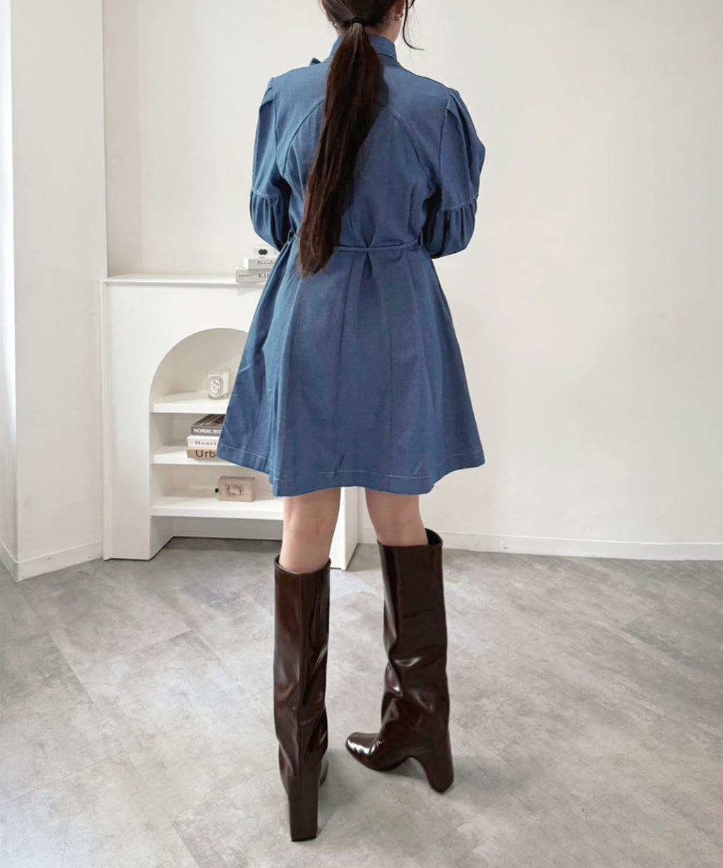身形和袖子輪廓都很有魅力的牛仔迷你連衣裙。