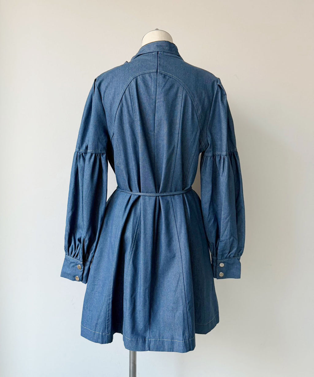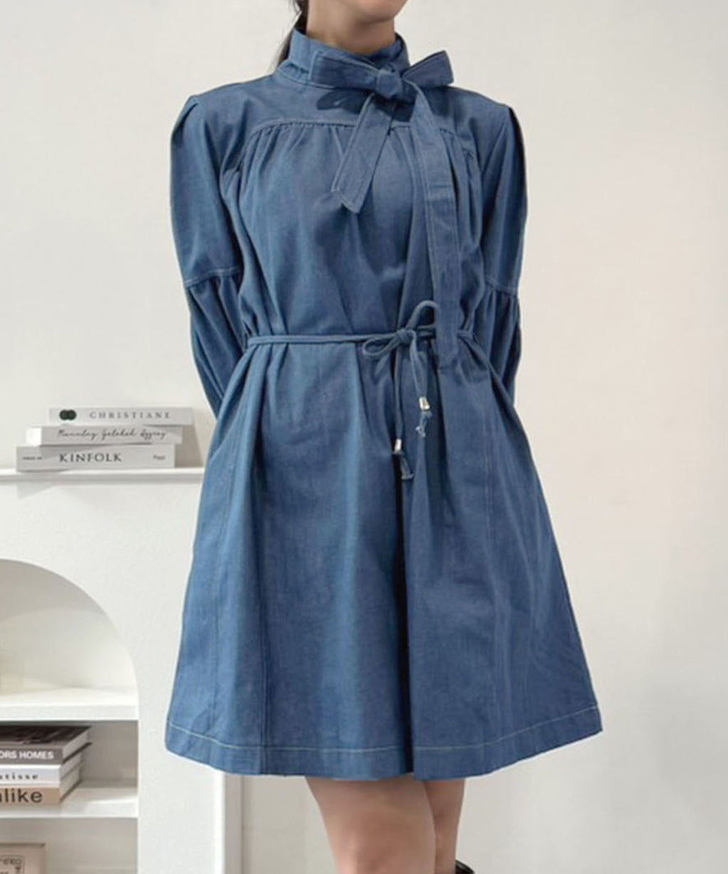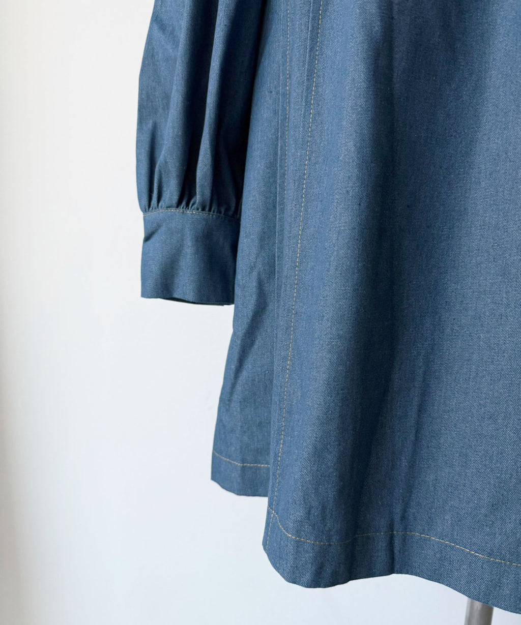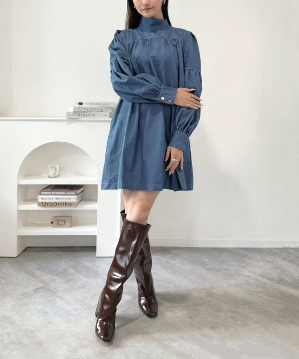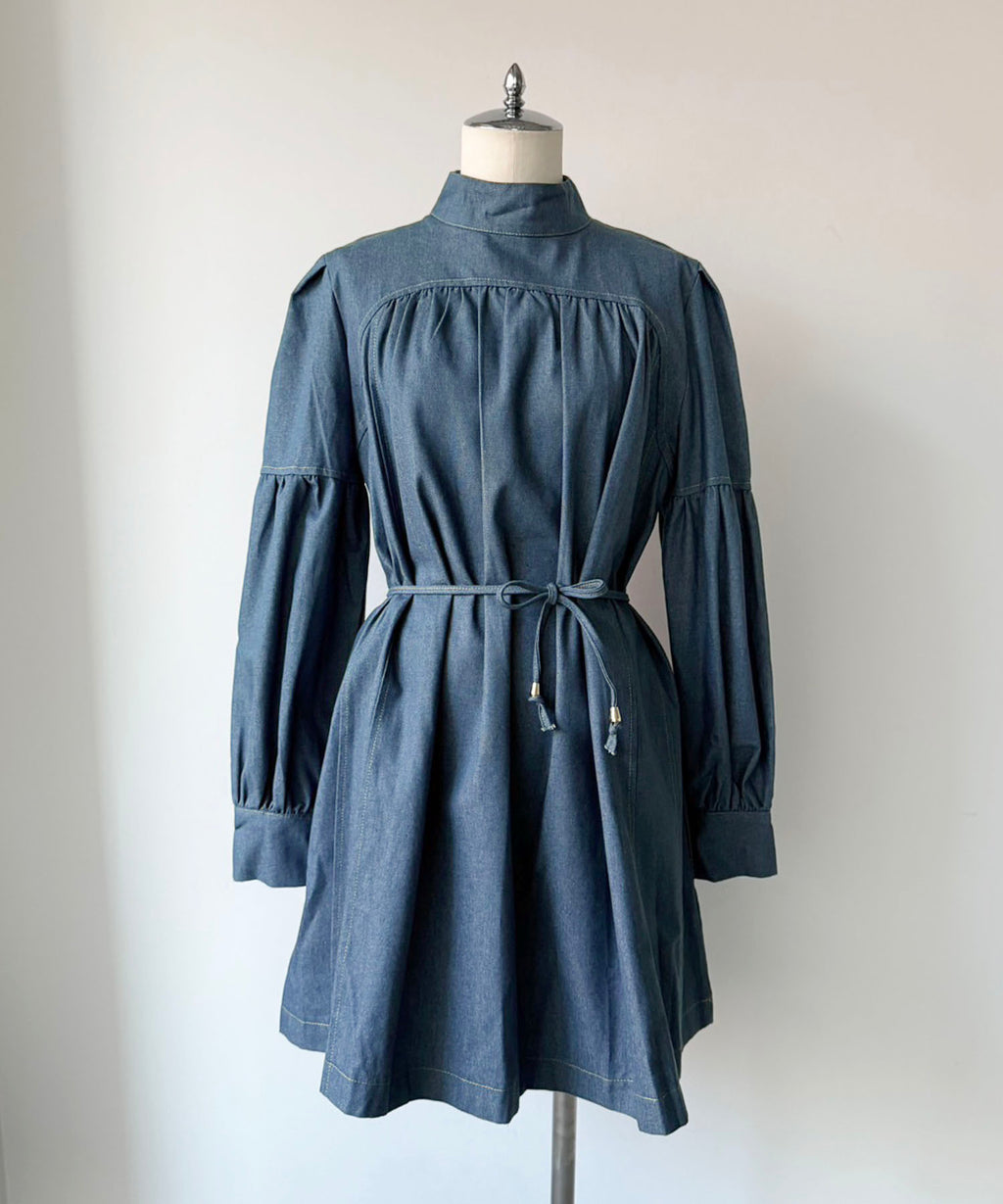 身形和袖子輪廓都很有魅力的牛仔迷你連衣裙。