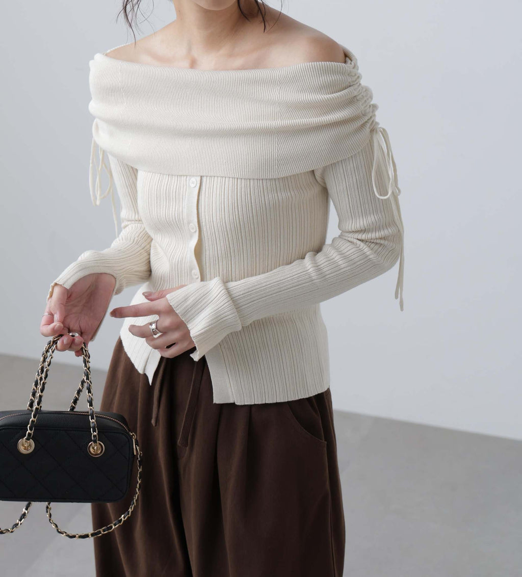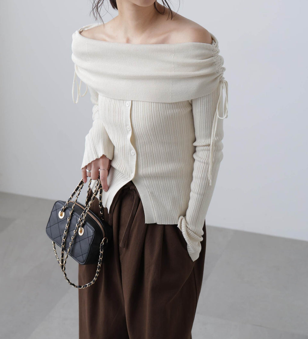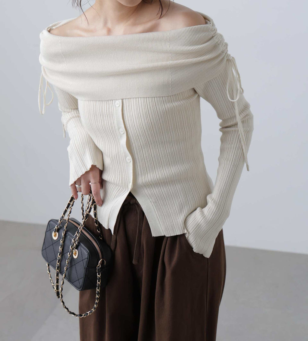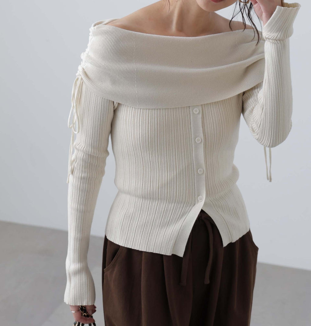 受肩的流行感十足的隨機肋紋針織衫,搭配受歡迎的緞帶細節。身體部分為緊身剪裁,前開口部分的下擺設計為開衩,增添了透氣感。受肩的兩側附有纖細的緞帶細節,展現女性魅力。特點是使用柔軟蓬鬆的纖維,觸感光滑,輕盈且舒適的針織。建議搭配裙子、褲子或牛仔褲,無論底部選擇如何都能輕鬆搭配。內搭合身的襯衫,還可以享受與透明內搭的層次搭配。