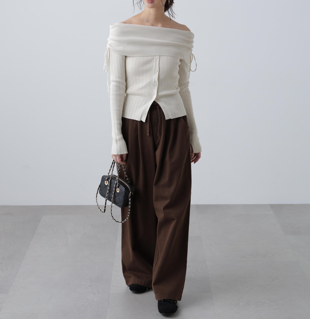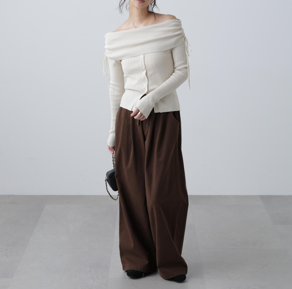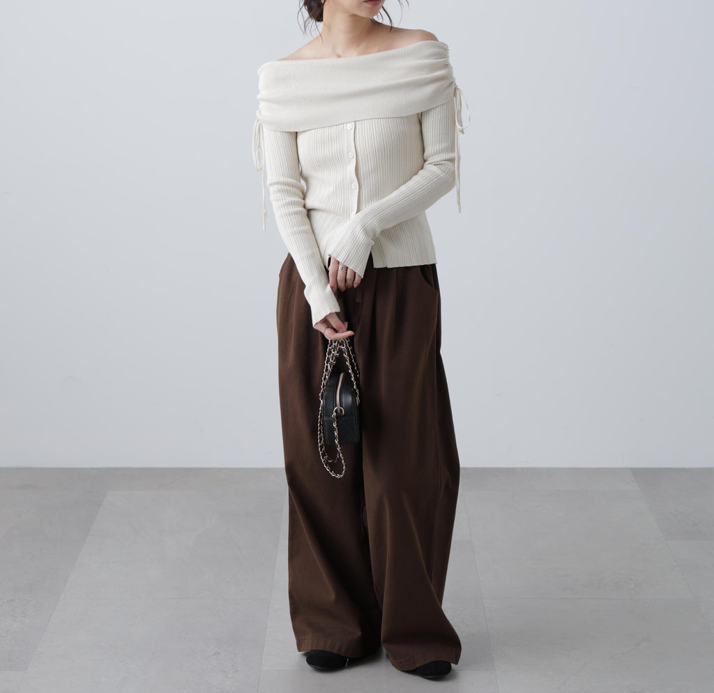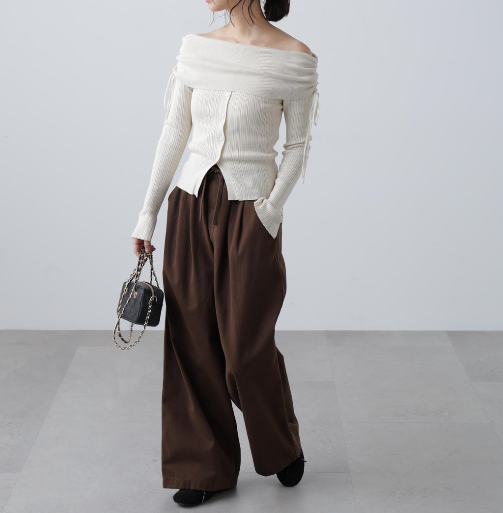 受肩的流行感十足的隨機肋紋針織衫,搭配受歡迎的緞帶細節。身體部分為緊身剪裁,前開口部分的下擺設計為開衩,增添了透氣感。受肩的兩側附有纖細的緞帶細節,展現女性魅力。特點是使用柔軟蓬鬆的纖維,觸感光滑,輕盈且舒適的針織。建議搭配裙子、褲子或牛仔褲,無論底部選擇如何都能輕鬆搭配。內搭合身的襯衫,還可以享受與透明內搭的層次搭配。