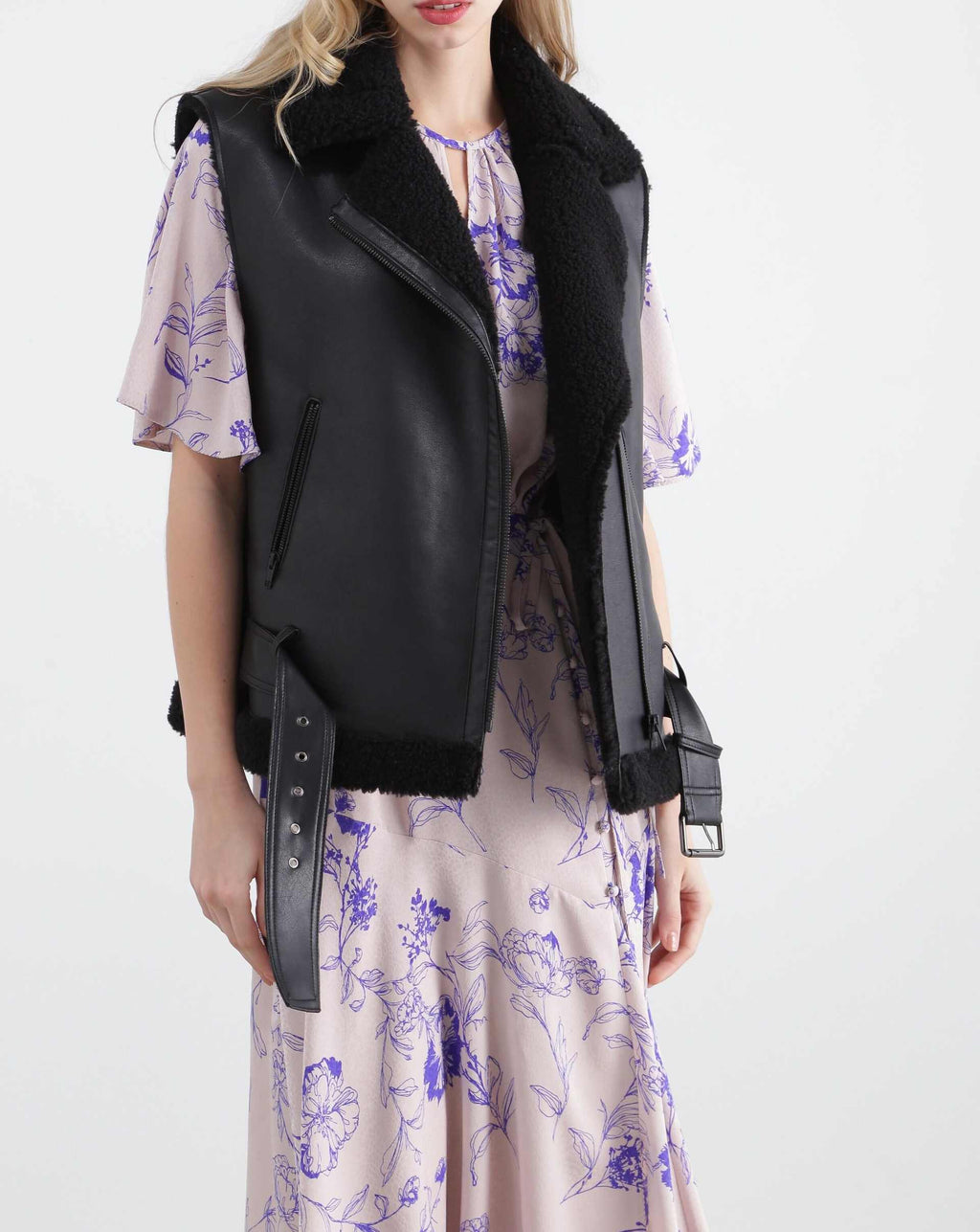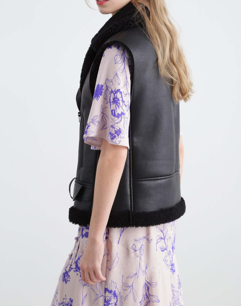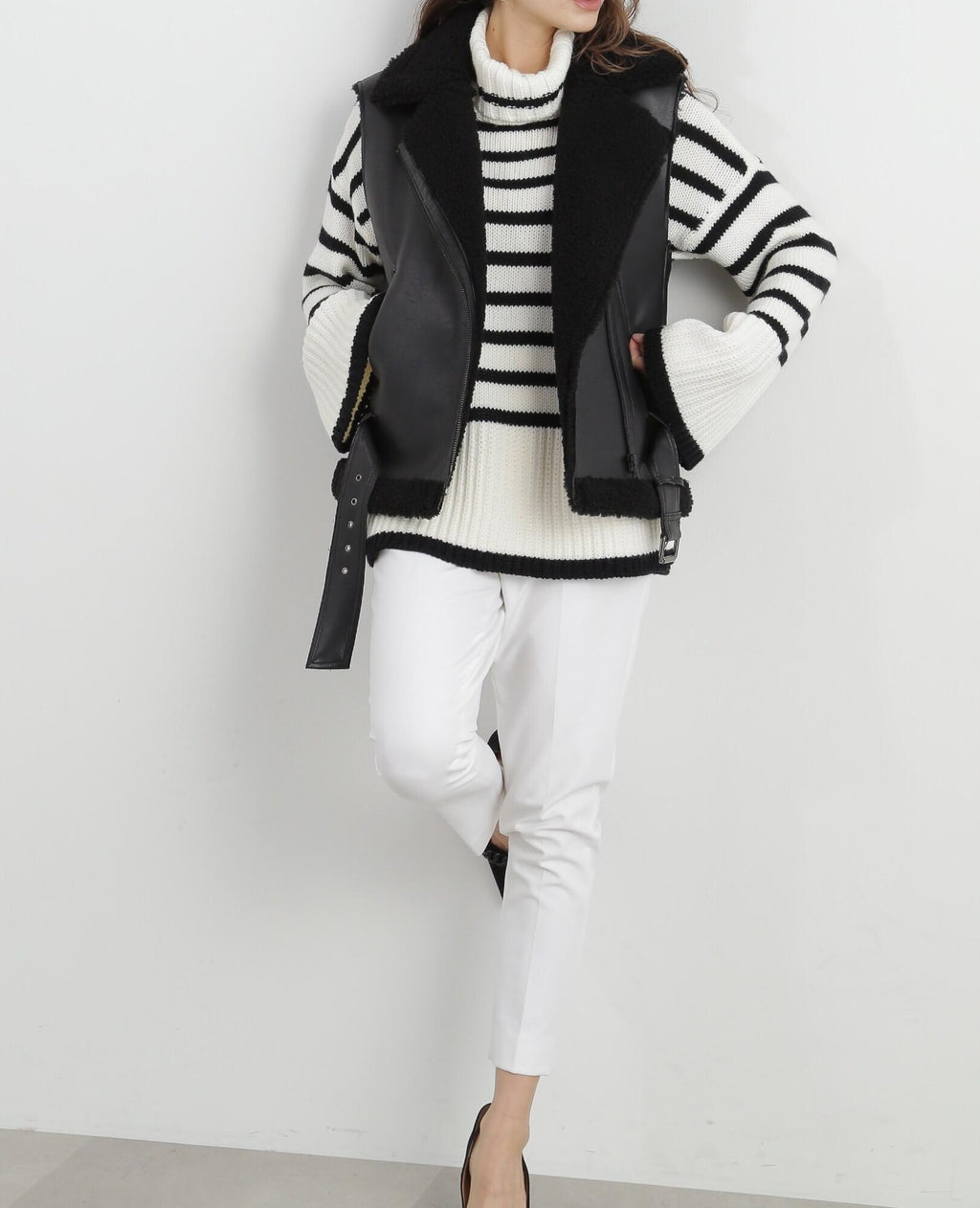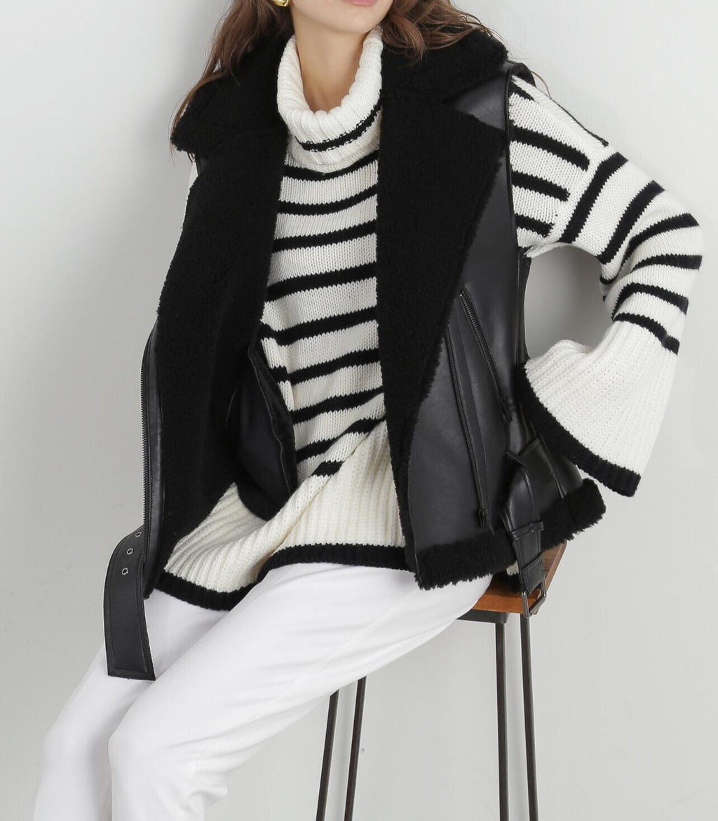 如同真羊毛般的質感充滿高級感的合成皮革騎士外套。通過面板切換創造出適度緊身的輪廓,尖銳的金屬拉鍊和腰帶設計為造型增添了風味。內部為毛絨,輕便且保暖性極佳。作為層次搭配的單品,能瞬間提升時尚感。