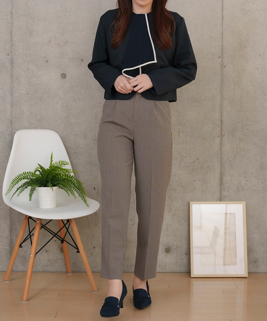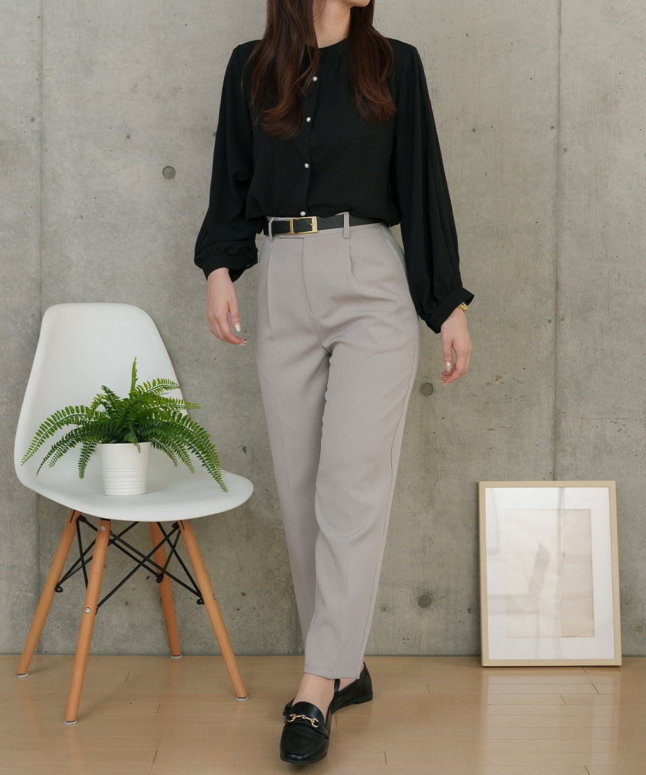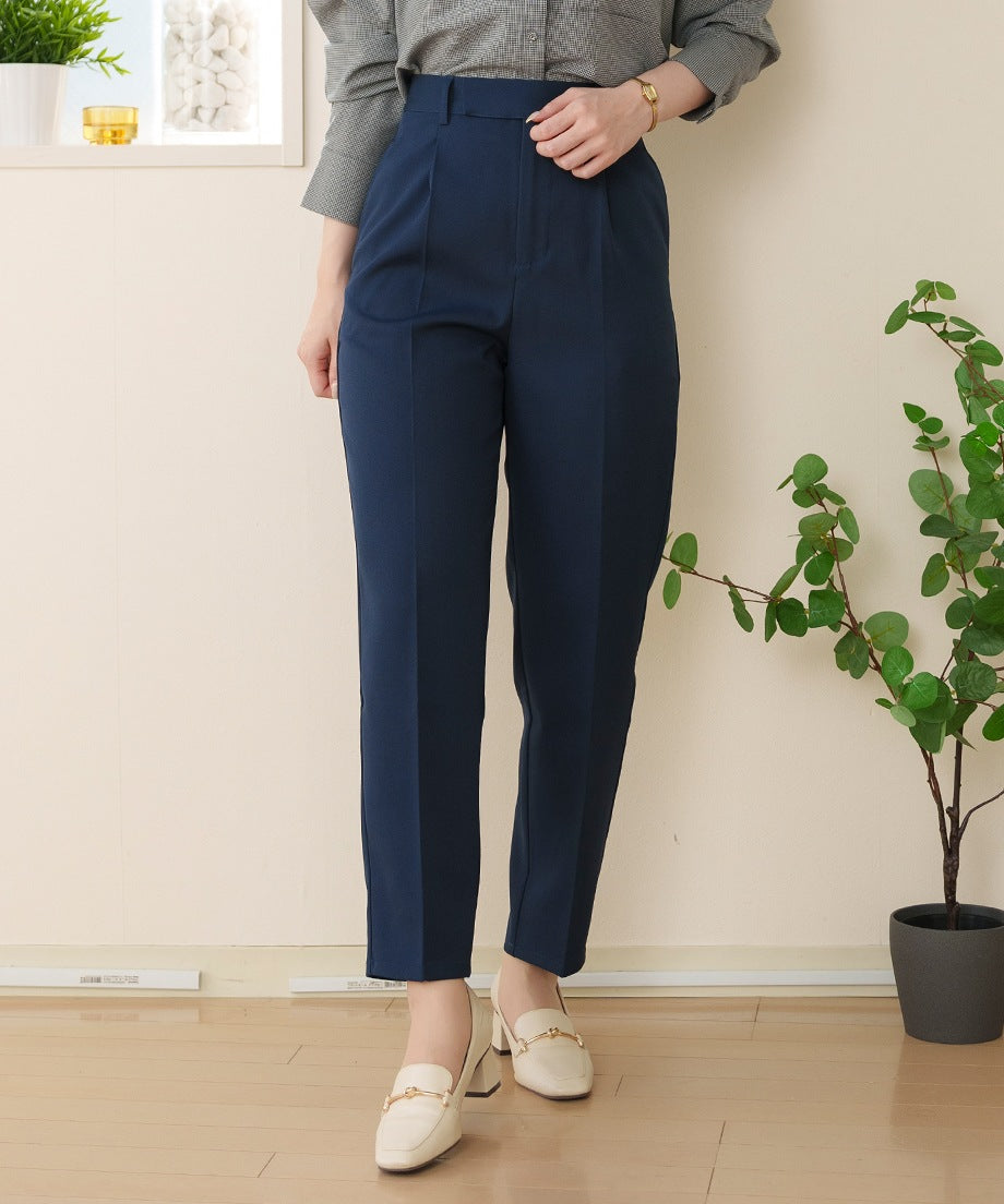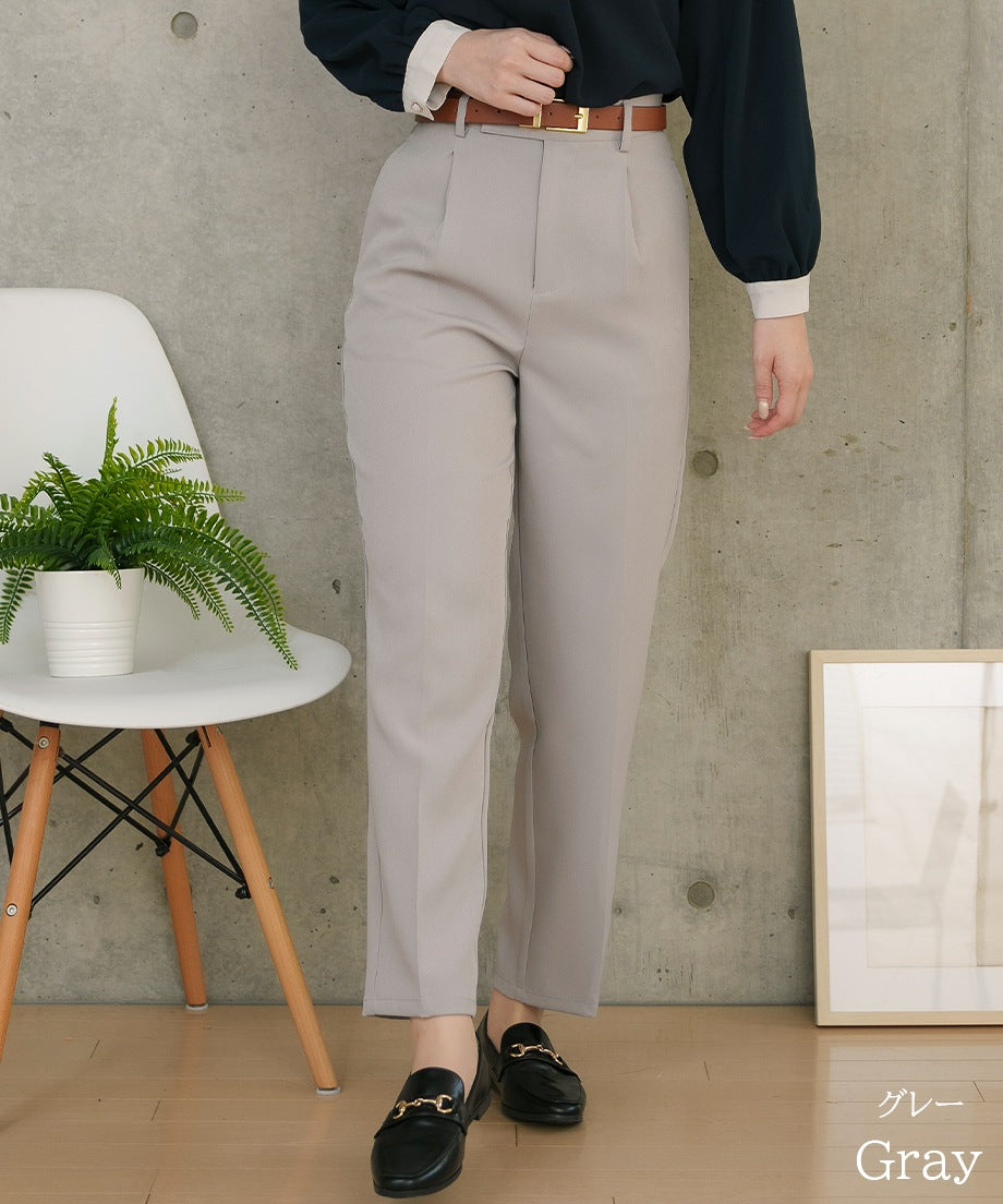 透過摺褶設計,腰部看起來更加俐落,適合各種身型。此外,向下逐漸變細的錐形剪裁在提供時尚印象的同時,也確保了活動的靈活性。從高跟鞋到運動鞋,各種鞋款都能搭配,因此在多種場合中都能發揮作用。對於經常外出拜訪的業務人員來說,能搭配運動鞋的下裝非常實用呢♪