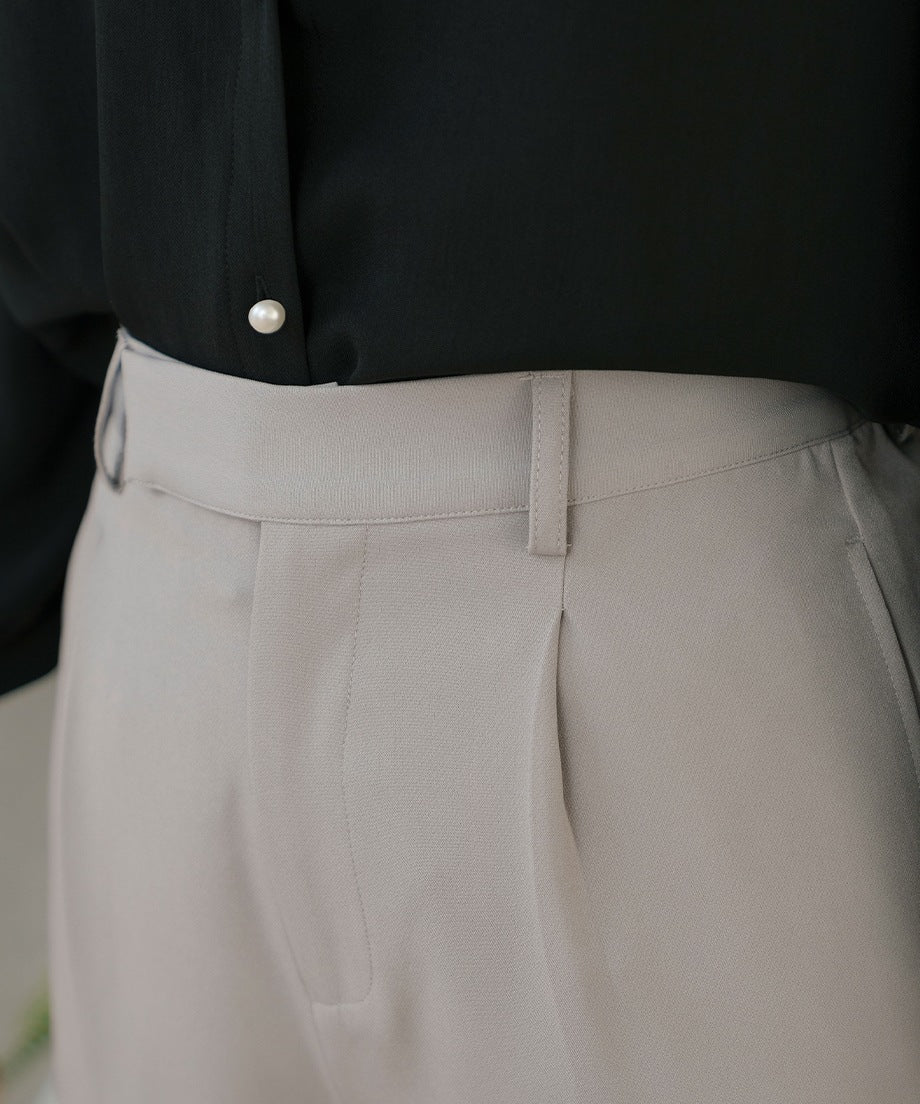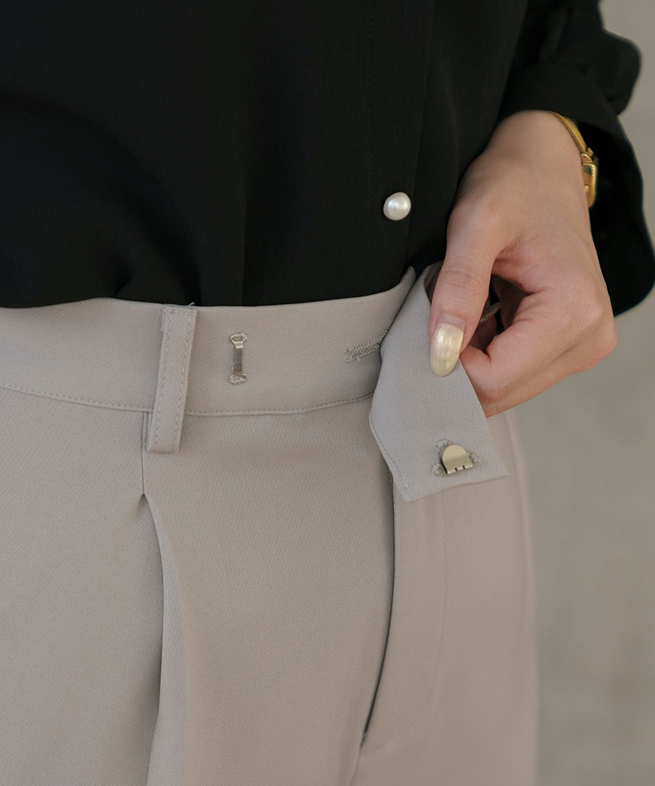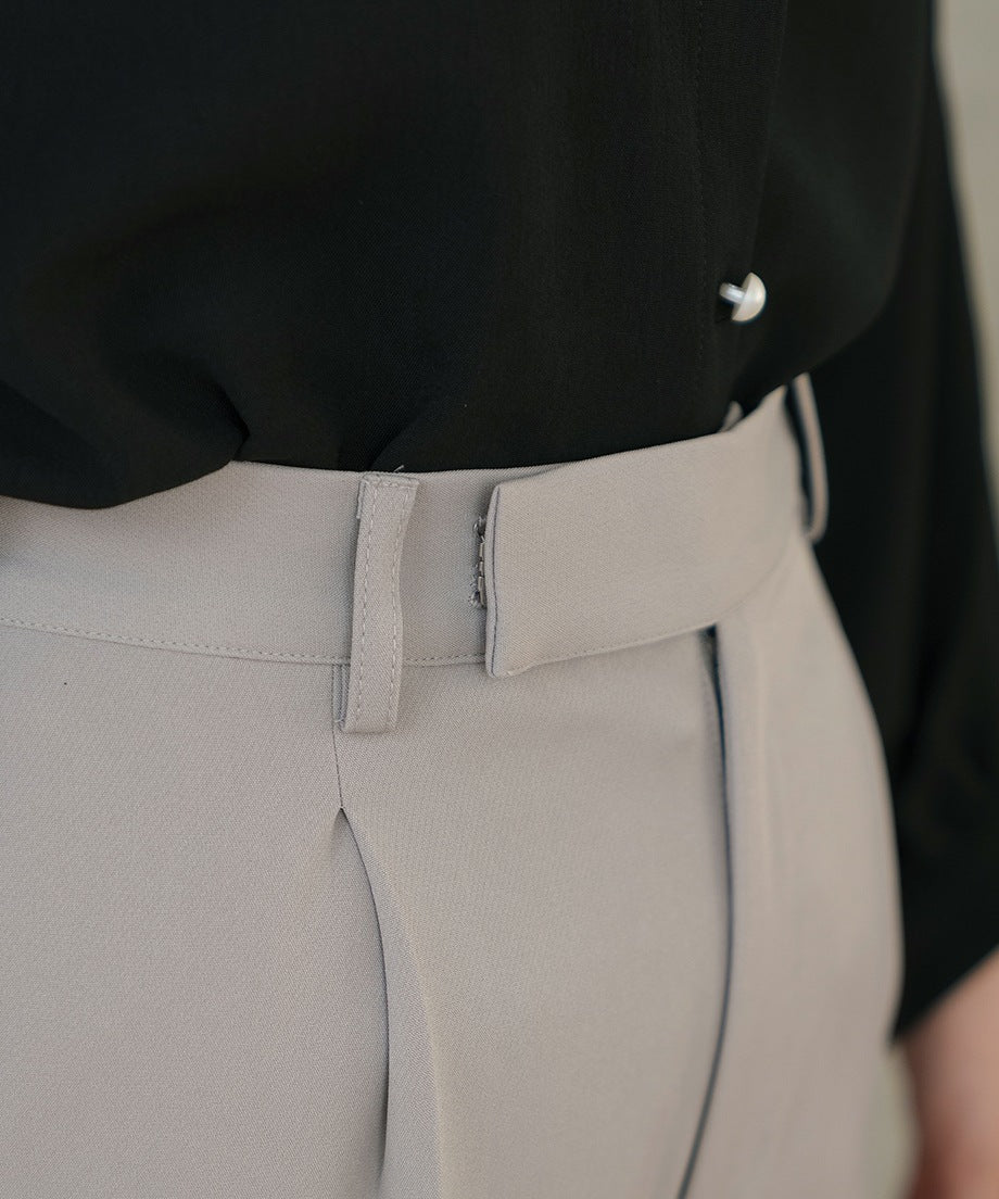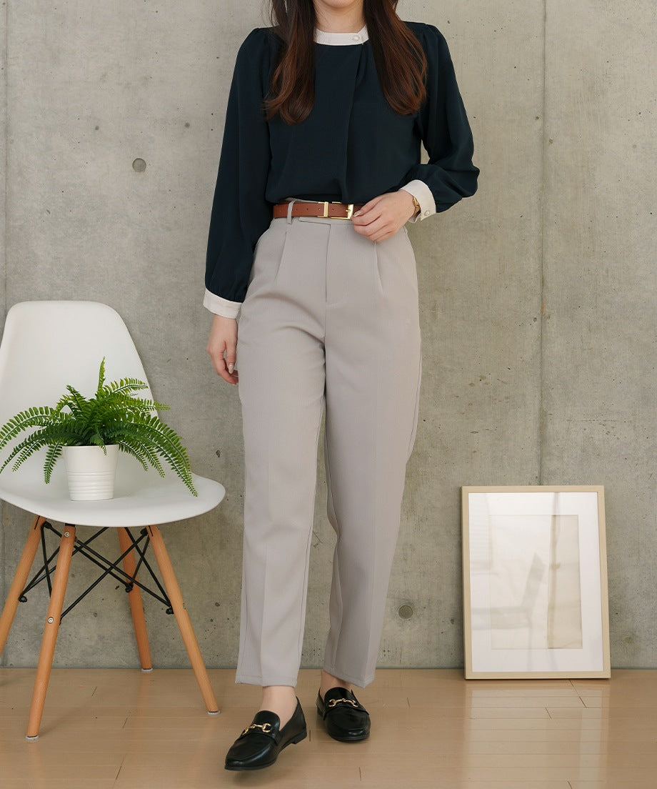 透過摺褶設計,腰部看起來更加俐落,適合各種身型。此外,向下逐漸變細的錐形剪裁在提供時尚印象的同時,也確保了活動的靈活性。從高跟鞋到運動鞋,各種鞋款都能搭配,因此在多種場合中都能發揮作用。對於經常外出拜訪的業務人員來說,能搭配運動鞋的下裝非常實用呢♪