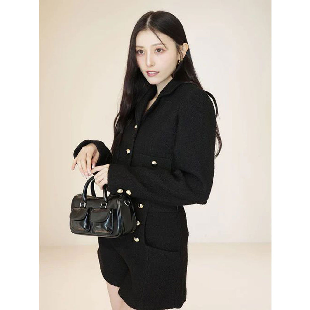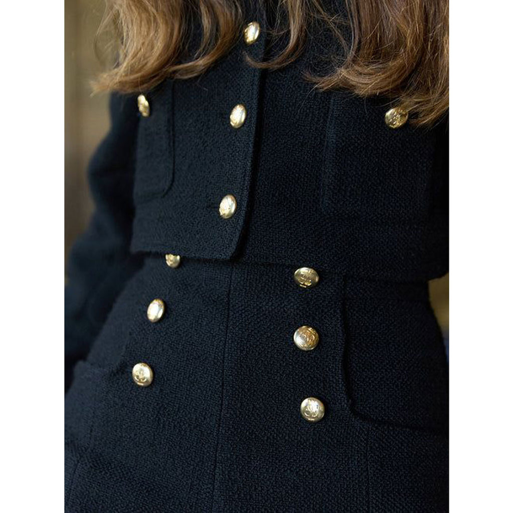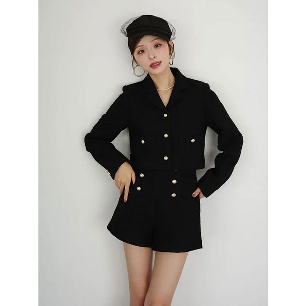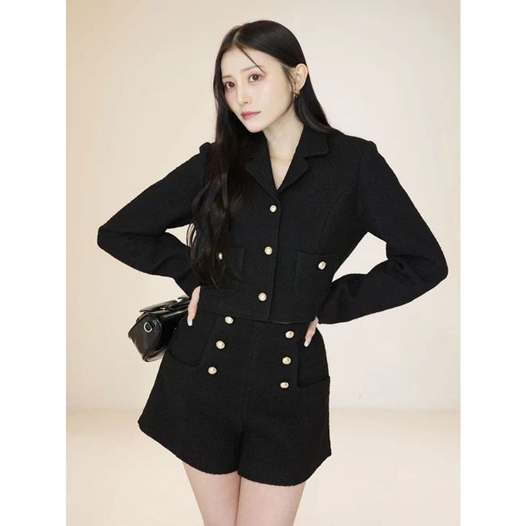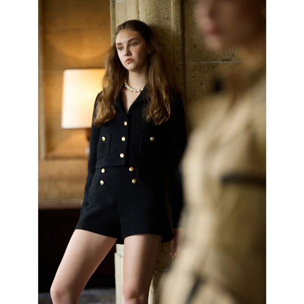 經典的呢料材質,搭配金色鈕扣的短版外套。