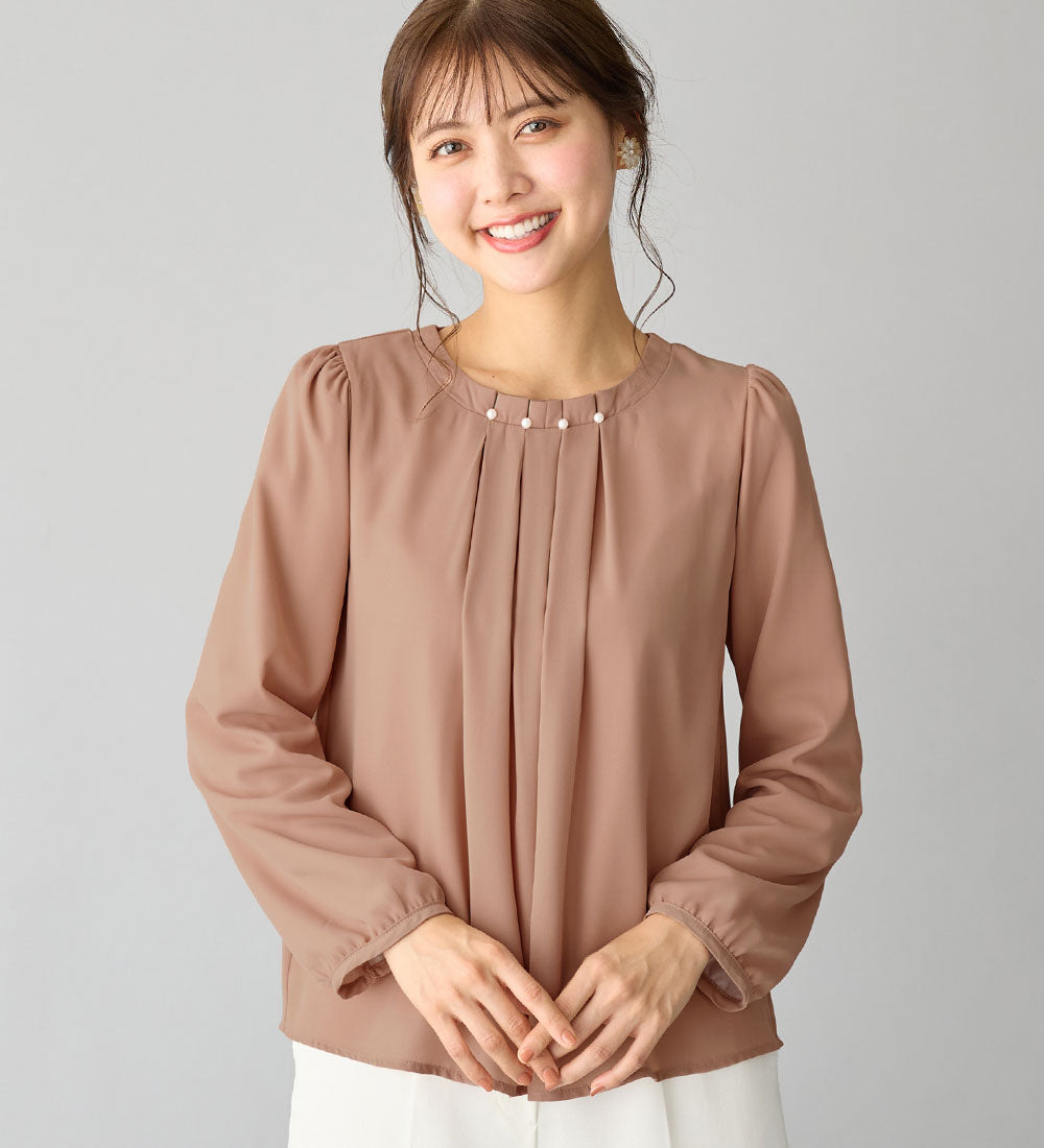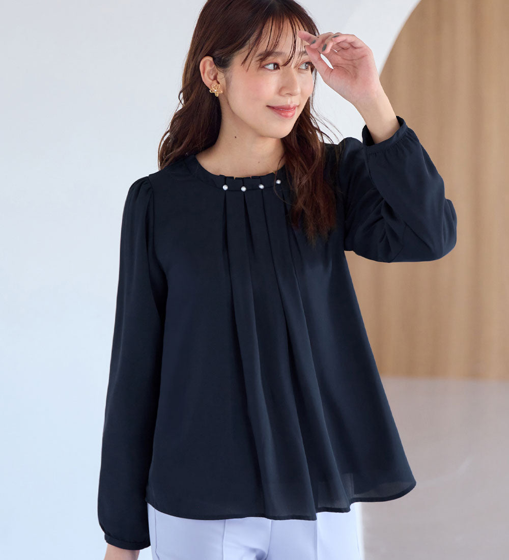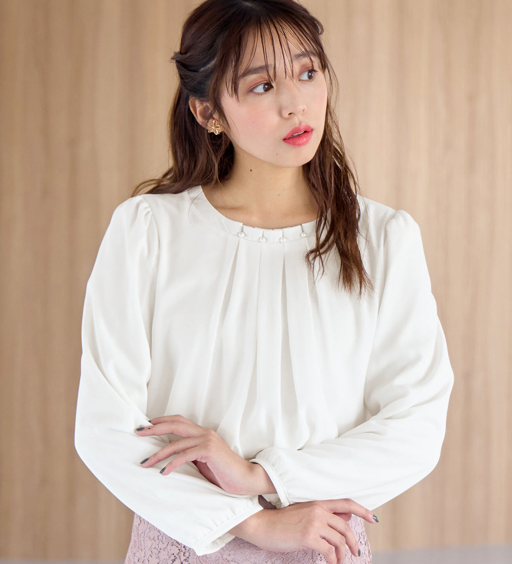 大人優雅的胸前摺褶與珍珠設計襯衫。