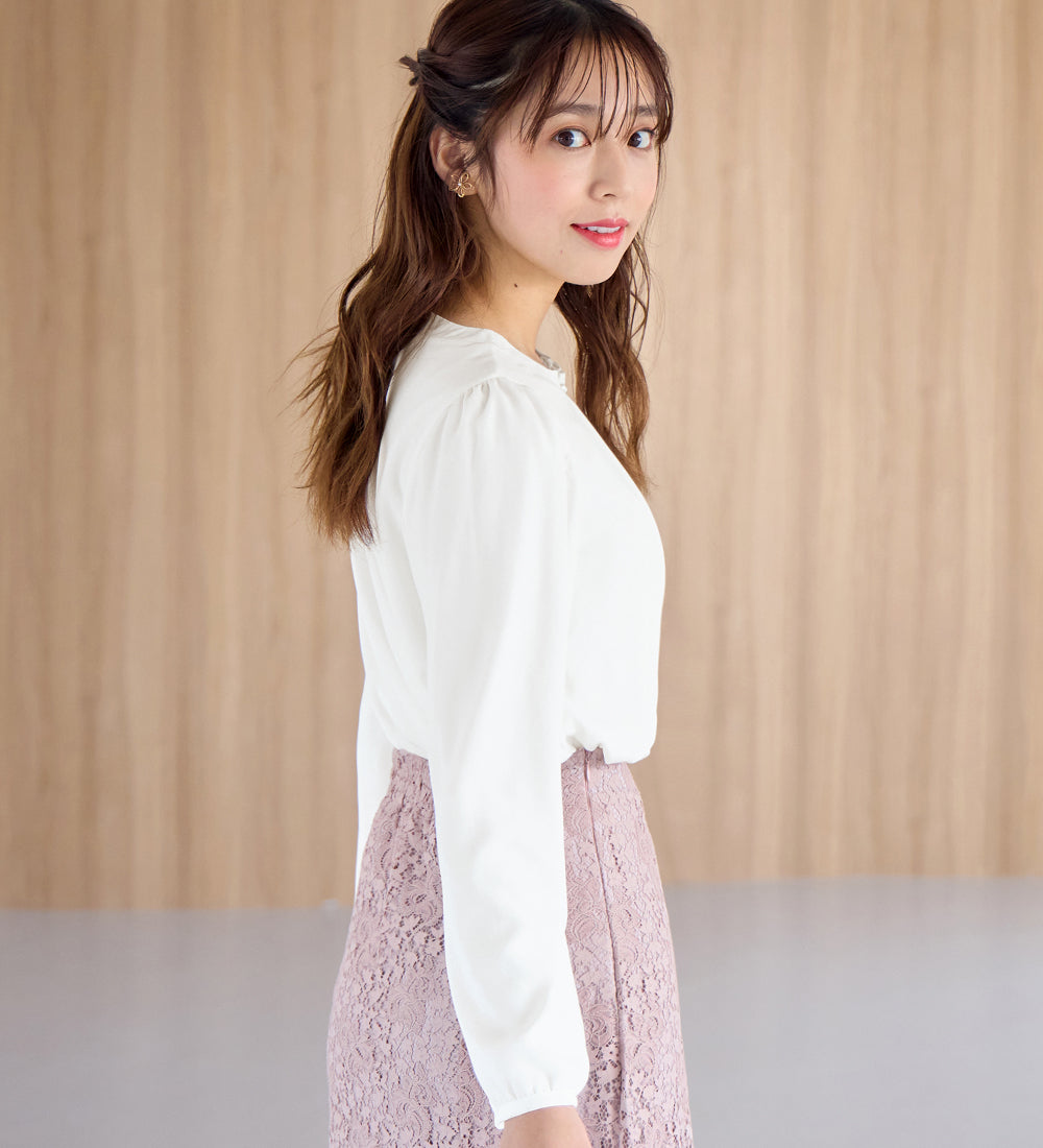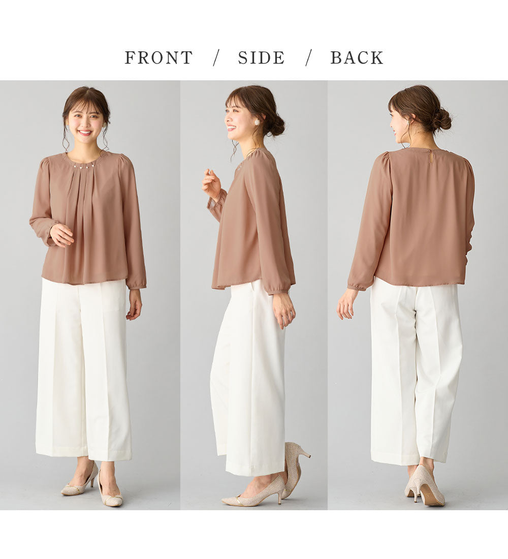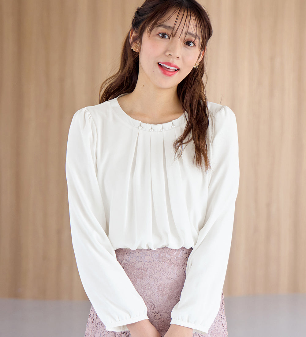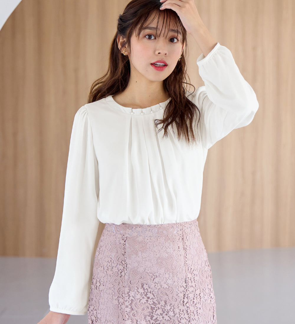 大人優雅的胸前摺褶與珍珠設計襯衫。