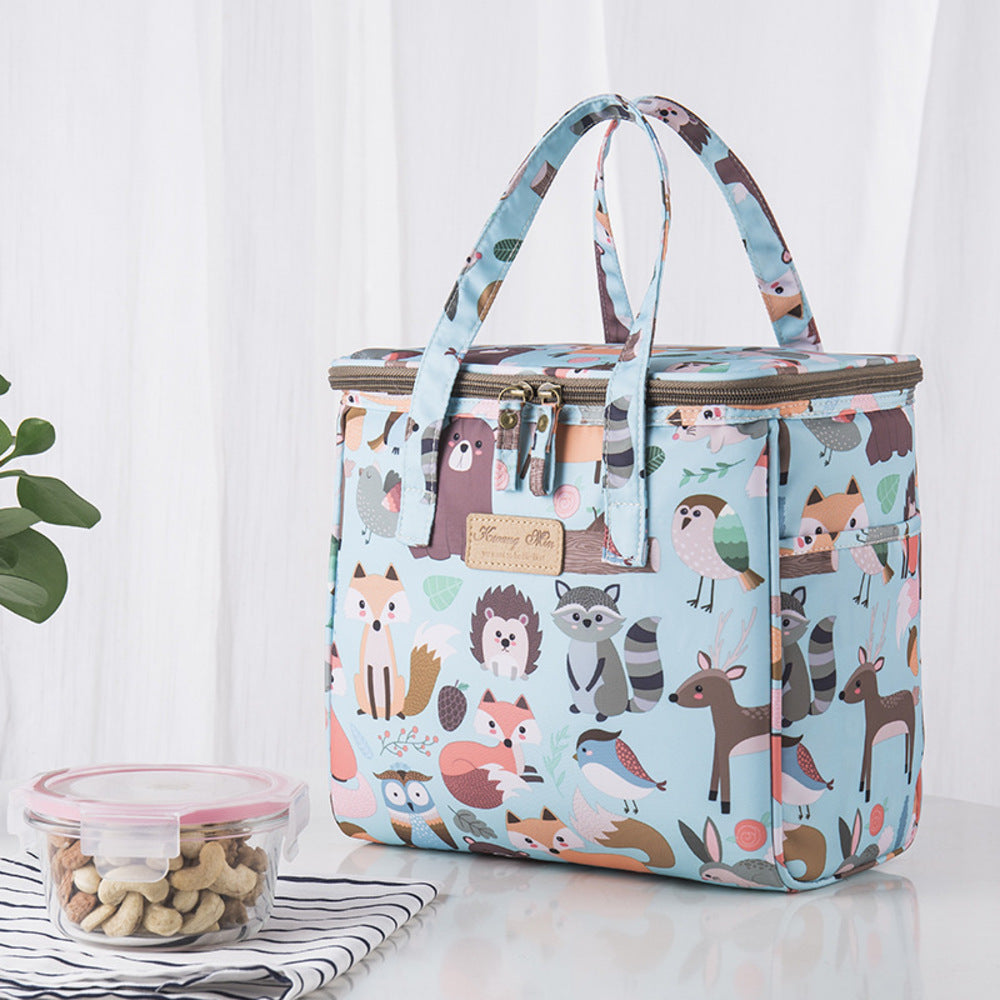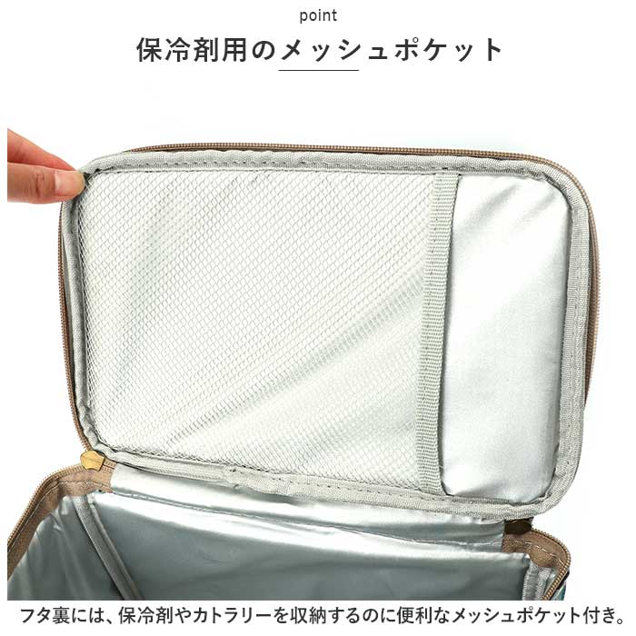 午餐時間的熱鬧動物與植物設計!全新登場的「保溫保冷午餐包」,在活動和戶外中大放異彩。【容量充足的方形造型】清爽的方形設計,午餐盒可縱向堆疊2~3層,500ml的瓶裝水可橫放而不會倒。 【隔熱海綿保持冷卻效果持久】包內部材質內建隔熱效果的海綿材料。若將保冷劑放入包內,午餐時間前便可保持便當的美味。 【輕鬆取出圓形拉鍊】包的開口處呈U型大開,雙拉鍊設計使得午餐和飲料的取出變得輕鬆。緊緊閉合不漏冷氣是重點!【輕輕一擦即可輕鬆清潔】內部材質使用具有防水效果的銀色塗層纖維。小污垢或飲料的溢出也能輕鬆擦拭,保養簡單。 【保冷劑用的網狀口袋】蓋子內側設有方便存放保冷劑或餐具的網狀口袋。 【便利的外側口袋】包的右側面設有一個適當深度的開放口袋。濕紙巾、毛巾或手機等小物品也能輕鬆取出!【防水加工面料】包的表面也採用防水加工的尼龍面料,無論是在外出時或戶外遇到突如其來的雨都能安心。 【使用方式隨你而定】不僅作為午餐包,還能在超市購買生鮮食品或甜點時使用,或在戶外運輸食材時也能大派用場。 【全家人都能使用的設計】色彩繽紛的「動物圖案」和優雅的「植物圖案」,從孩子到太太都能使用的設計。賞櫻、野餐、運動會的加油也能用喜愛的圖案更加有趣。【口袋配置】[包內側] 網狀口袋×1 [包右側面] 開放口袋×1
