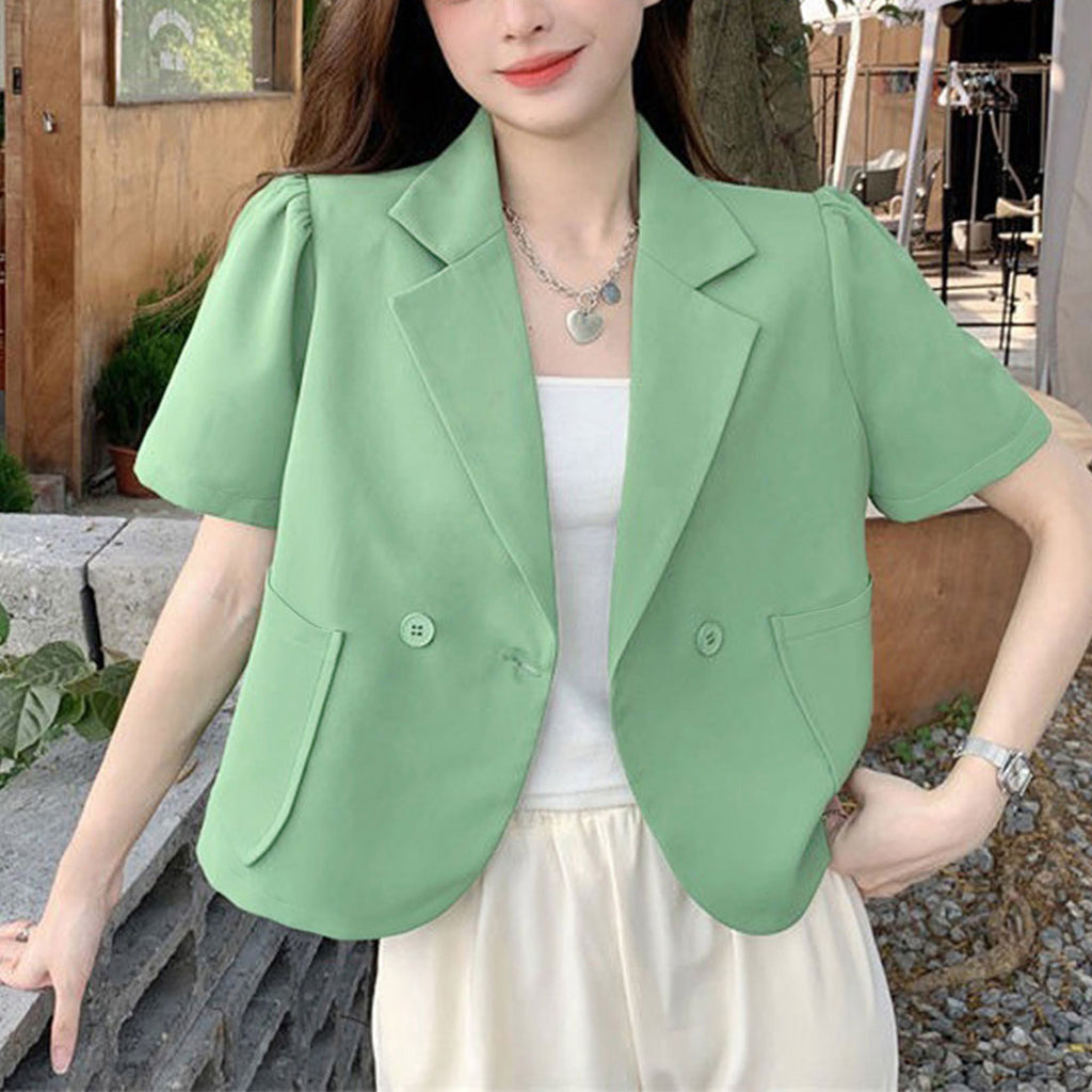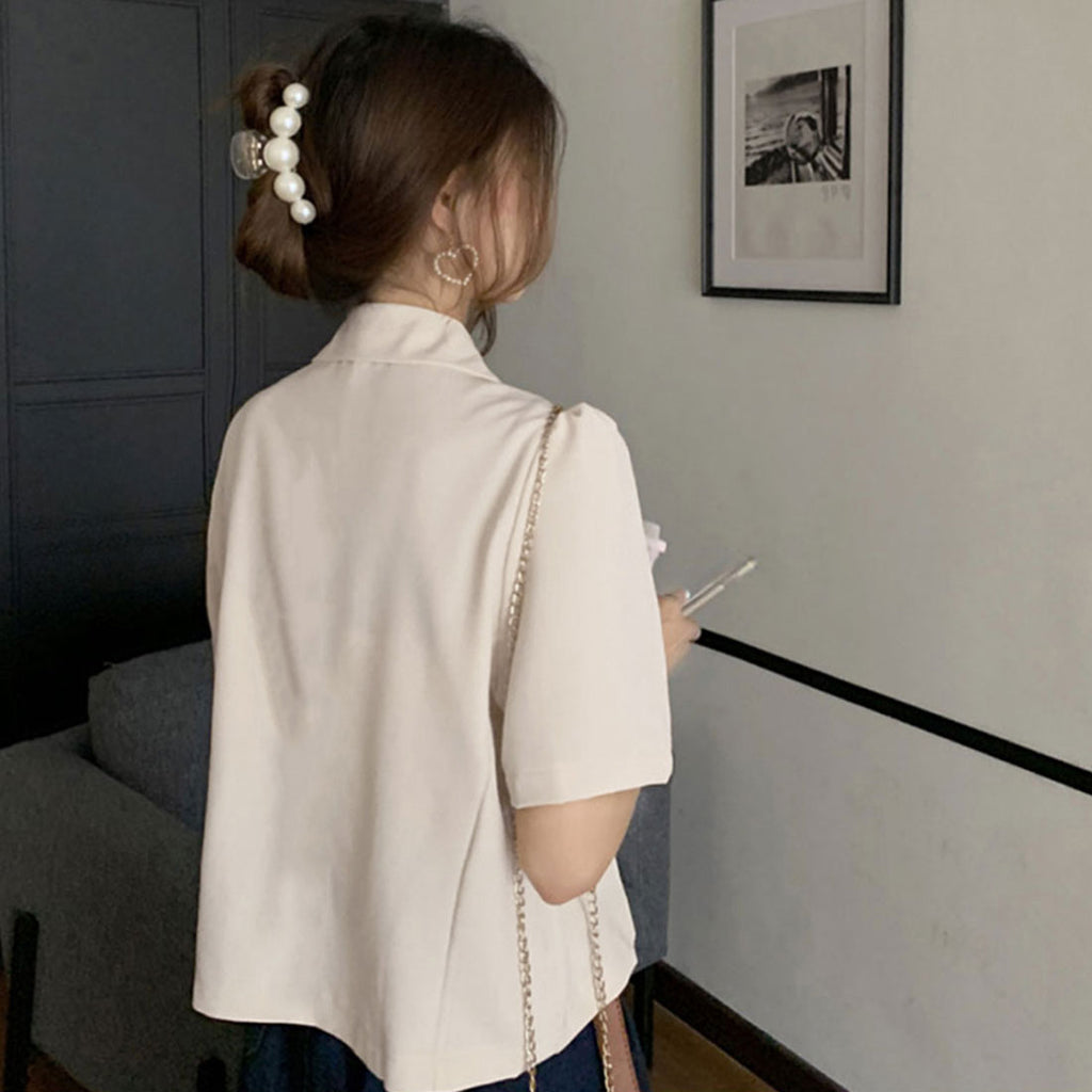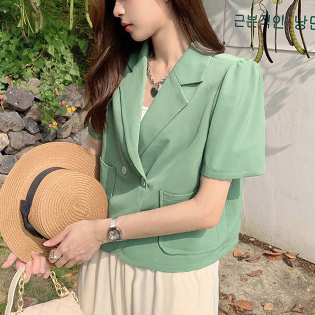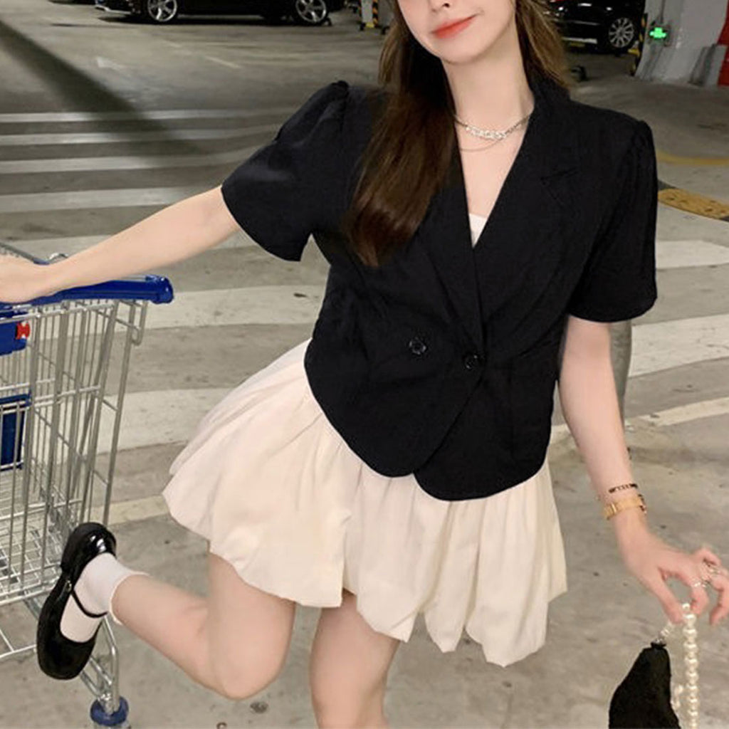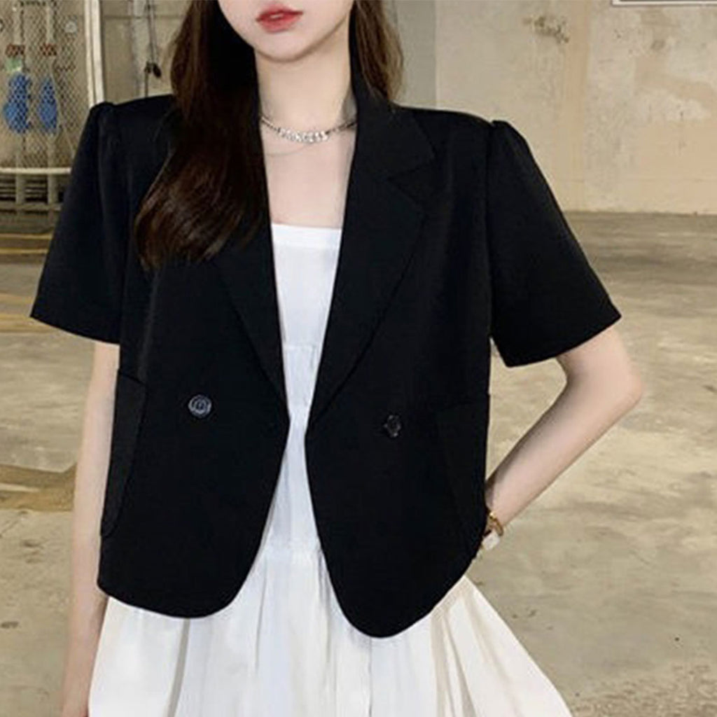 短款西裝外套 薄款襯衫外套 V領 短款春夏外套 帶領子輕便外套 韓國時尚夏季外搭 夏季夾克黑色