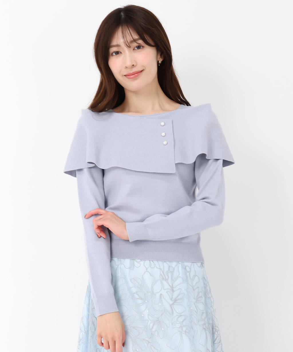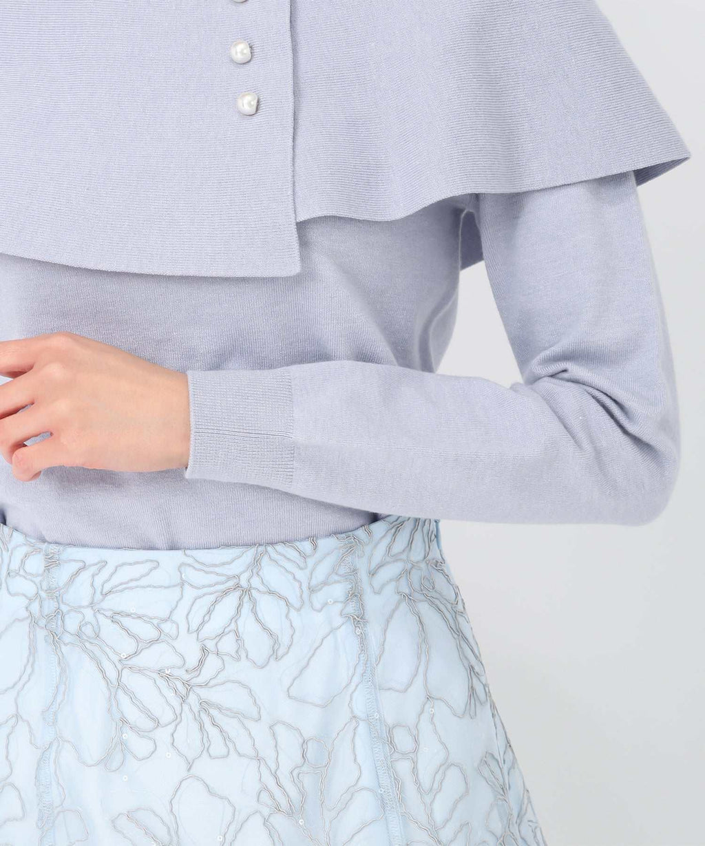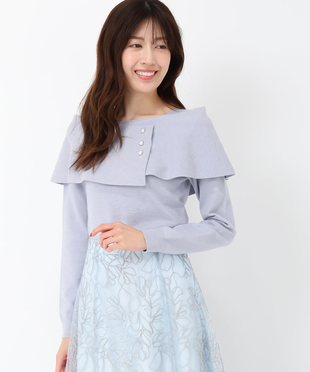 不對稱的斗篷上裝飾著珍珠鈕扣的針織品。