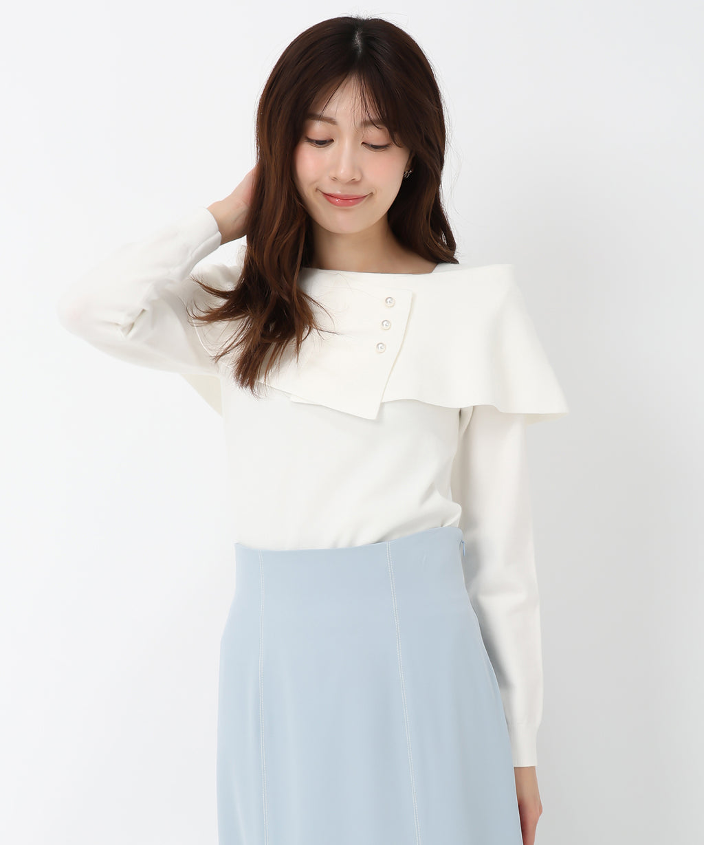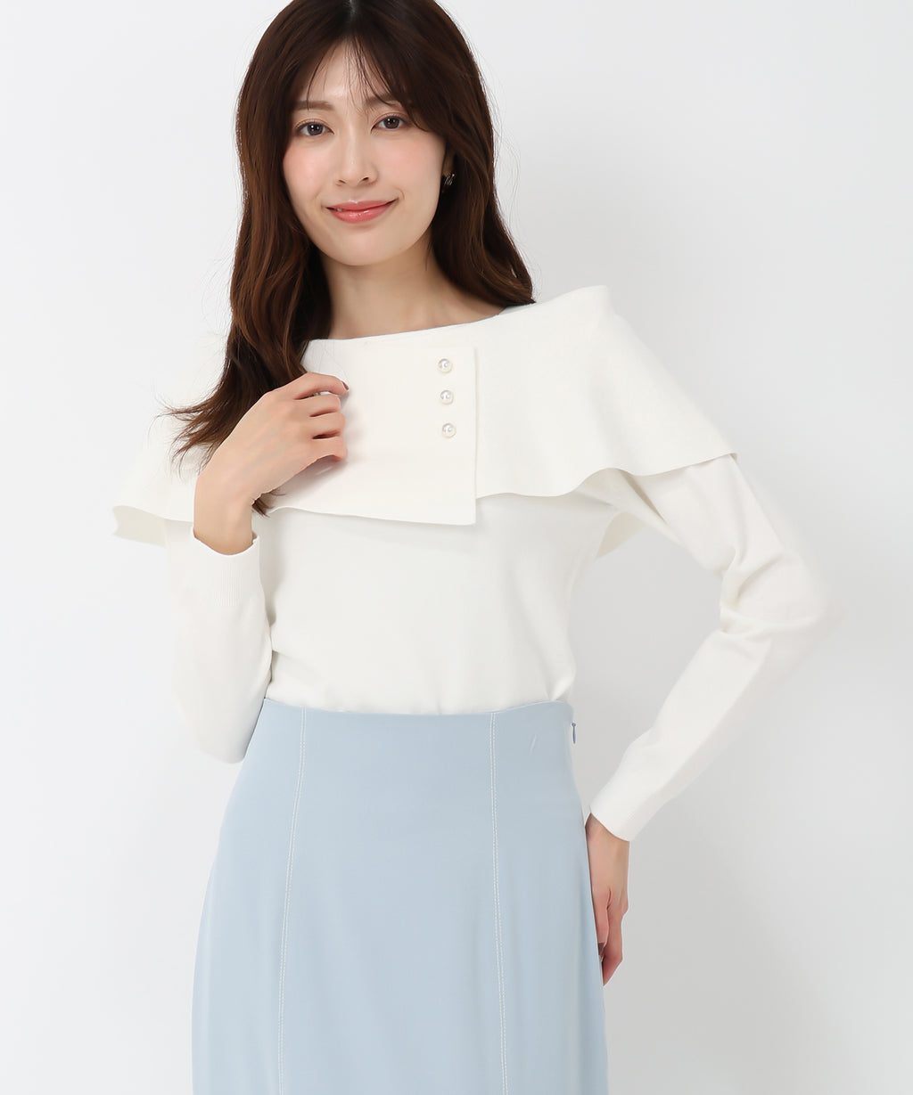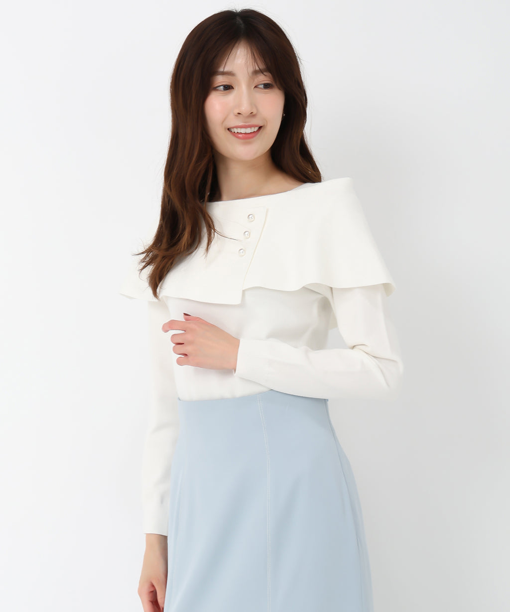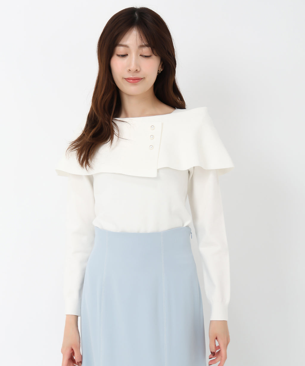 不對稱的斗篷上裝飾著珍珠鈕扣的針織品。