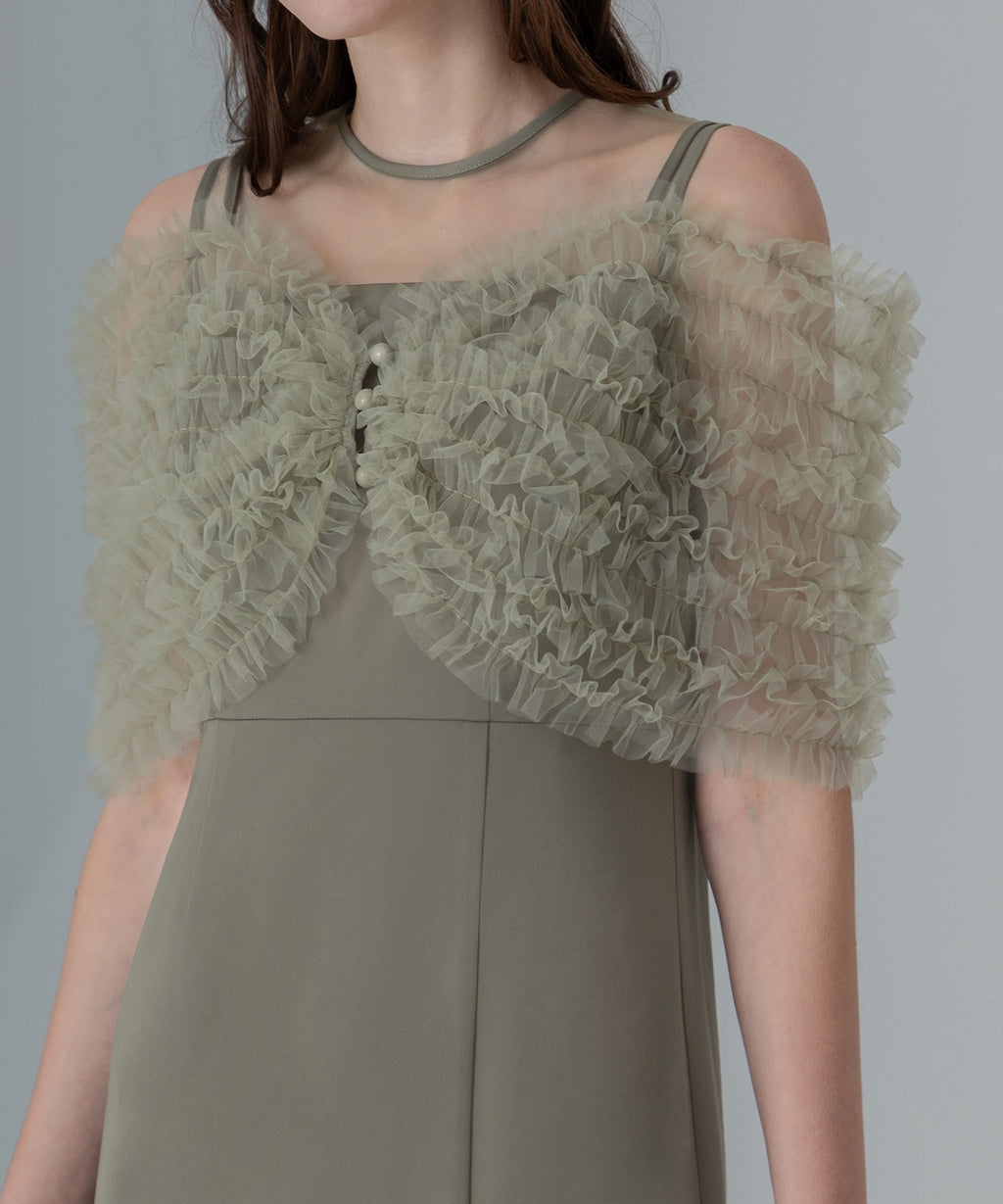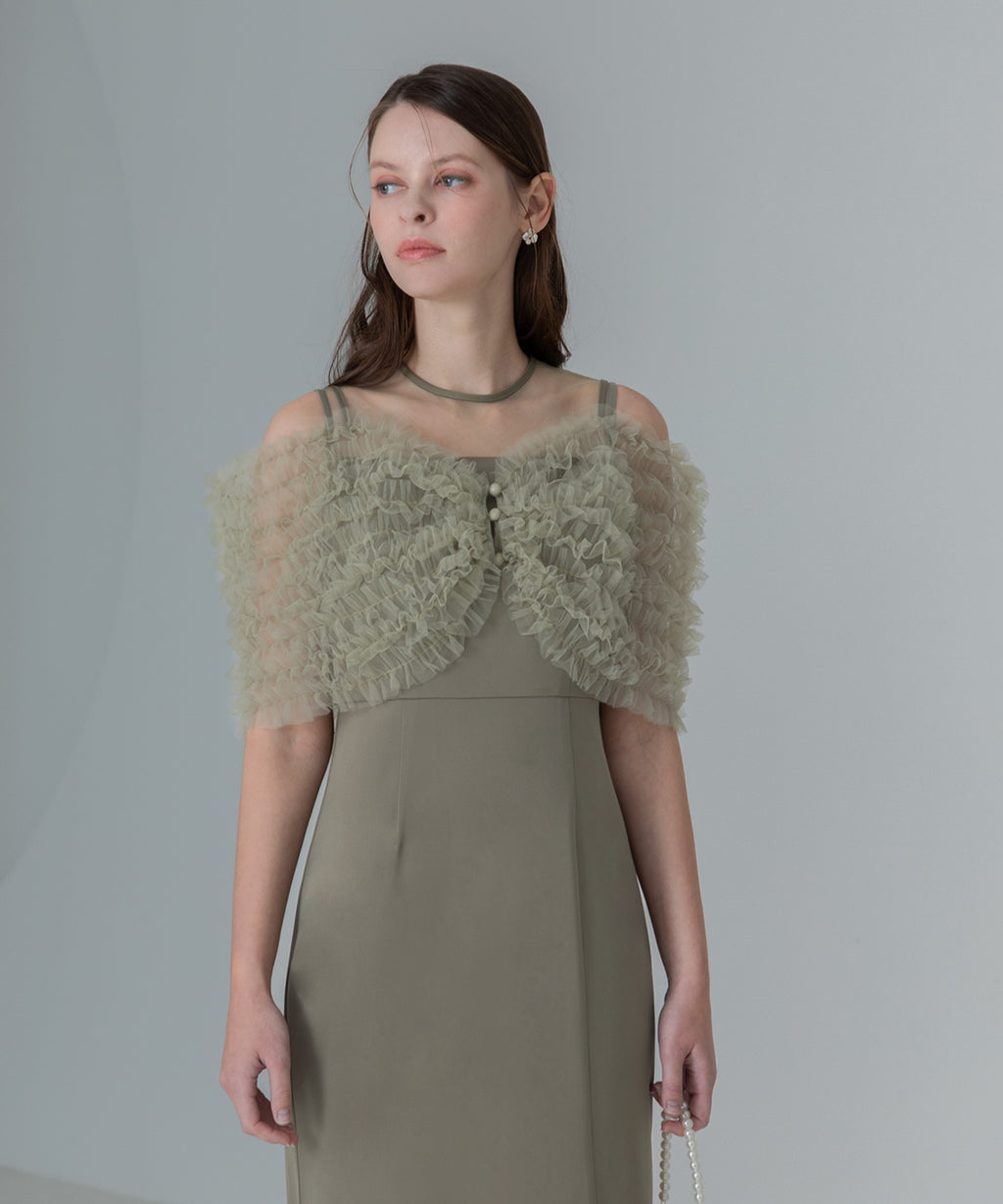 豐富的荷葉邊為臉部周圍增添華麗的色彩,並巧妙地遮掩二頭肌。