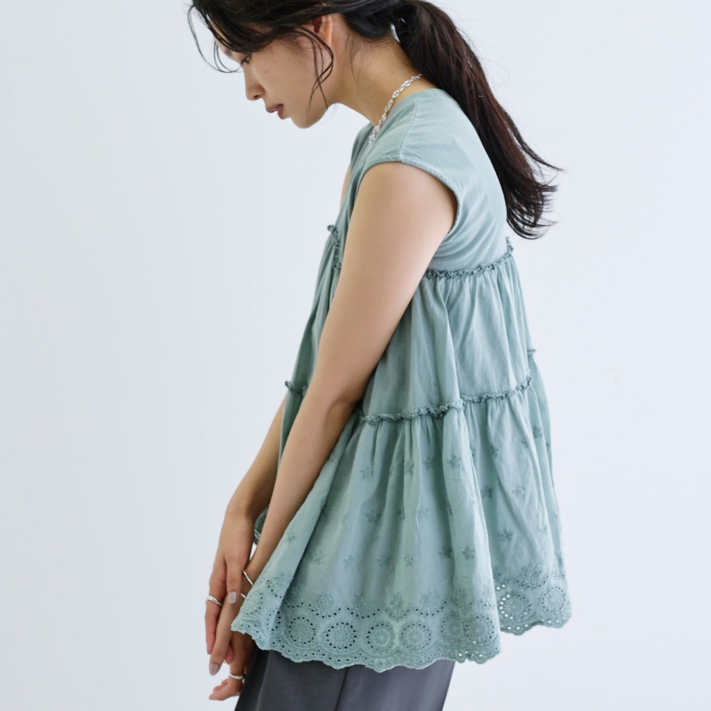本體:棉100% 蕾絲部分:棉90% 聚氨酯10% 布料部分:棉57% 再生纖維(纖維素)24% 人造絲19% 刺繡線:上線 棉100% 下線 棉100%