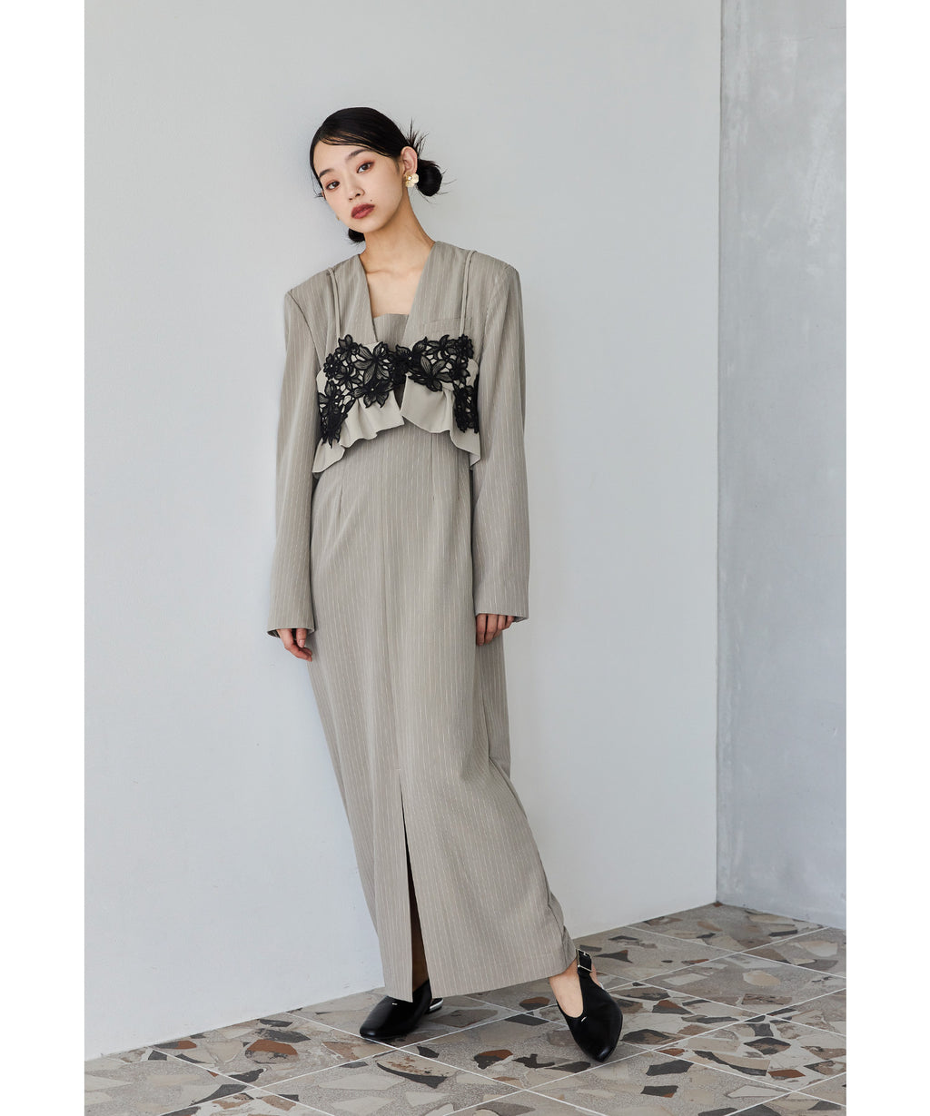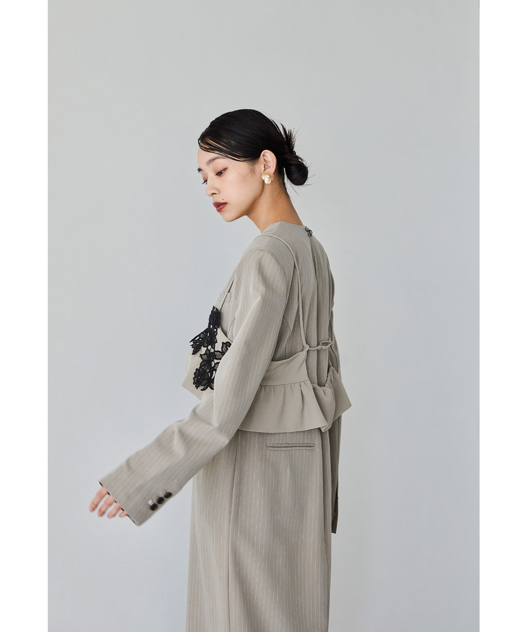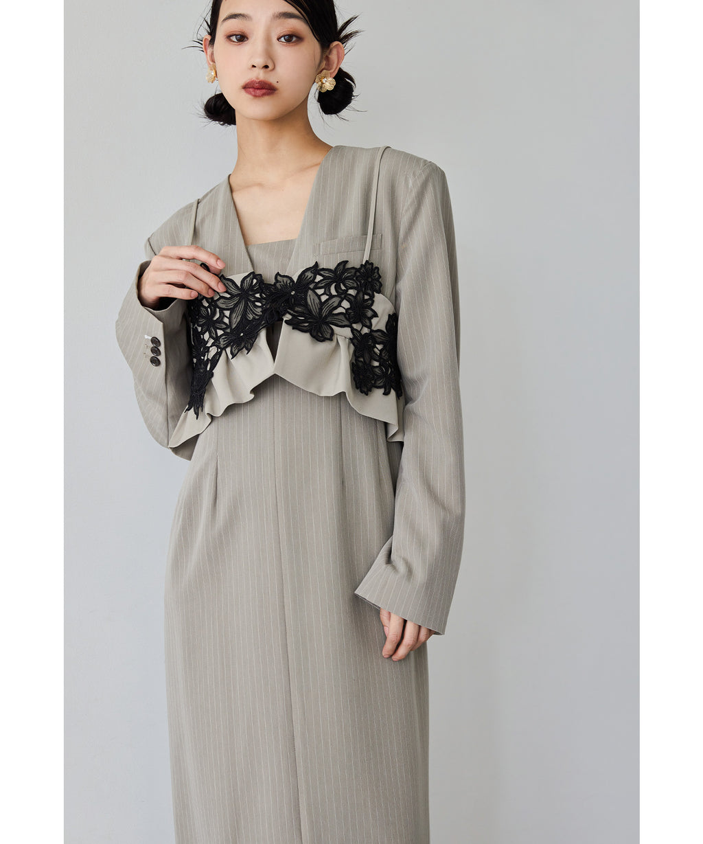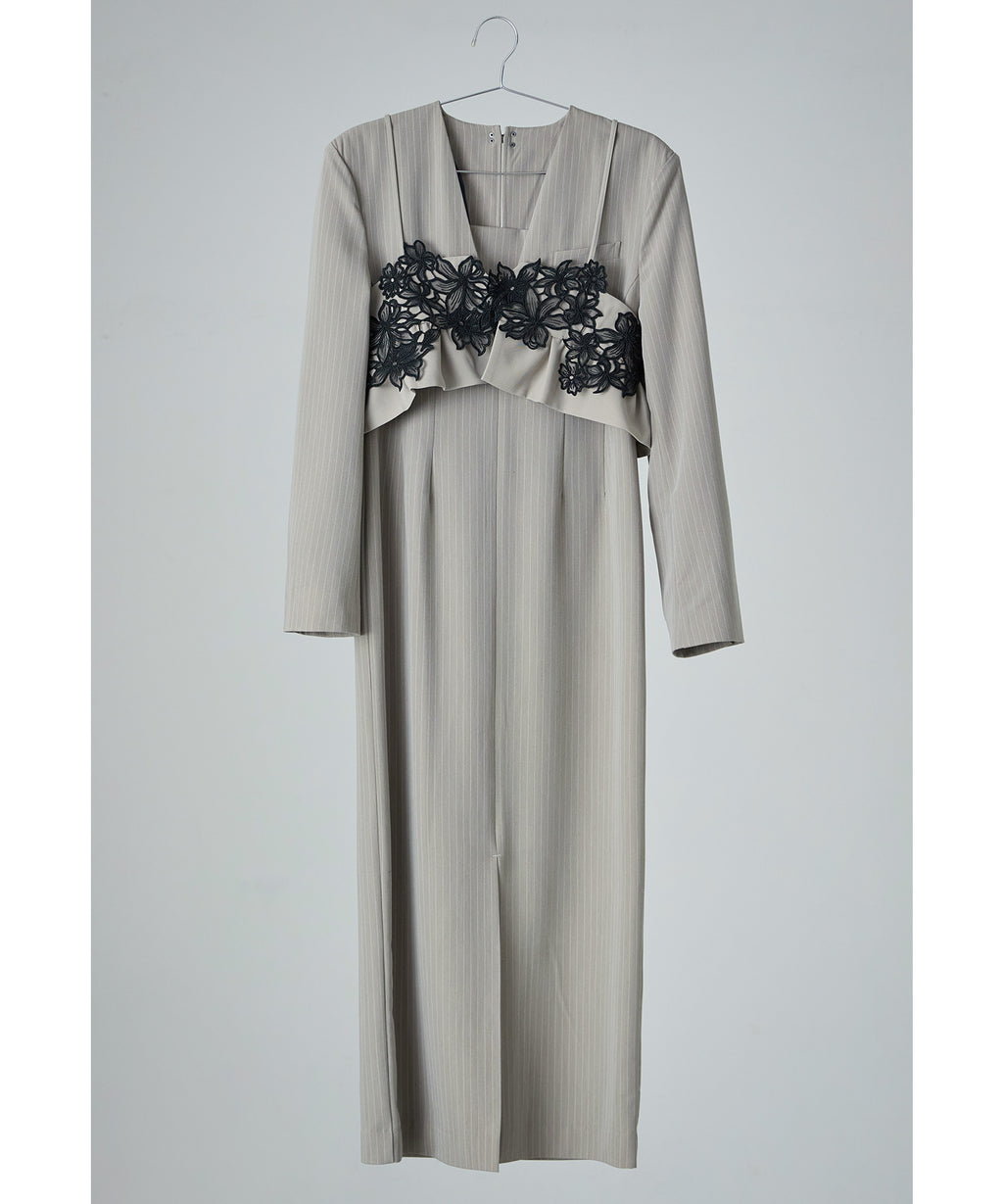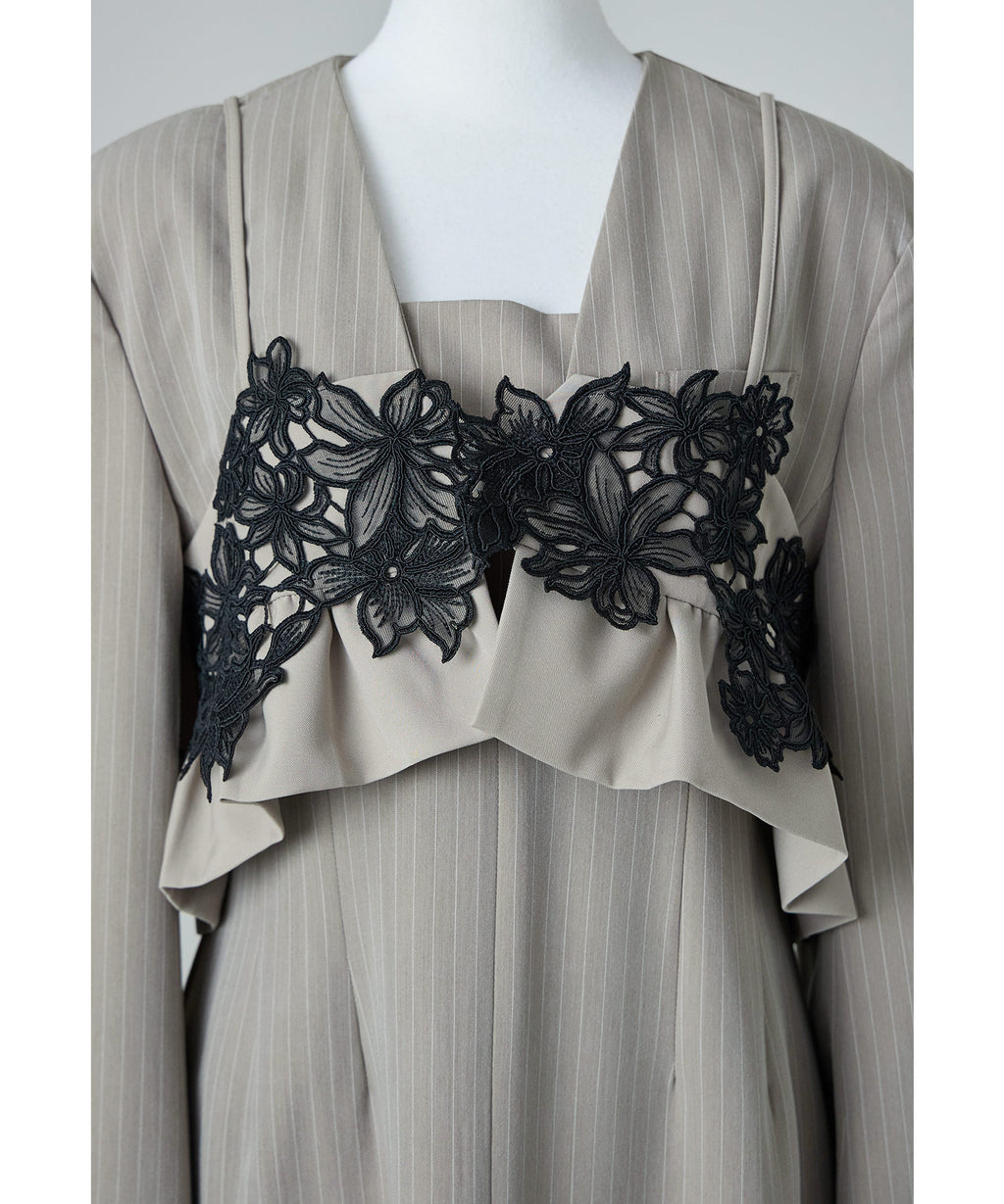 エレガントなフラワー刺繍レースを施したビスチェに、メンズライクな要素も入れたピンストライプ柄ドレスを組み合わせた2ピースセット。