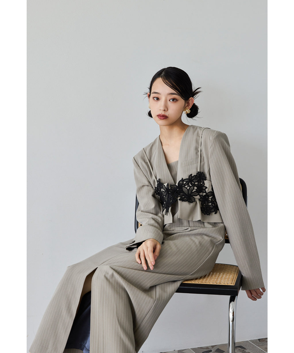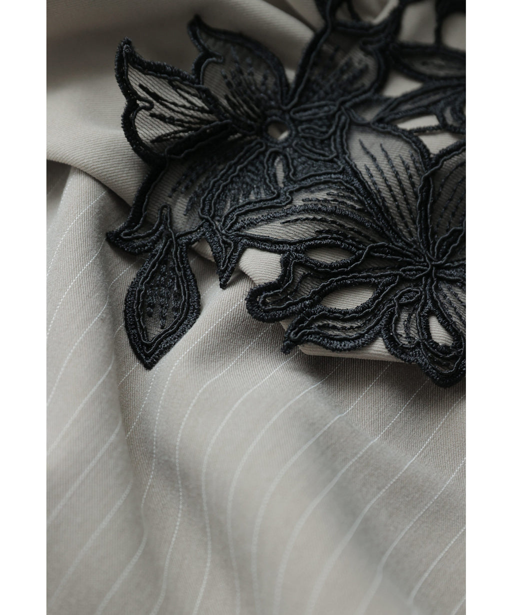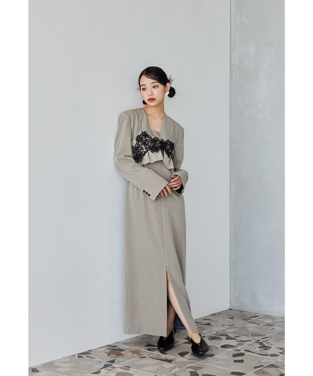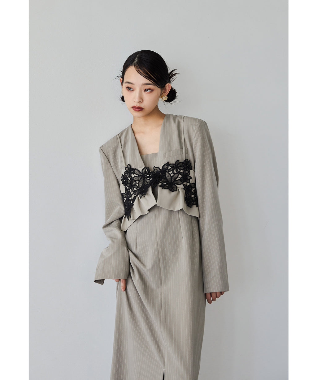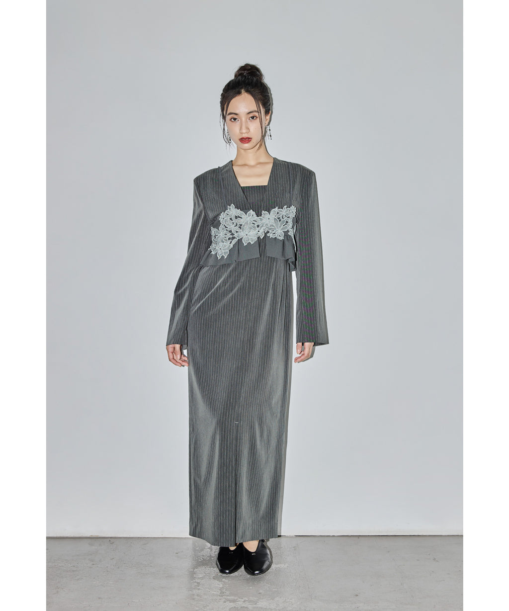 エレガントなフラワー刺繍レースを施したビスチェに、メンズライクな要素も入れたピンストライプ柄ドレスを組み合わせた2ピースセット。