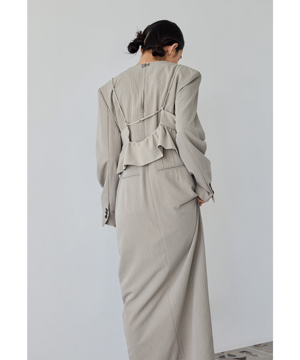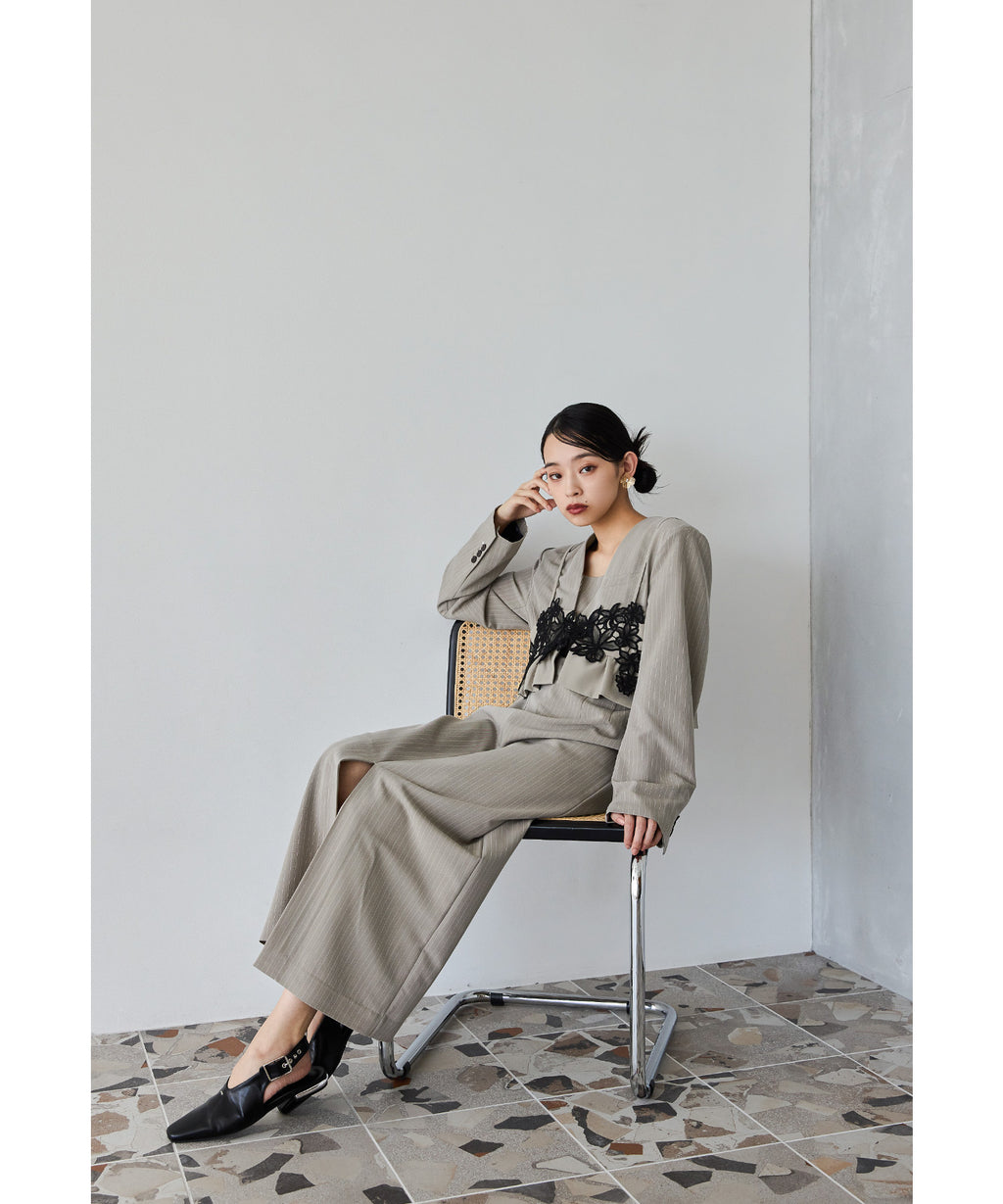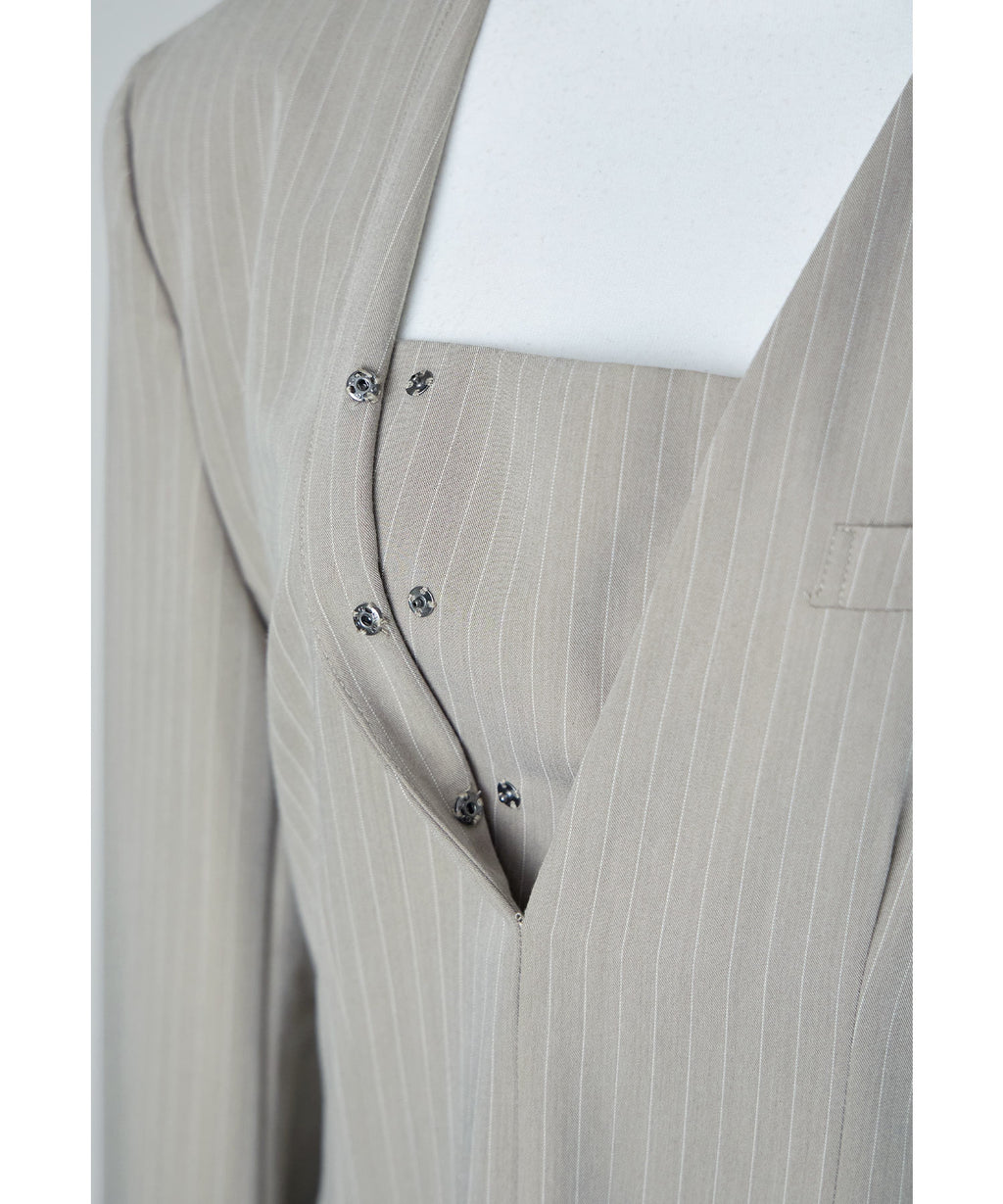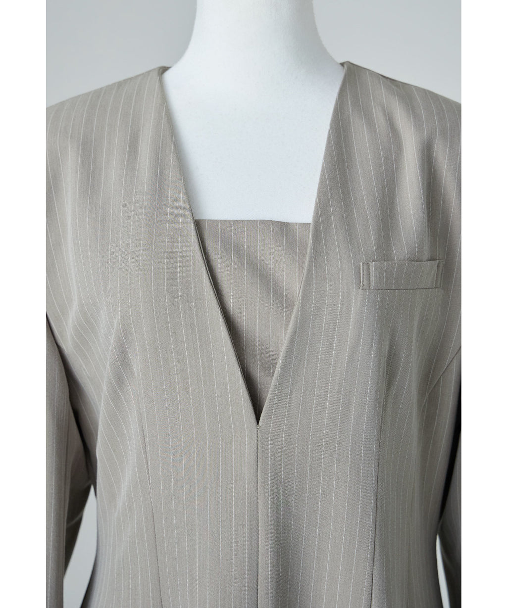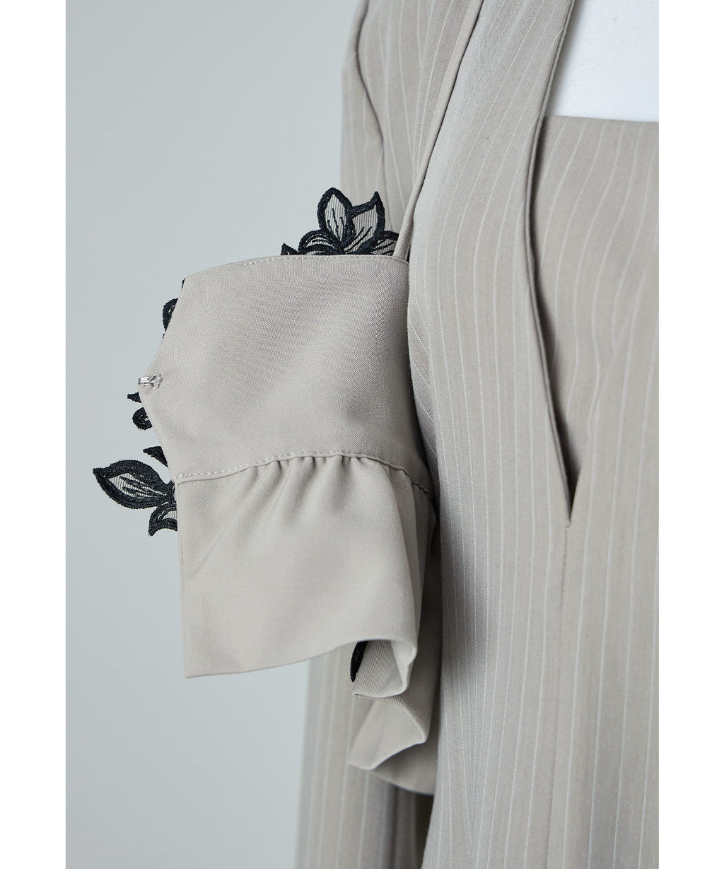 エレガントなフラワー刺繍レースを施したビスチェに、メンズライクな要素も入れたピンストライプ柄ドレスを組み合わせた2ピースセット。