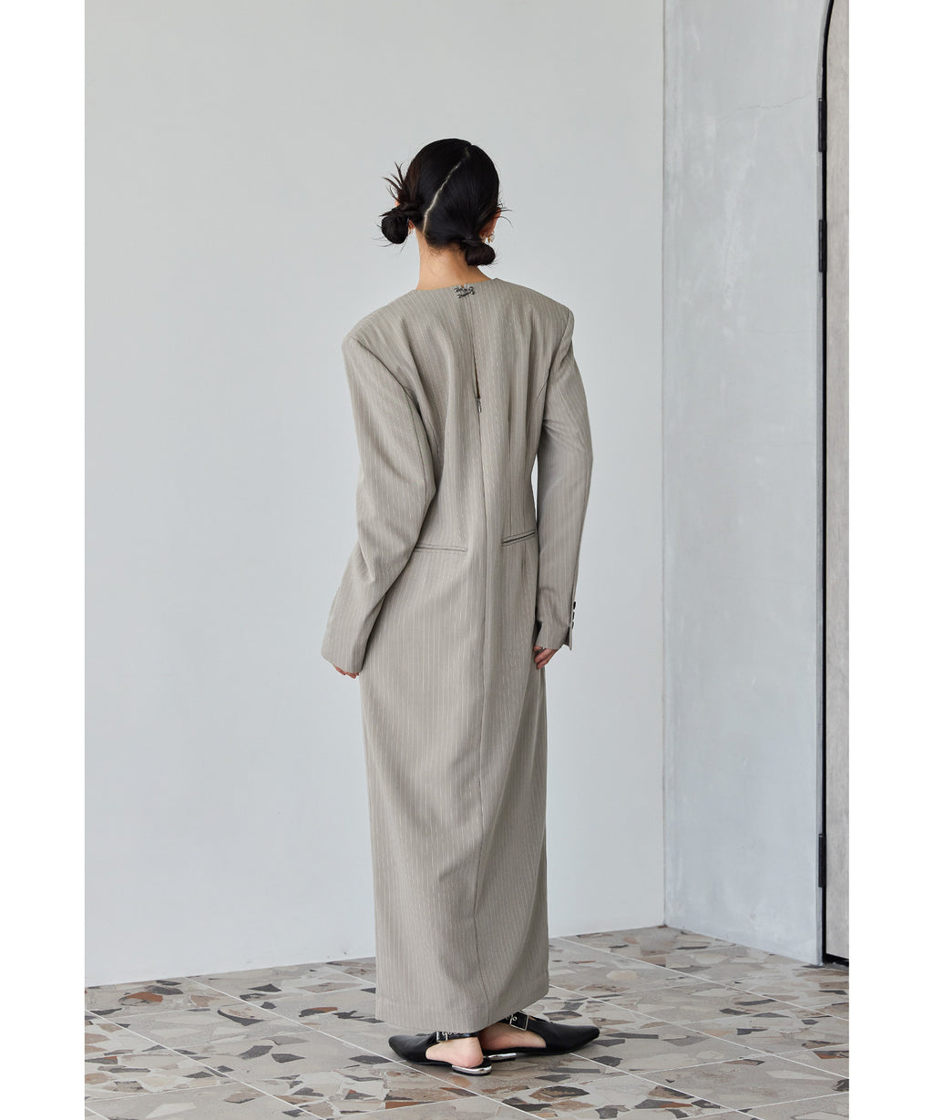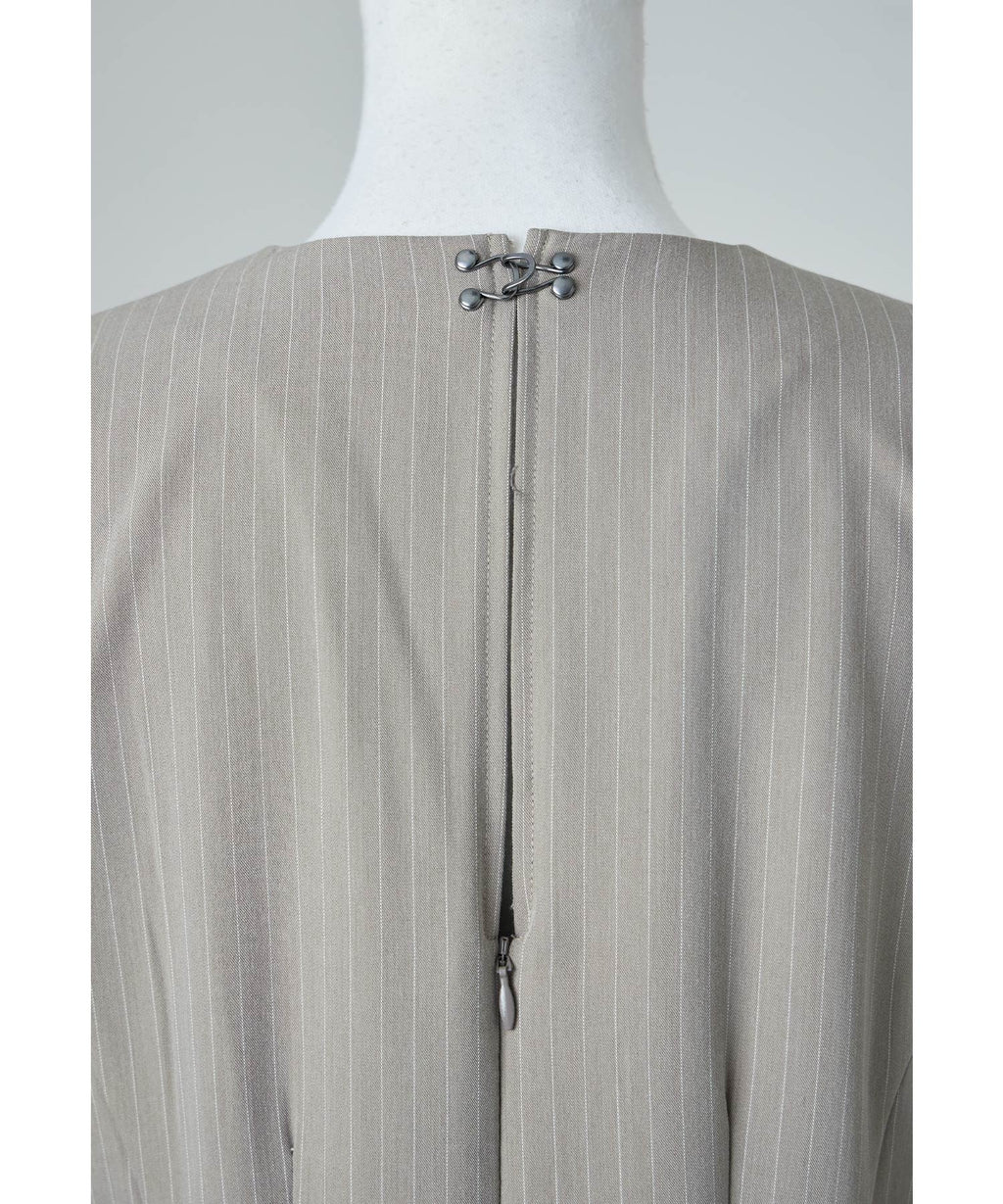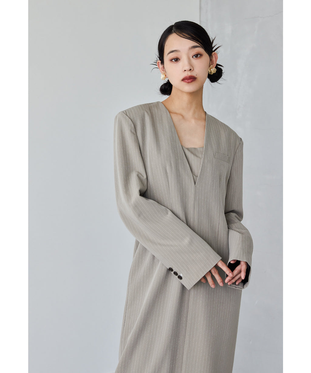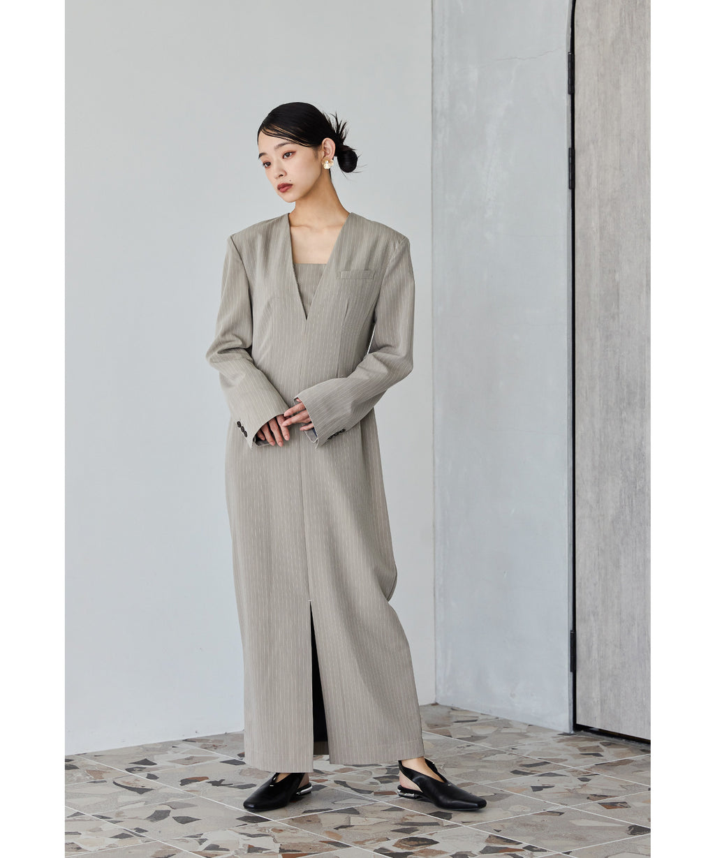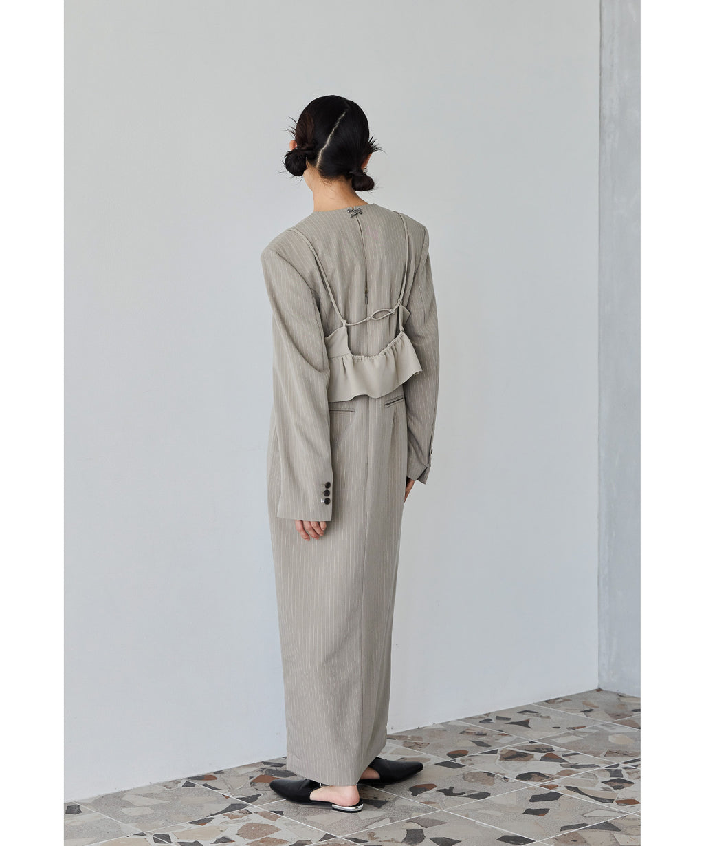 エレガントなフラワー刺繍レースを施したビスチェに、メンズライクな要素も入れたピンストライプ柄ドレスを組み合わせた2ピースセット。