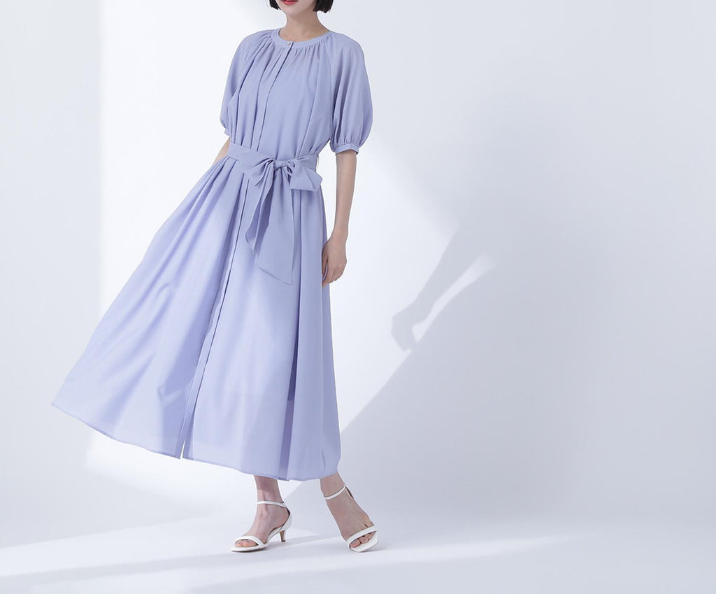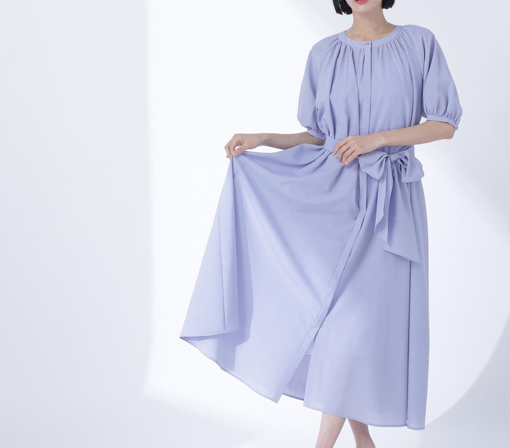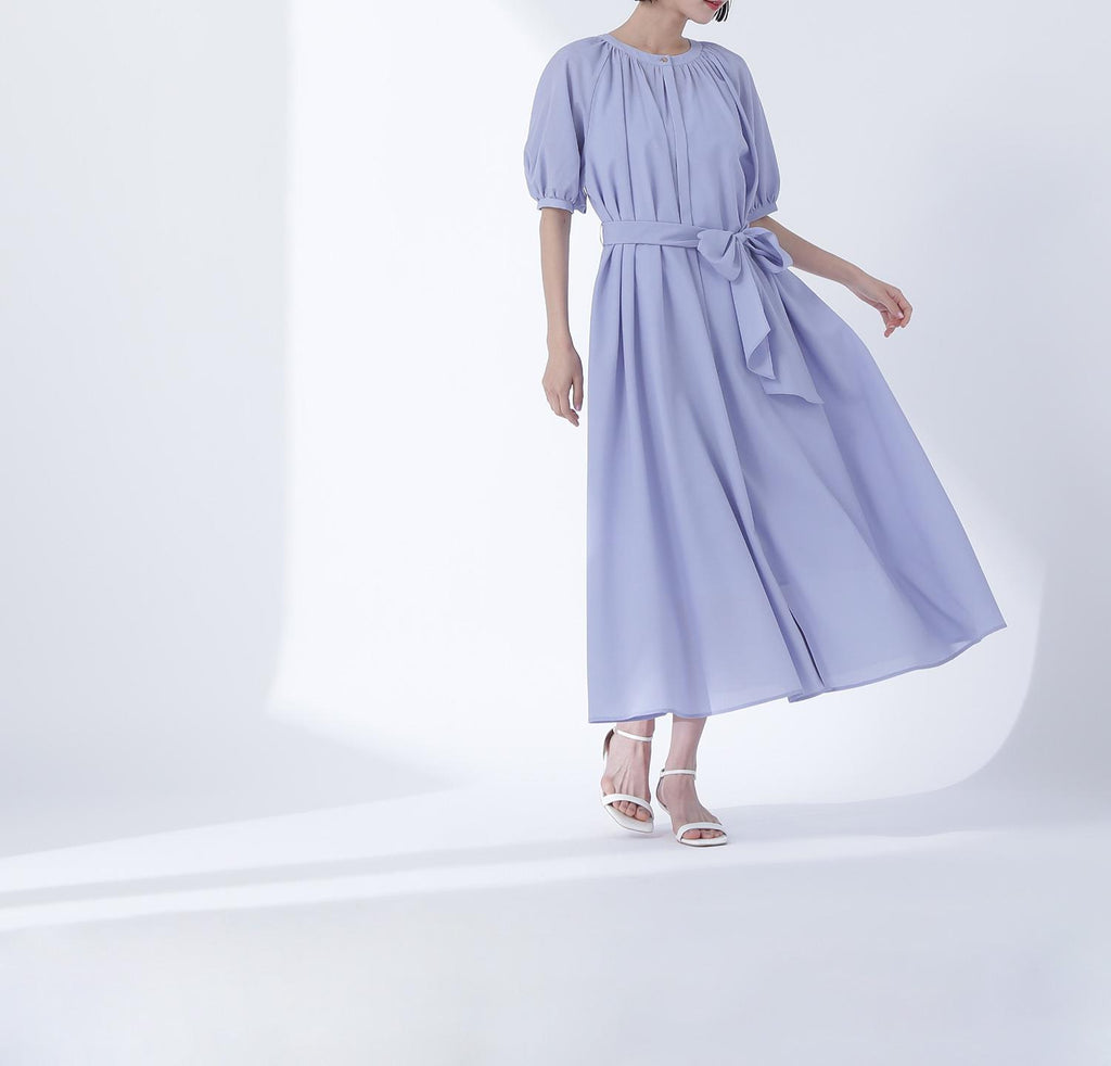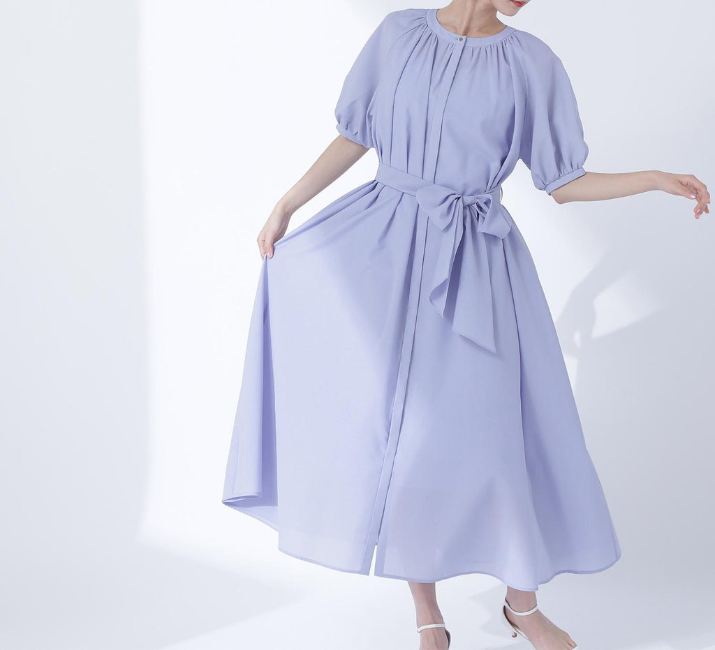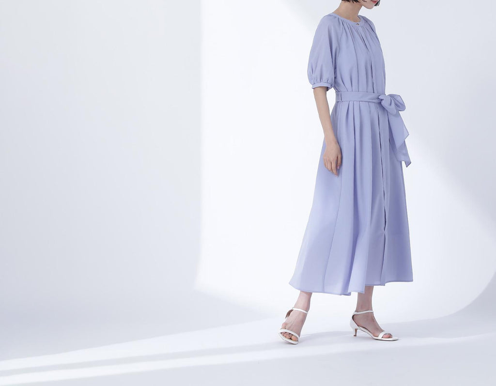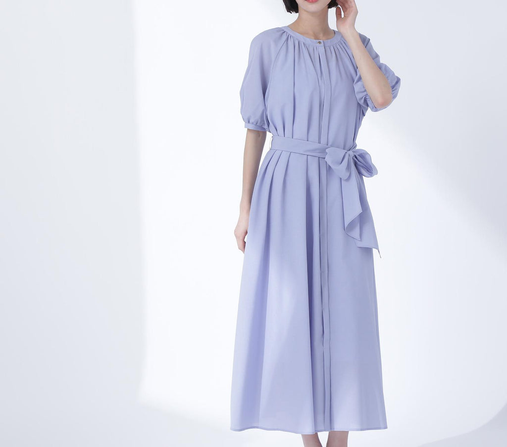 採用透視材質的帶腰帶連衣裙,建議在側面用同色系的絲帶打結來強調腰圍。若將同色系的腰帶取下,也可以作為休閒風格的寬鬆連衣裙穿著。前面採用比翼內扣設計,給人整潔的印象。裙擺寬度充裕,隨著動作輕輕擺動,營造出飄逸的輪廓。附有內搭背心連衣裙。