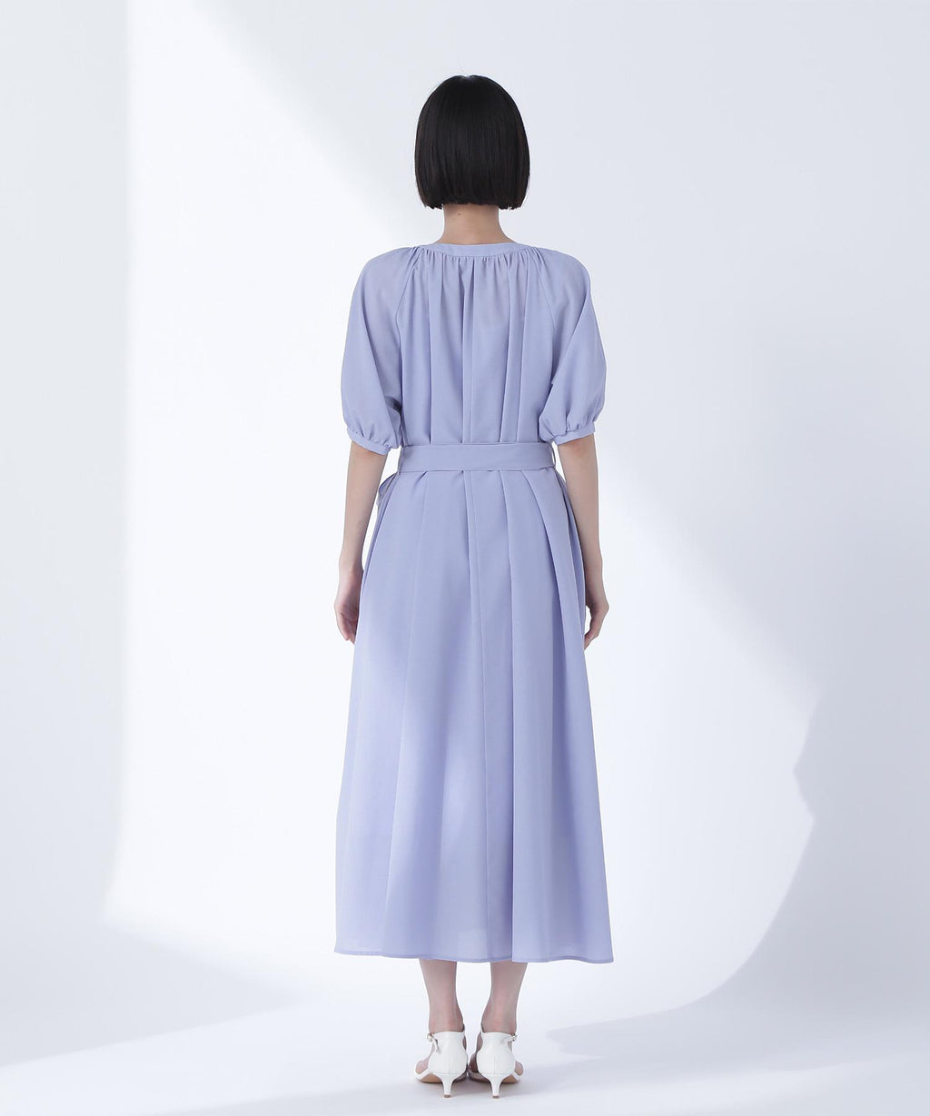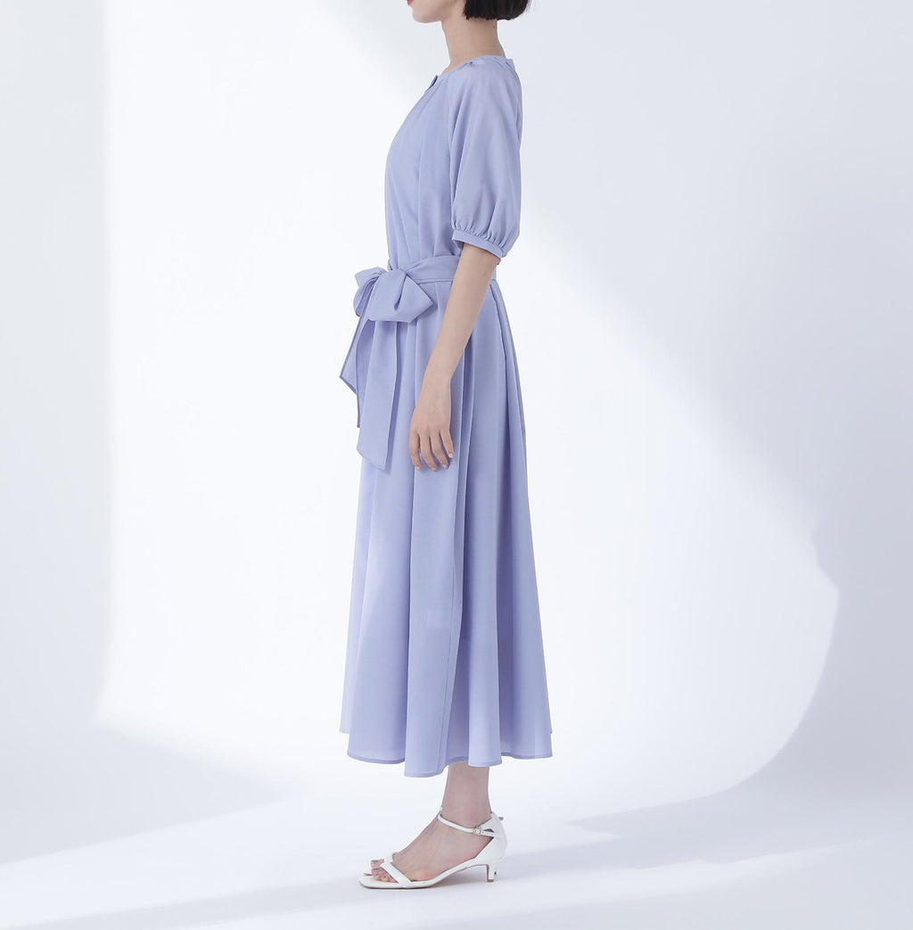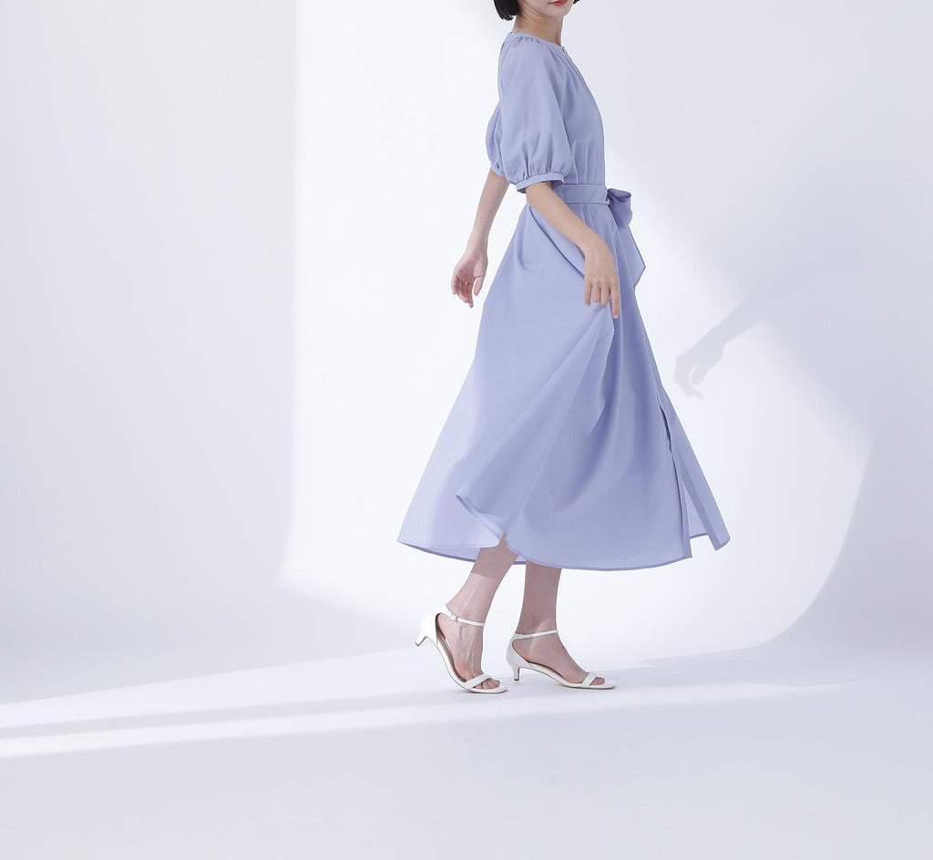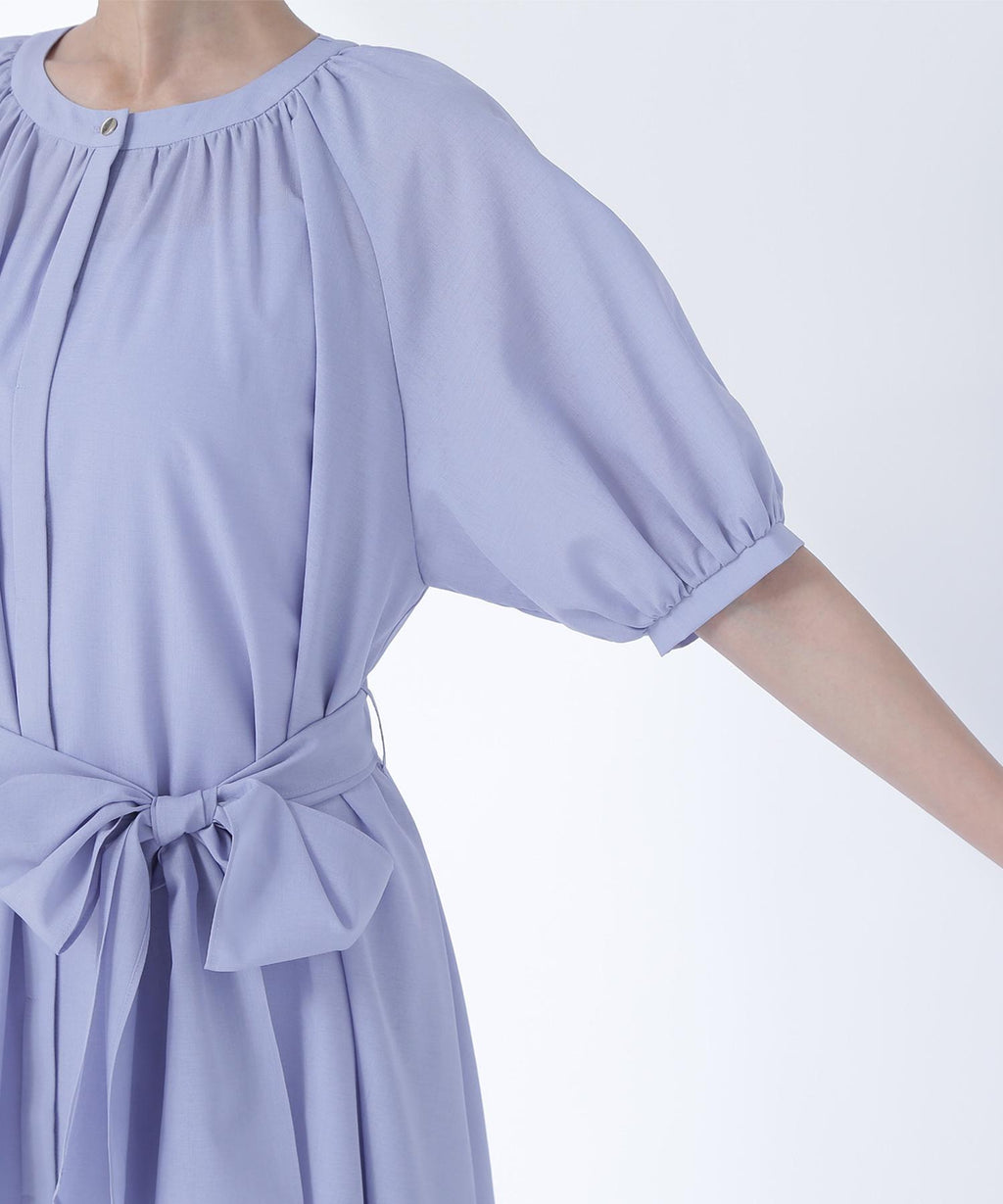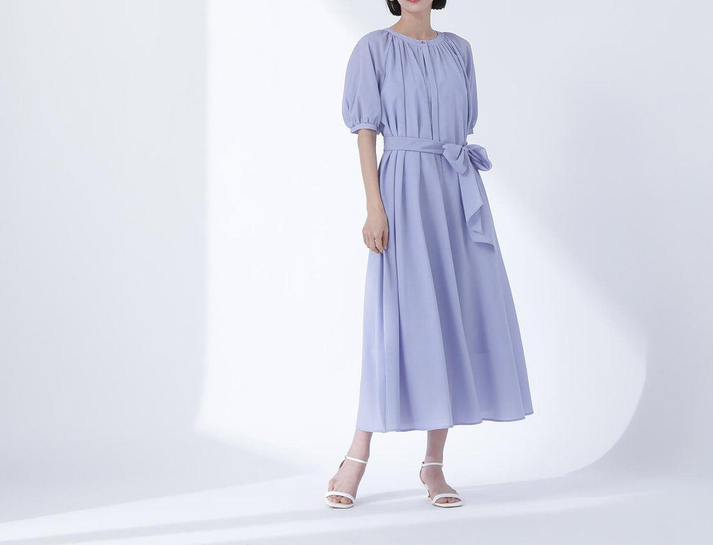 採用透視材質的帶腰帶連衣裙,建議在側面用同色系的絲帶打結來強調腰圍。若將同色系的腰帶取下,也可以作為休閒風格的寬鬆連衣裙穿著。前面採用比翼內扣設計,給人整潔的印象。裙擺寬度充裕,隨著動作輕輕擺動,營造出飄逸的輪廓。附有內搭背心連衣裙。