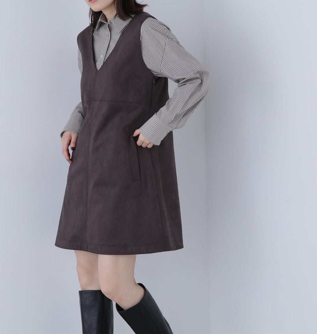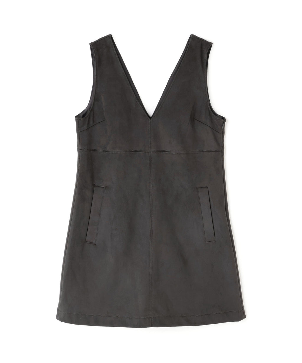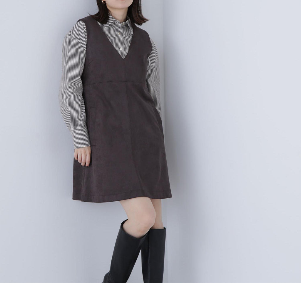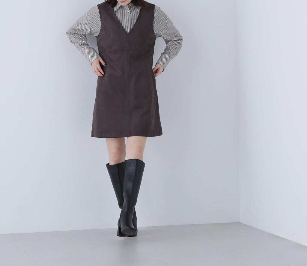 使用具有時尚感的仿麂皮材質製成的迷你裙吊帶裙。採用拼接的縫線細節和方正的輪廓設計。除了搭配長靴外,搭配絲襪或長襪與短靴,也能享受今年流行的搭配風格。