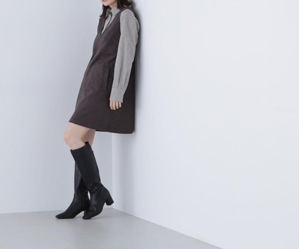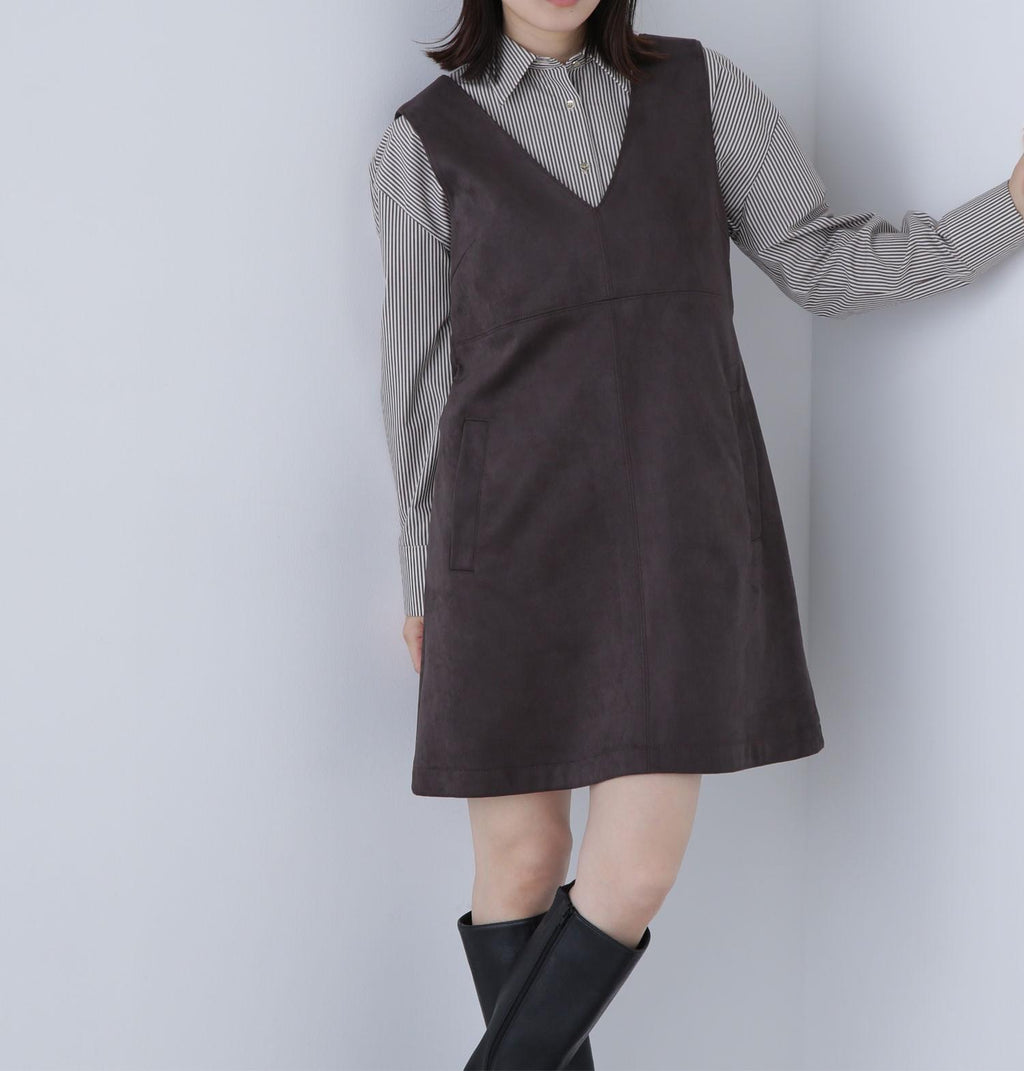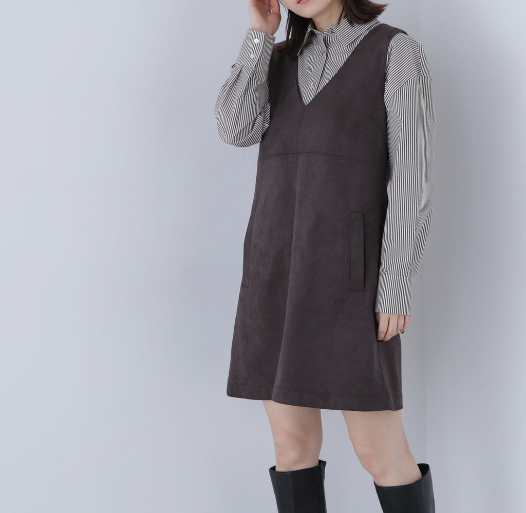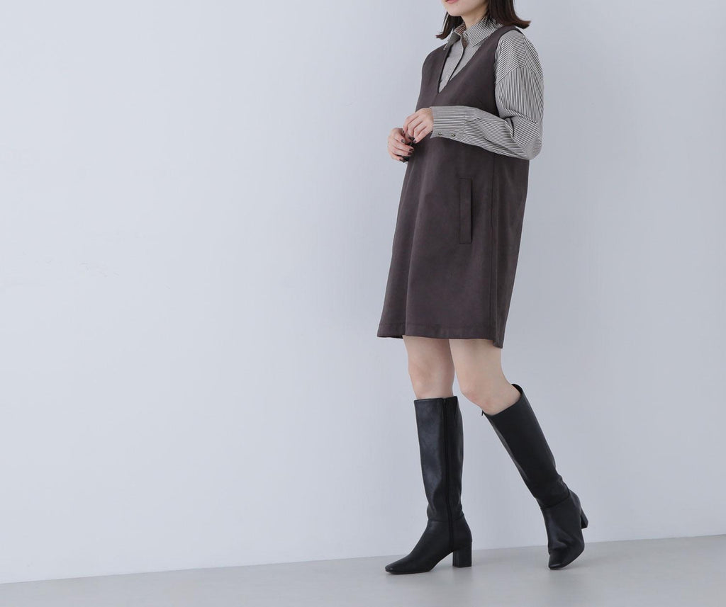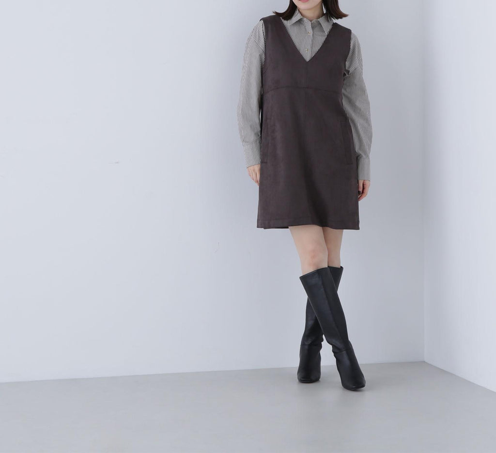 使用具有時尚感的仿麂皮材質製成的迷你裙吊帶裙。採用拼接的縫線細節和方正的輪廓設計。除了搭配長靴外,搭配絲襪或長襪與短靴,也能享受今年流行的搭配風格。