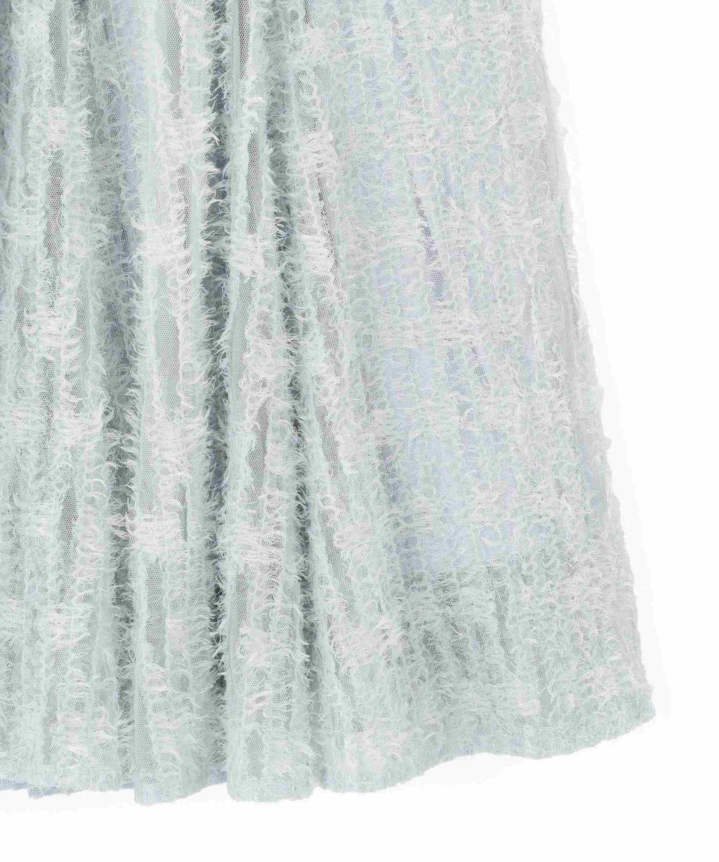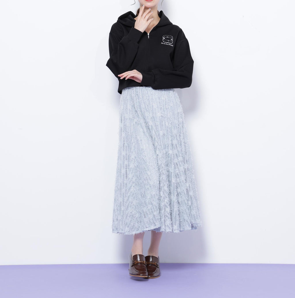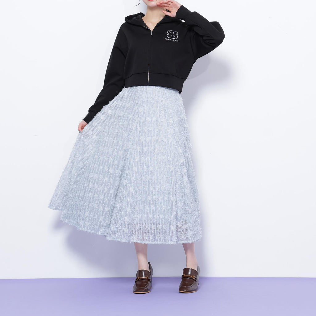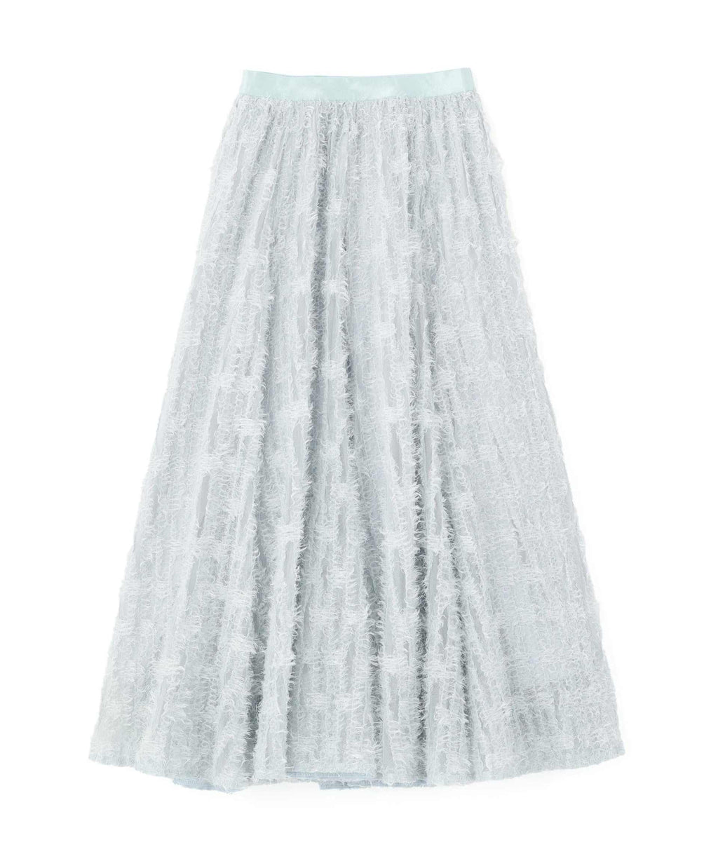 羽毛般立體感的薄紗為搭配增添了輕盈的氛圍。以透光感的薄紗布料為 BASE,具有蓬鬆如羽毛般的表情,是特色。採用具有潮流感的素材,營造出淡淡的秋天氛圍。腰圍採用全圍橡膠設計,穿著舒適不緊繃。腰圍線條簡潔,裙擺則採用層次豐富的戲劇性輪廓,為亮點。※由於拍攝時的照明原因,顏色可能會有所不同。