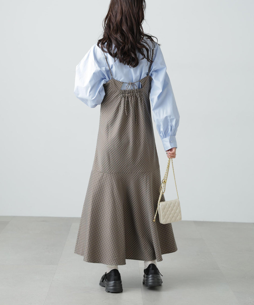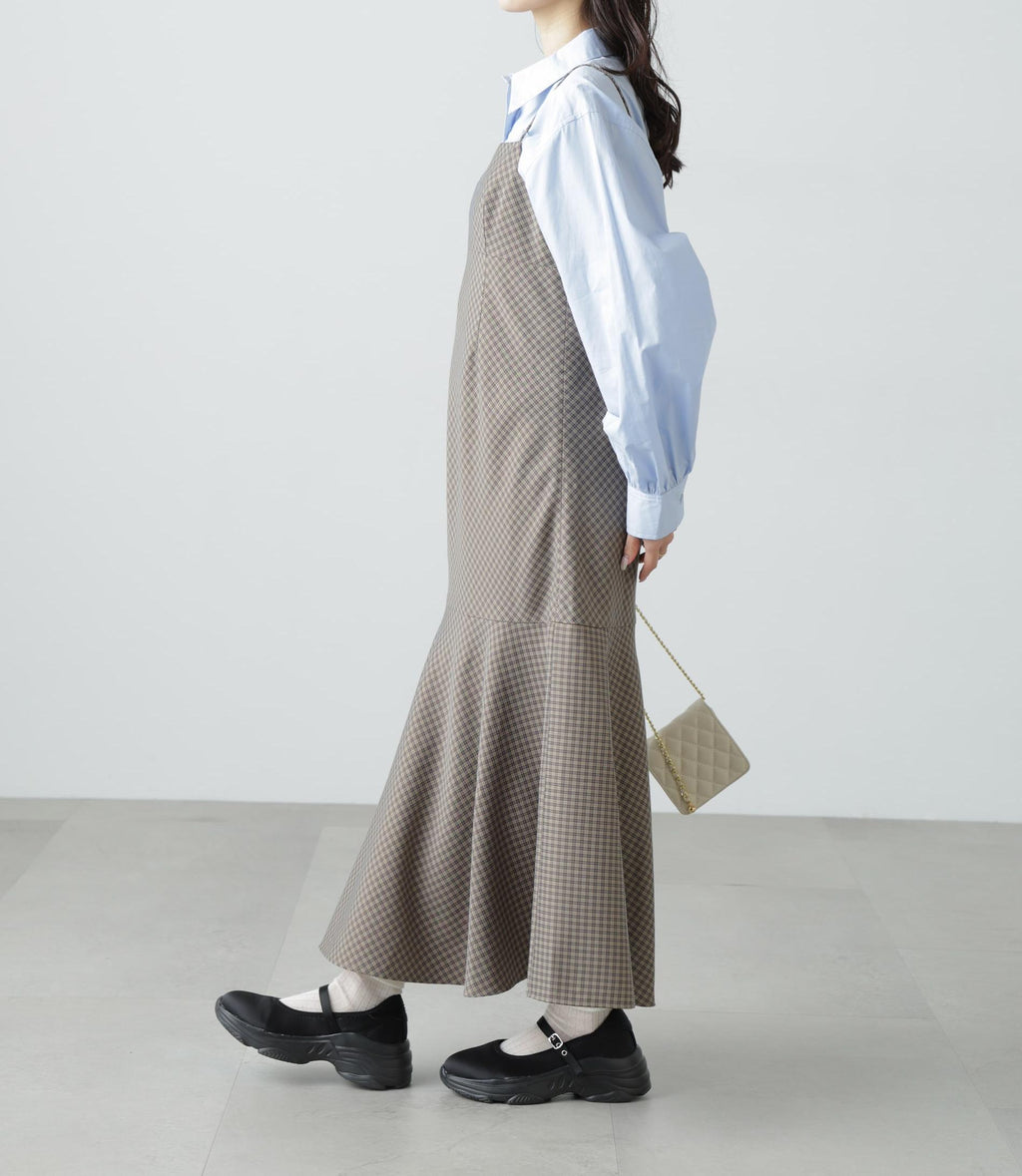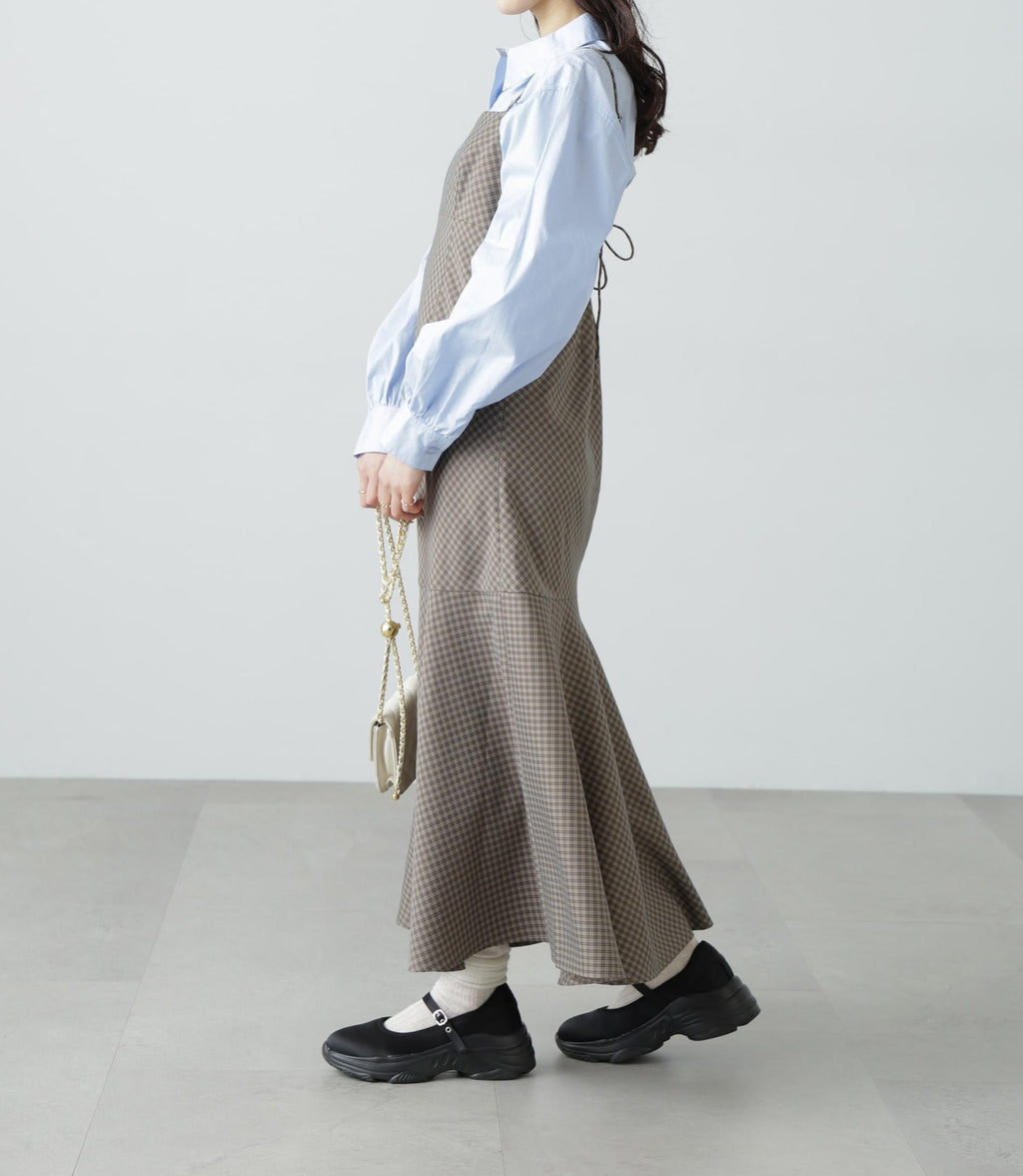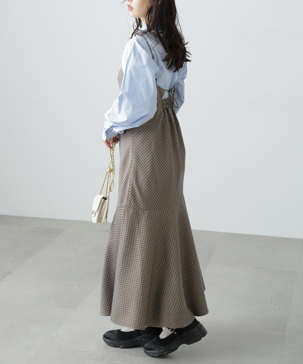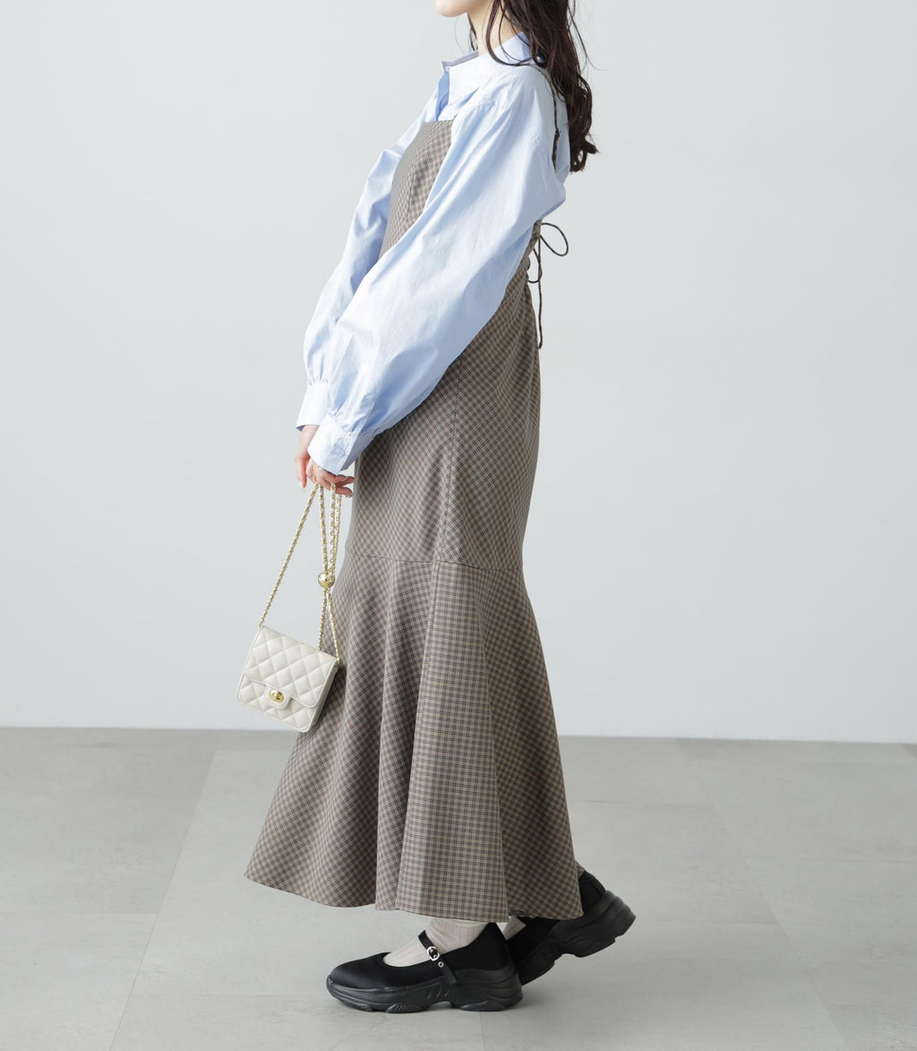 追隨潮流偏見的設計,展現漂亮的輪廓的美人魚背心連衣裙。由於使用了略帶彈性的材質,不會過度貼合身形,且全裏布設計,沒有透光感,一件即可穿著,這點令人高興。背部造型以同色系蝴蝶結作為點綴,後背也不失精緻。側開拉鍊方便穿脫,肩帶和後蝴蝶結的長度可以調節。基本的純黑色當然是推薦款,還有充滿潮流感的休閒格子花紋也很推薦。搭配外套或針織衫的風格,內搭可以是T恤或針織衫層疊穿,根據搭配的單品可以長時間穿著。
