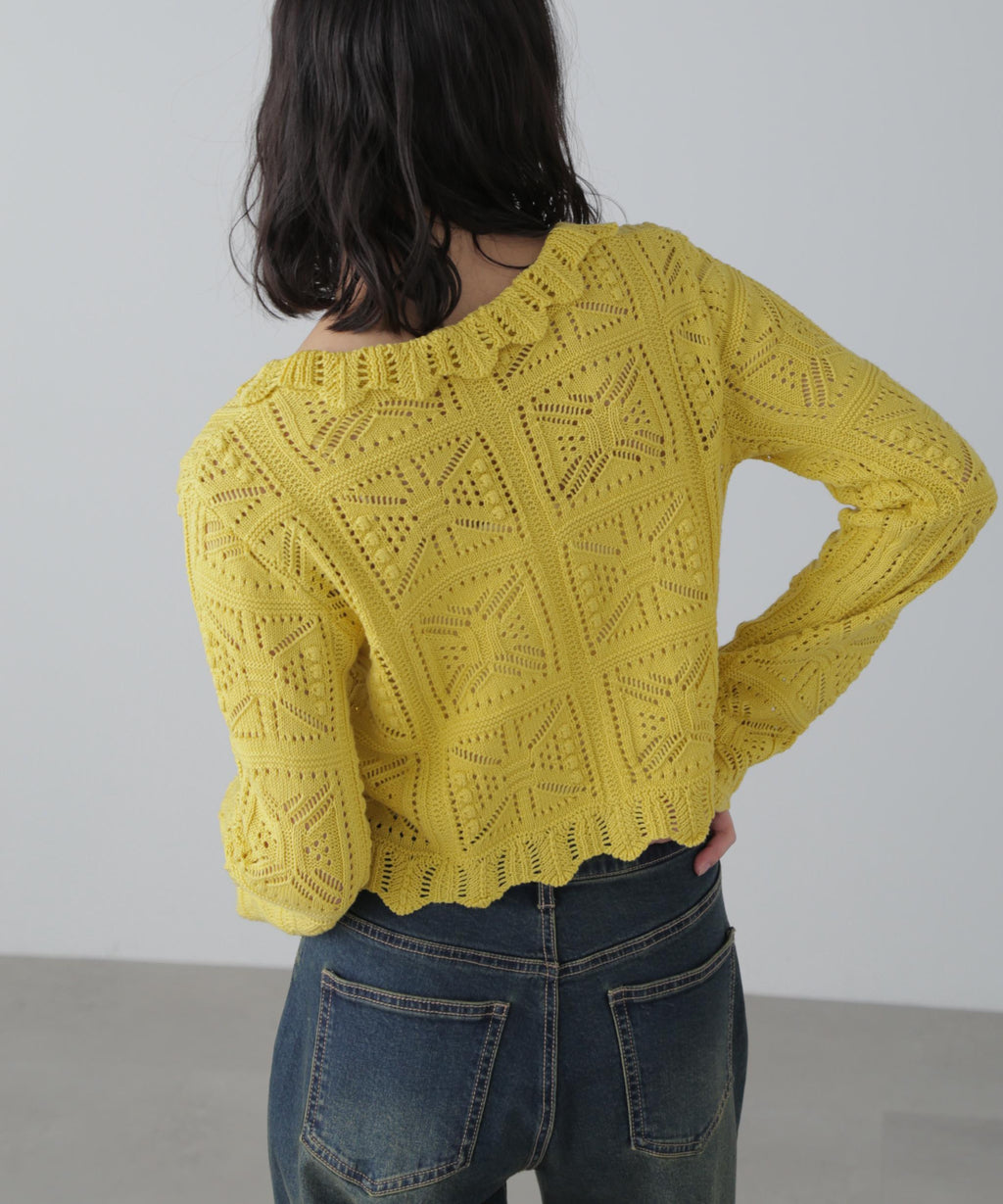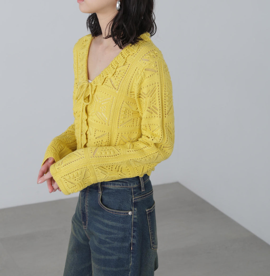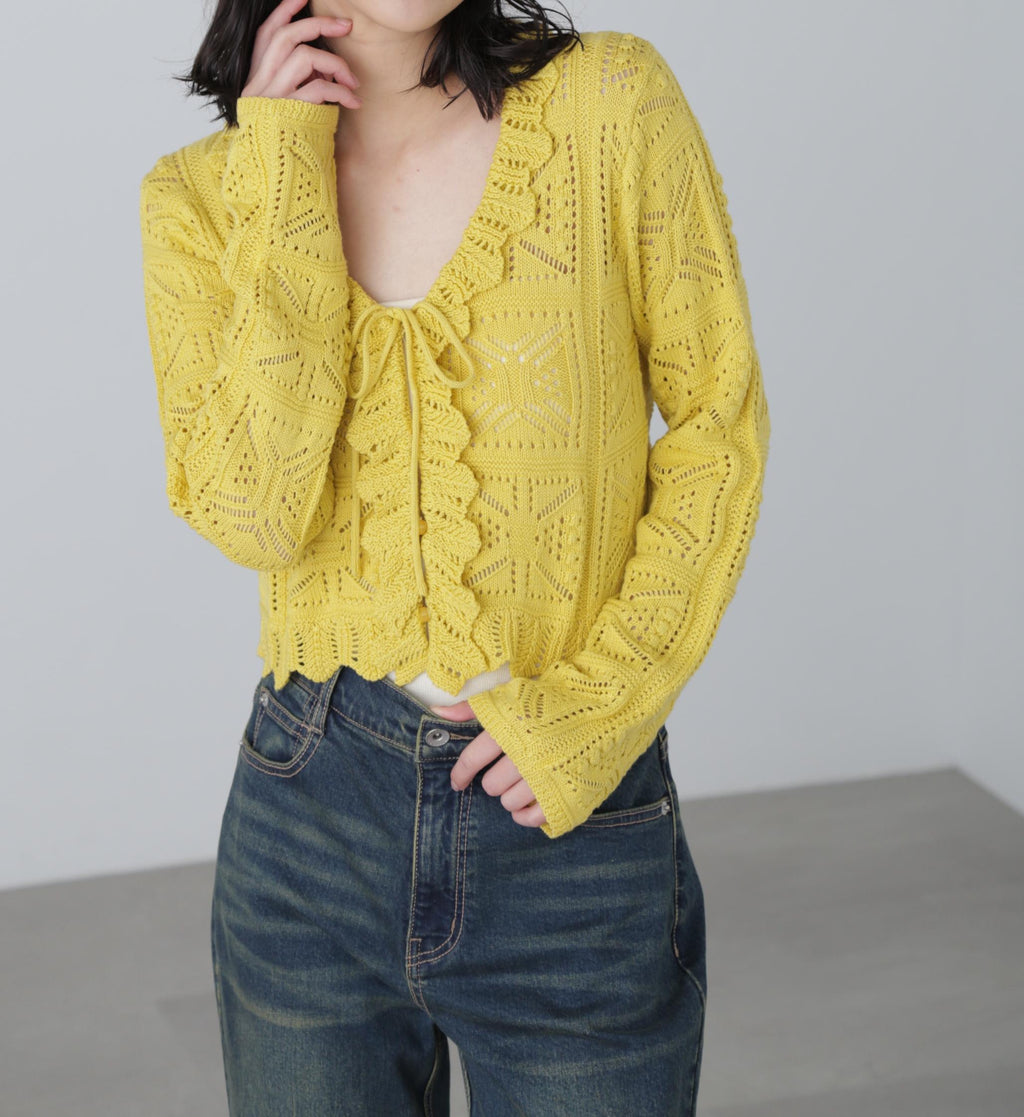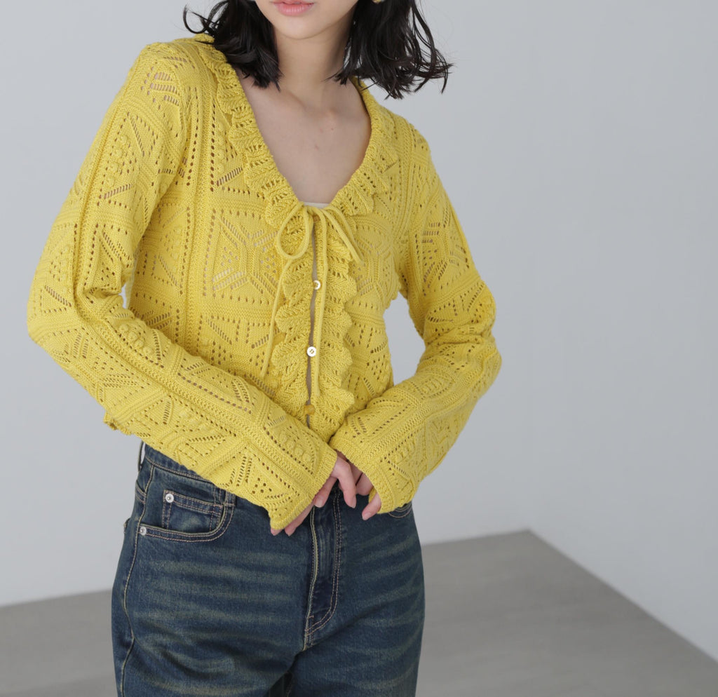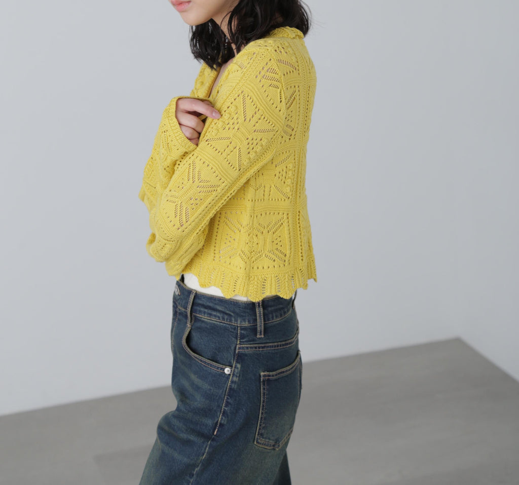 使用棉花和腈綸的休閒風格紗線,採用編有透空感的鉤針風格,具有工藝感的針織開衫。領口加入扇貝邊的荷葉邊裝飾,裙擺也用扇貝邊收邊。前面採用鈕扣設計,最上面配有蝴蝶結作為點綴。短款的長度和較長的袖長是今年的流行平衡。建議搭配吊帶衫或坦克背心與牛仔褲。也可以搭配短褲,享受度假風格。由於適度的透空編織,春季初也可以穿著。